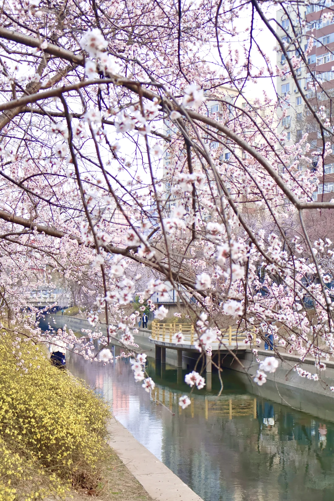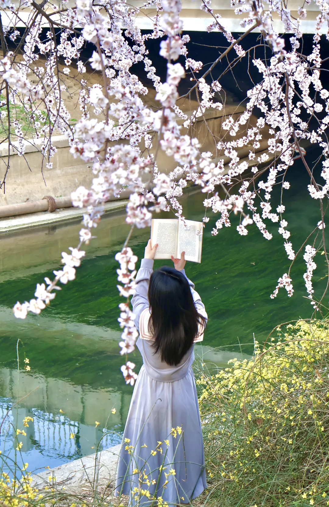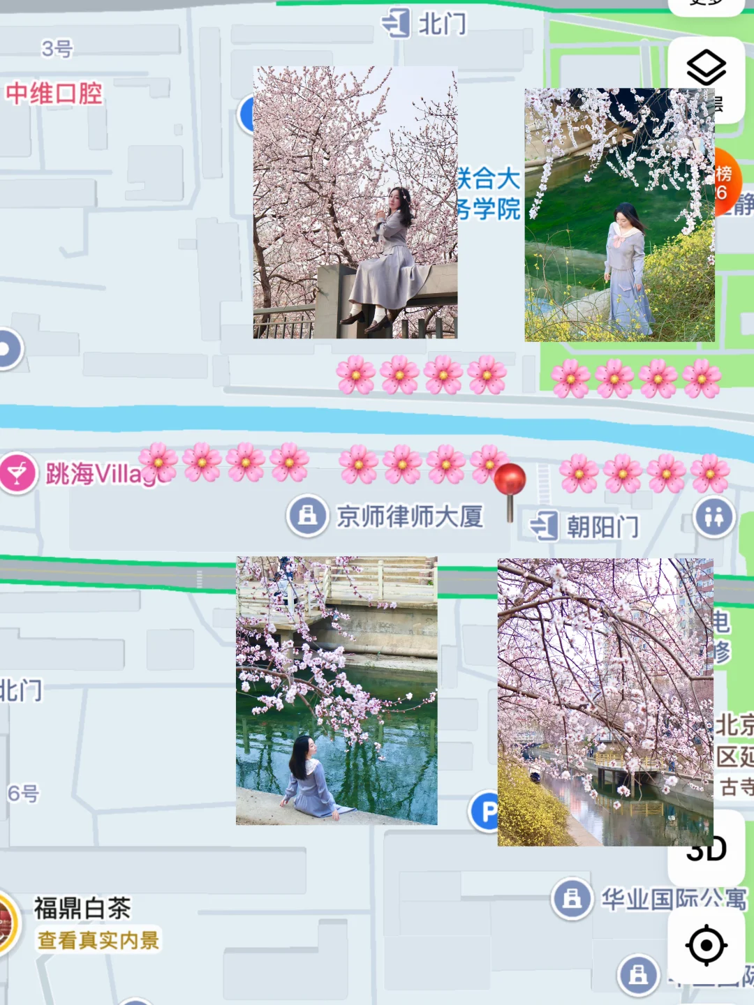 ❷溪水映花俯拍:走到亲水平台,从上往下拍,桃花倒影+流水,意境拉满