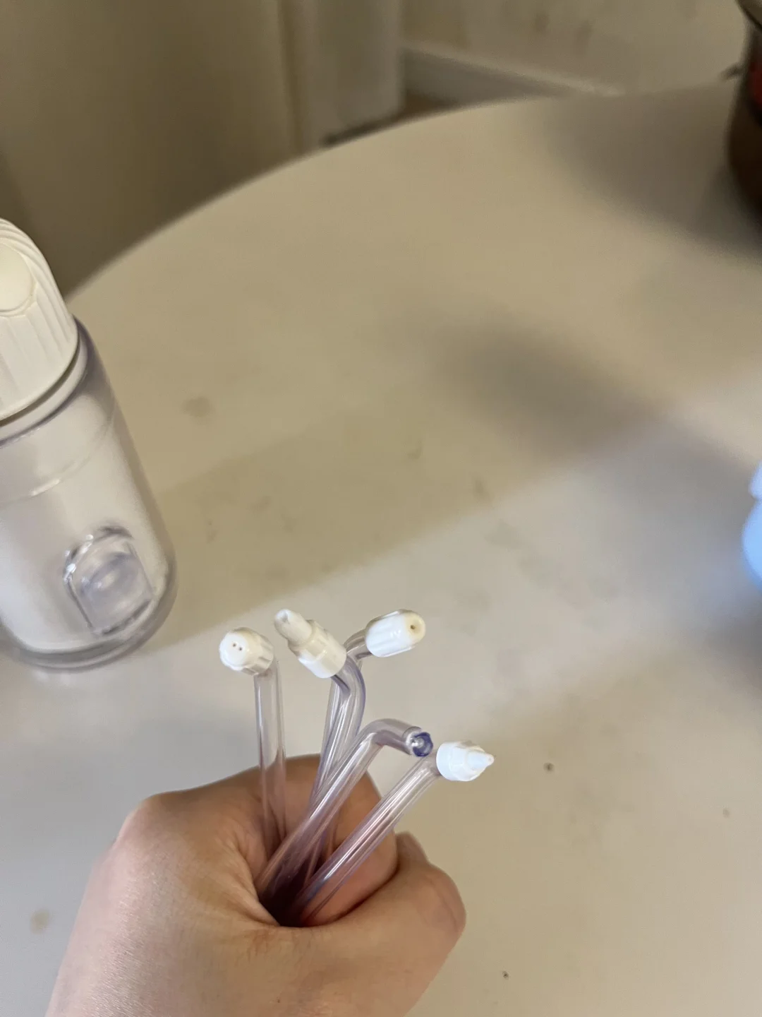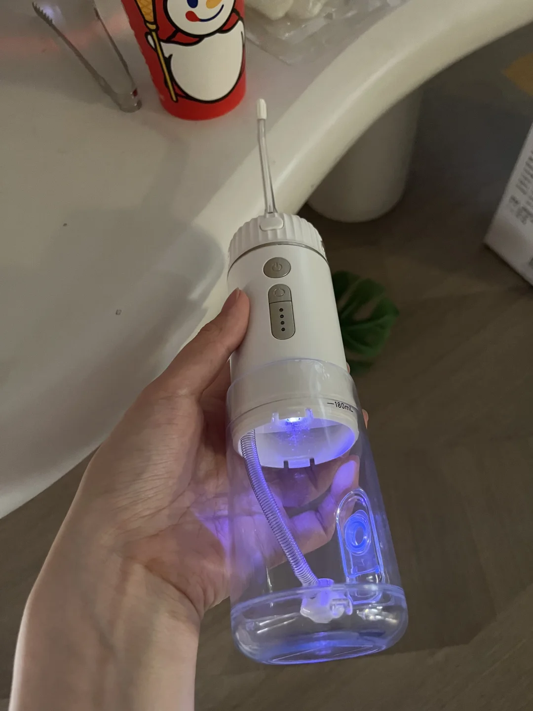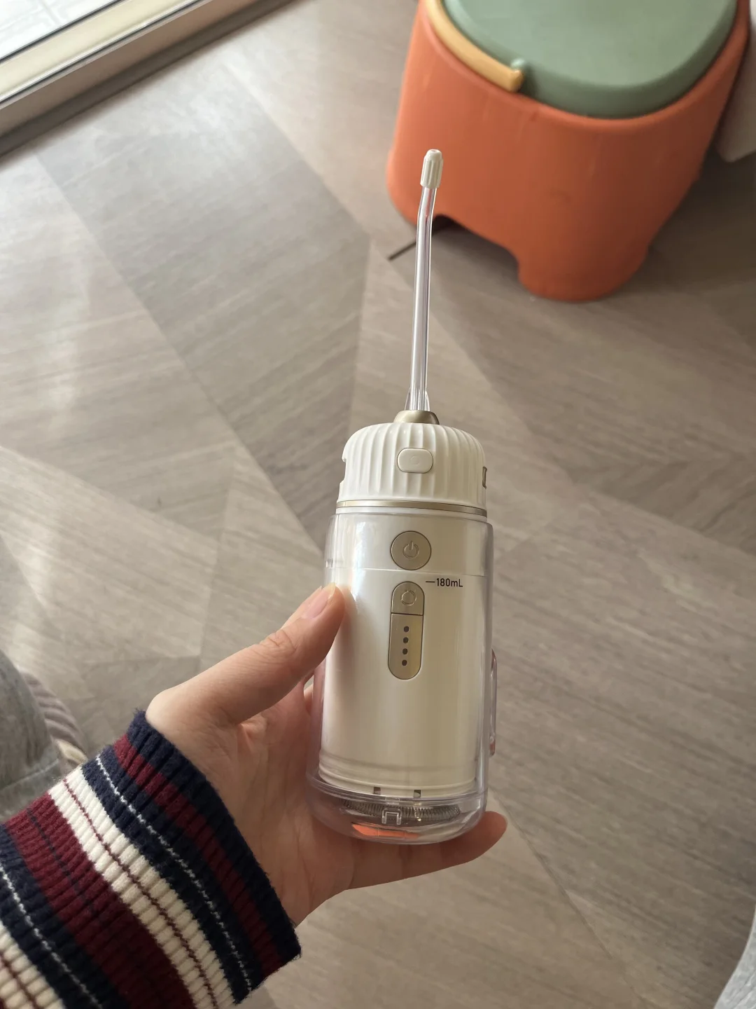(中间)是我现在用的,也是目前为止用到最满意的一款👍🏻有个双线喷嘴很好用,牙缝里的残渣一冲就出来了。还自带了紫光灯,平时用完消杀下就很省心。