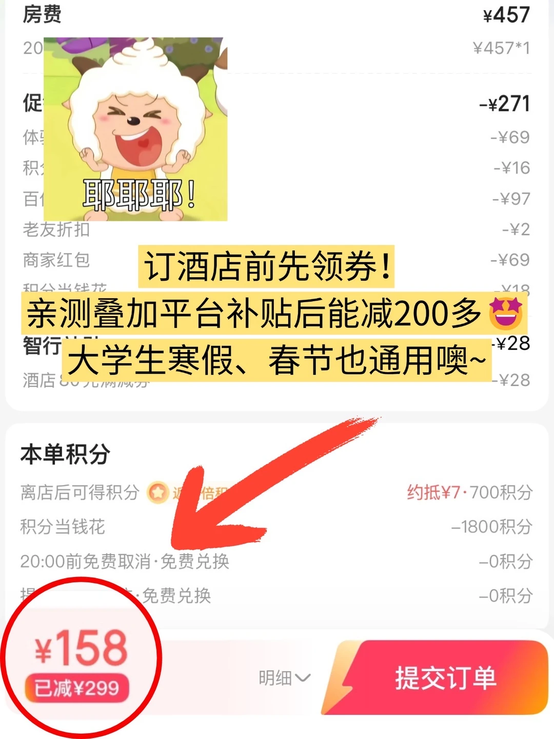 亲测上周住汉庭用券,叠加免费早餐直接省了160+!全季、亚朵、如家这些连锁都能用🤩 连春节热门的古镇民宿都能减,省下的钱刚好能给爸妈买个小礼物!🎁