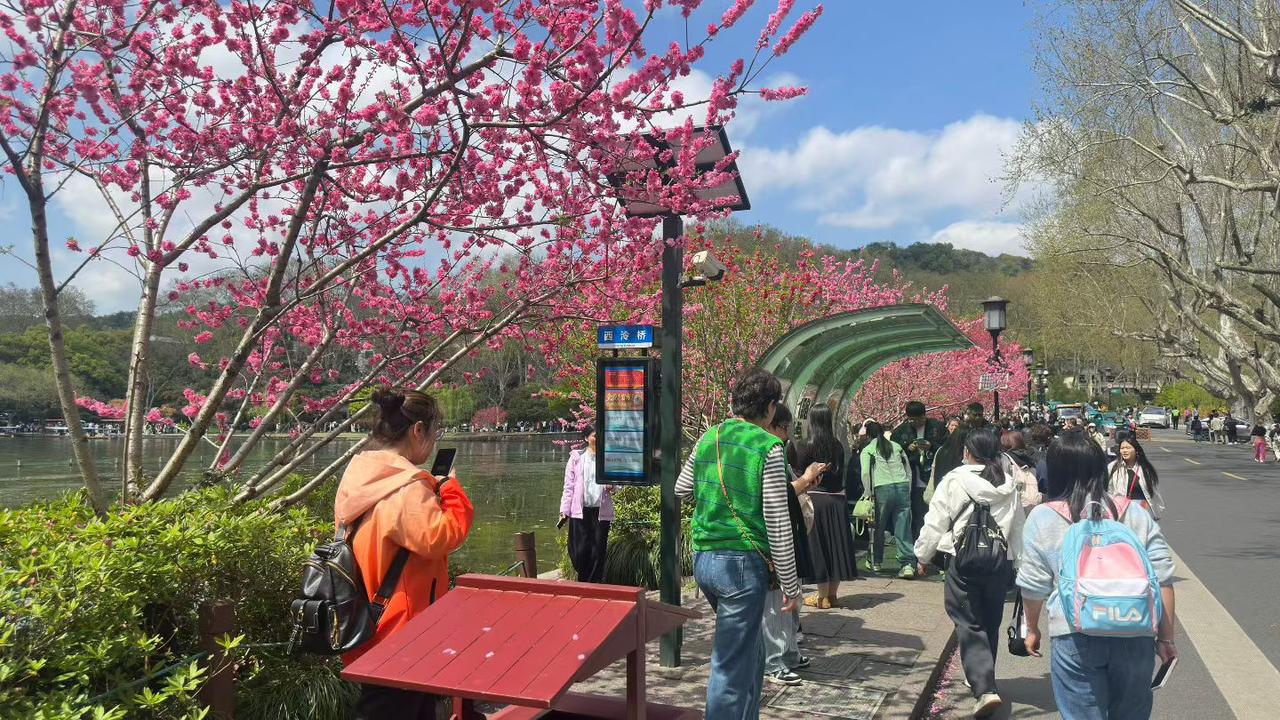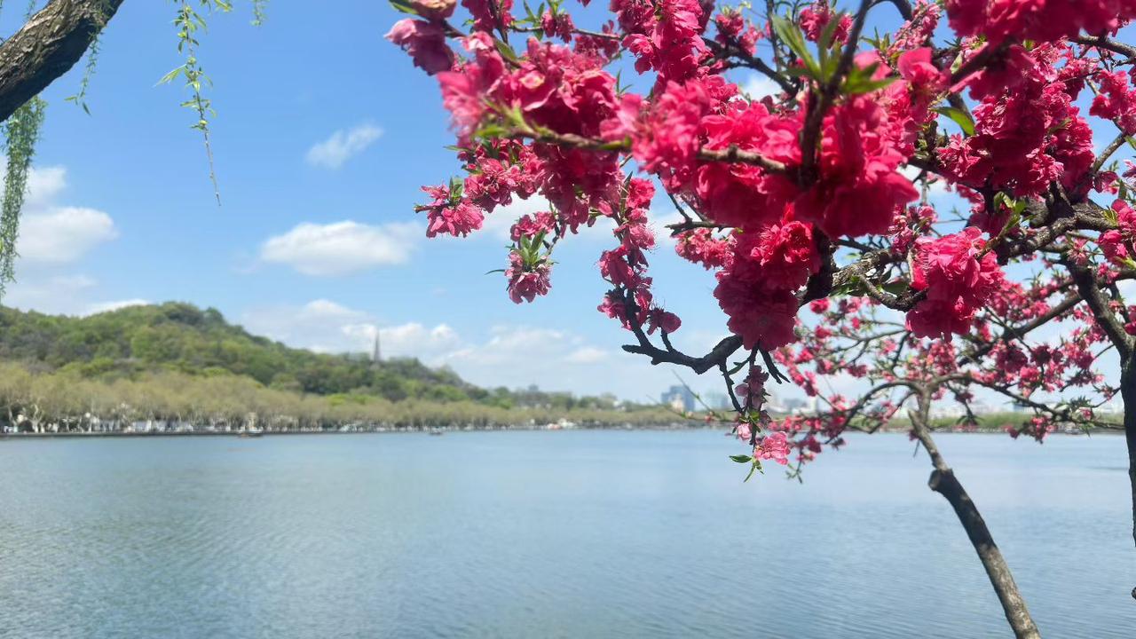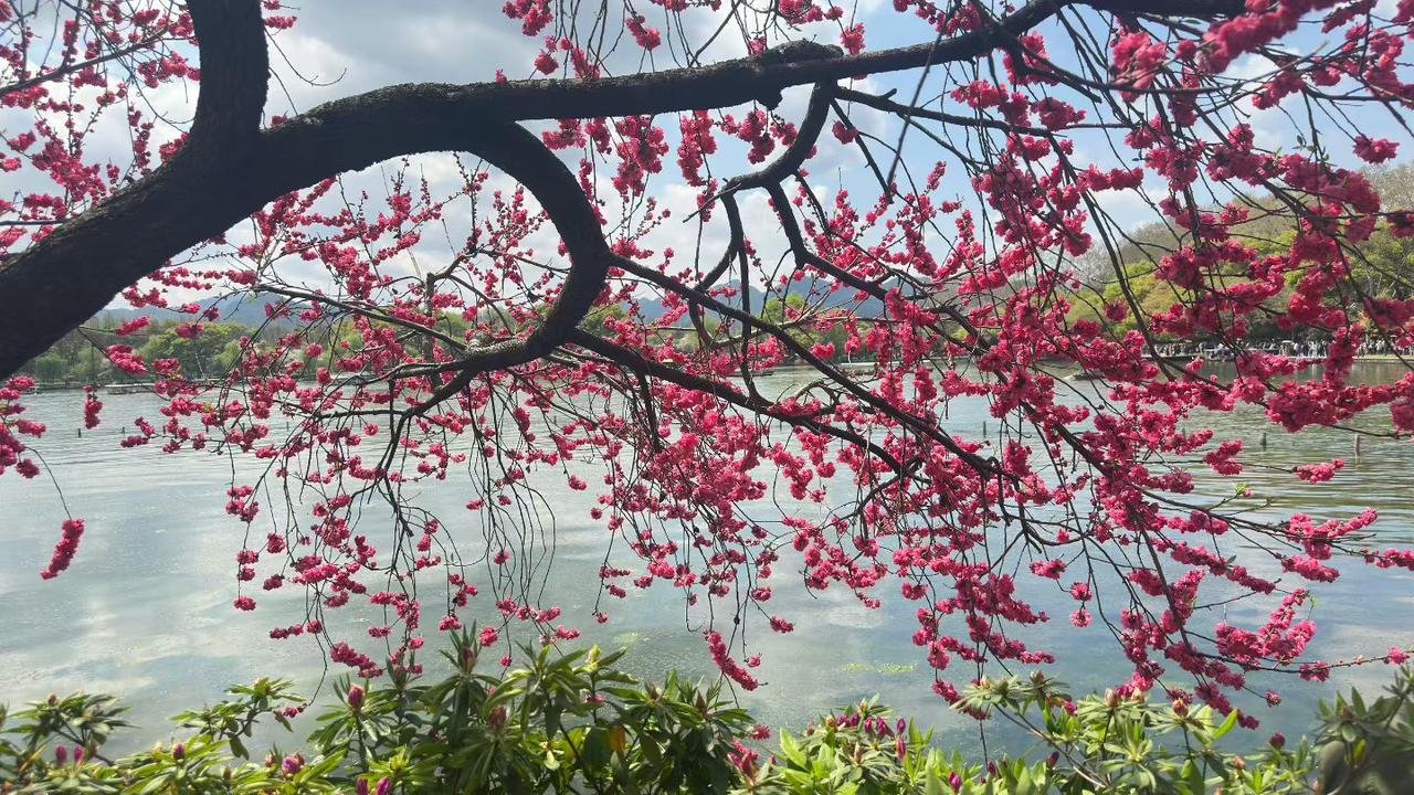 今天终于去孤山抢了几个杭州春天的镜头。以前一直推崇西湖边的粉色桃花,今天在西泠桥边看到几树大红色桃花,突然觉得这色彩也挺适合西湖的春天。因为太太的脚伤,这段时间虽然在杭州,却错失了好多西湖边的春色,今天终于补上。从西泠桥边出发,顺着湖边经过西泠印社、楼外楼、浙江博物馆,到平湖秋月左转,从孤山北麓走回到西泠桥,一路花团锦簇,人流如织,但所到之处极具人间烟尘味,这样快速走一圈,让我充分感受了杭州的春。因为怕塞车,我把小车停在玉泉校区内,打的到西泠桥畔,来的时候比较顺利,但要打的回去,却发现有点难,后来网上叫车,半个小时后才被接上。发九张红色桃花图。陈家建新