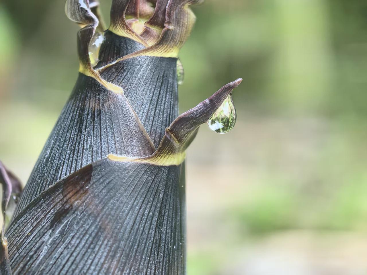 第一张照片:风拂春林,动静相生 这张照片用极具动感的镜头,捕捉了春日园林里最鲜活的生命力。 - 画面构图:两侧浓绿的灌木形成天然画框,将视线引向中心的垂柳与远处的花树,层次分明,纵深感极强。前景的红壤色块像一抹热烈的底色,让整个画面的色彩层次更丰富。 - 光影与动态:最妙的是垂柳的动态虚化,柳条被春风吹得舒展飞扬,用“动”的线条打破了静态园林的沉闷,仿佛能听见风的声音、感受到春日的暖意。背景的粉花、深浅不一的绿意,在风的晕染下更显朦胧柔美,把春天的灵动与生机拉满。 - 意境解读:这不是一张“标准”的风景照,而是用镜头写就的春日诗行。它跳出了对景物的写实记录,用动态感传递出春风拂面的松弛感,让观者仿佛置身其中,感受到春日的鲜活与治愈。 第二张照片:笋尖凝露,微观诗意 这张微距特写,把春日里最微小的生命力,拍出了震撼人心的美感。 - 画面细节:焦点精准落在笋尖的露珠上,春笋的笋壳纹理清晰可见,深褐的底色、嫩黄的镶边,每一道纹路都透着生长的力量。露珠像一颗天然的水晶,不仅折射出背后的绿意,更把春日的湿润与清新具象化,让画面瞬间有了呼吸感。 - 光影与氛围:柔和的自然光打在笋尖,露珠晶莹剔透,背景做了极致的虚化处理,用朦胧的绿意衬托主体,让春笋的生命力成为绝对的主角。画面干净、纯粹,没有一丝冗余,把“雨后春笋”的意境完美呈现。 - 意境解读:这是对春日生命力的微观礼赞。一颗露珠、一截春笋,藏着整个春天的希望与力量。它用极致的特写,让我们看见平凡草木里的盛大生机,读懂“破土而出”的坚韧与美好,满是治愈人心的力量。 整体对比 两张照片一“宏”一“微”,一“动”一“静”,却都精准抓住了春日的灵魂: - 第一张是春日的全景诗,用风的动态写尽园林的生机; - 第二张是春日的微观赋,用露的晶莹定格草木的力量。 都跳出了常规的春日拍摄思路,用独特的视角,把春天拍得有温度、有呼吸、有生命力。