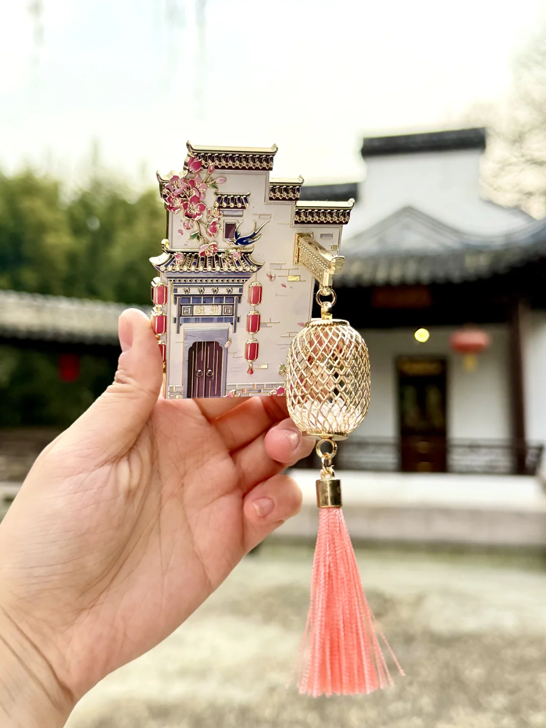 金属镂空灯笼太绝了!白墙黛瓦底座+红灯笼造型,灯笼部分是细腻金属雕花,还挂着小流苏,风一吹轻轻晃,自带“古村挂灯”的烟火气,复古又有质感~