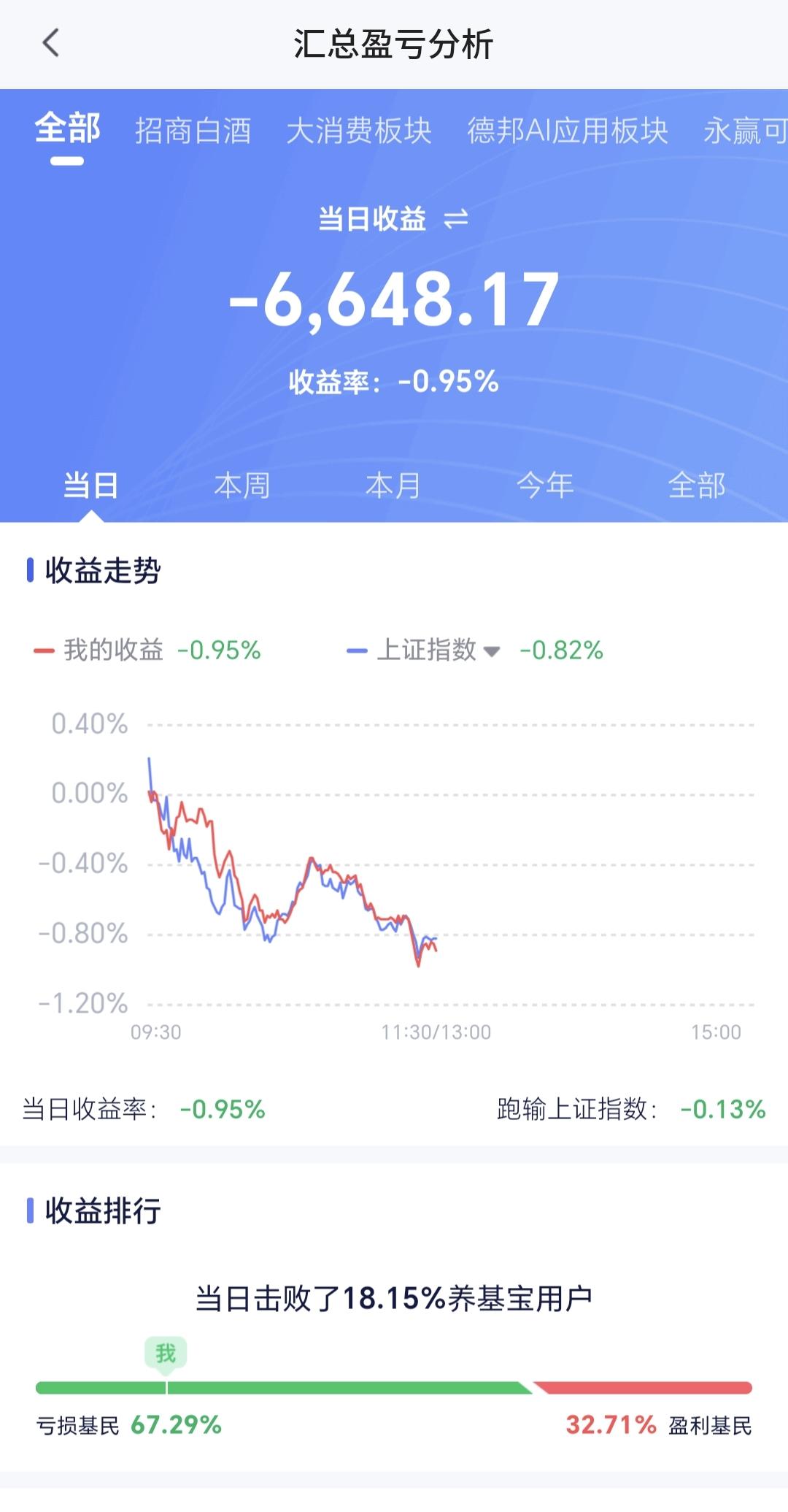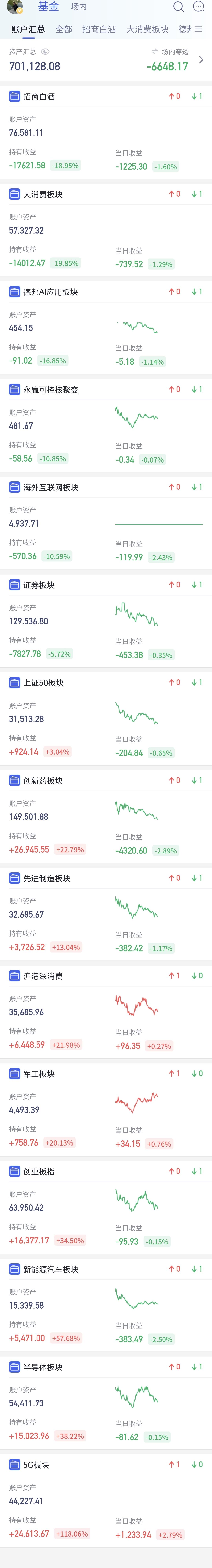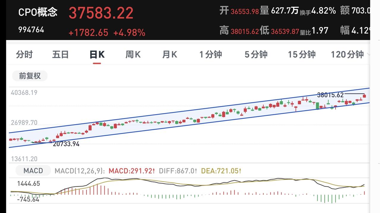 基金:Cpo板块和5G通信板块应该怎么办 今天高开低走,现在三大指数涨跌不一,创业板指小涨,上证指数和深成指小跌,创业板指上涨了0.12%,盘中点位3176点,上证指数下跌了0.71%,盘中点位3891点。 现在黄色线在蓝色线下方,两条线之间的敞口比较大,这样的情况下,指数的翻红难度加大,继续观察两条线的位置会不会有变化,最起码是两条线之间的敞口能不能缩小。 现在五天线的位置是3915点,盘中点位3891点,是在五天线之下的震荡,继续观察能不能站上和站稳五天线,特别是收盘的时候能不能收在五天线之上,今天的压力位置主要看3919点,这个点位与五天线位置的高度差不多。 两市累计成交10157亿,相比于昨天同期缩量了11%,市场上涨802家,下跌4653家,上涨家数少于下跌家数,涨停25家,跌停23家,主力资金净流出210亿。 市场成交量继续萎缩,主要原因是临近过节,大资金不愿意在这个时间入场,节后的成交量会放大,节后的涨跌幅度也会加大,按照这样的成交量,今天的翻红难度也是很大。 整个市场上涨幅度最大的三个板块是:Cpo板块,通信板块,人工智能板块,下跌幅度最大的三个板块是:煤炭板块,农林牧渔板块,光伏板块。 Cpo板块今天大涨,现在盘中估值上涨了3.05%,持有人数在所有板块当中排名第二位。 Cpo板块日线级别处于上涨通道中,今天的上涨来到了上涨通道的上轨线附近,这样的位置,持有的人可以继续持有,但不建议追涨进场。 Cpo板块周线级别也处于上涨通道中,今天上涨以后也来到了周线级别上涨通道的上轨线附近。凡是上涨通道上轨线附近都是可以继续持有,但不建议追涨进场,所以长线持有cpo板块的人在这个地方可以继续持有,但也不建议追涨进场,相反,如果是满仓的人,可以考虑要不要止盈一部分落袋为安。 5G通信板块前几天下跌跌破了日线级别上涨通道的下轨线,今天的上涨又回到了这个上涨通道内,短线持有的人可以继续持有。 5G通信板块周线级别处于上涨通道中,本周的前几天下跌跌破了这个周线级别上涨通道的下轨线,但今天又收回到了这个上涨通道内,前几天的破位是一个假破位,今天只要收盘之前能够保持在这个周线级别上涨通道内,长线持有的人都可以继续持有,但由于距离上涨通道的下轨线比较近,后面要继续观察这个下轨线的得失,如果有效破位,这个上涨通道的下轨线,长线持有的人需要注意风险。 持有的基金中,估值上涨幅度最大的三个板块是:5G板块,沪港深消费板块,军工板块,下跌幅度最大的三个板块是:创新药板块,白酒板块,大消费板块,估值整体亏损了6648元,持有基金的涨跌情况见下面的截图14。 今天是节前的最后一个交易日,大涨大跌的可能性都不大,大概率是一个无效的波动,只要收盘点位在3955点至3852点之间,就是无效的涨跌。 最近一段时间主要盯住3955点就可以了,只要不上涨突破3955点,就存在五浪下跌的可能性,我们就需要耐心等待五浪下跌的结束,确认五浪下跌首先要跌破3852点,然后再观察会不会创3794点新低,见下面的截图15。 我写文章请大家过来欣赏,许多人看了以后,什么痕迹都没有留下,走的时候也是一声不吭,连一个点赞,连一句评论都不会留下,走的是那样的无声无息,这样的人是不地道的,没有做人最起码的准则,我不愿意与这样的人交朋友。 有位朋友留言说,我给你点赞了,但点赞之后,你也没有一个回复,还嫌弃我们不点赞,我要说的是,我是根本没有时间回复,你是一个人点赞,我是要回复所有人,我还要写文章,我还要工作,我还要休息,我还要找机会去啊一下,实在是没有时间回复。 置顶的那篇文章讲的是进场点和离场点,没有看的人可以去看一下,你应该能从中获得收益。