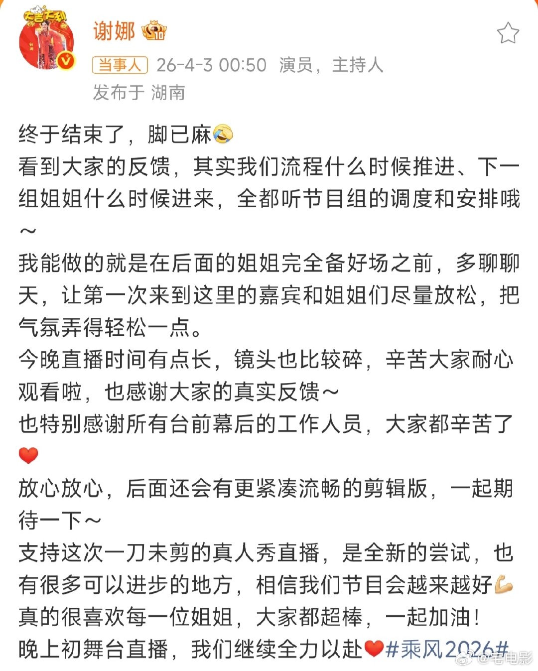 谢娜谢娜说乘风2026还会有流畅剪辑版乘风2026 谁懂谢娜的不易!cue流程、暖情绪,还贴心更博说有剪辑版