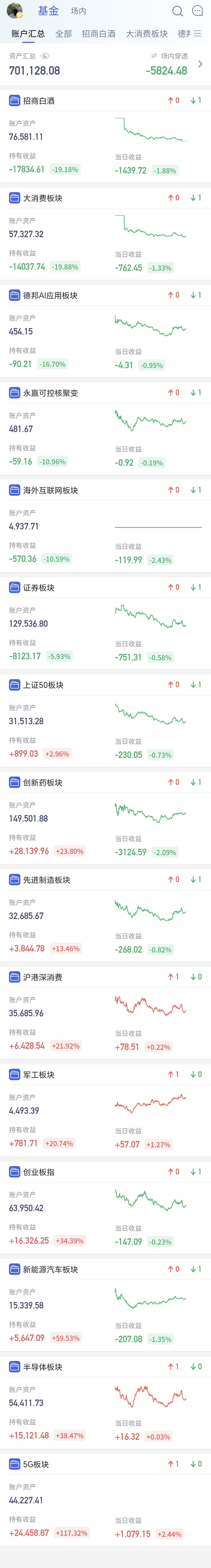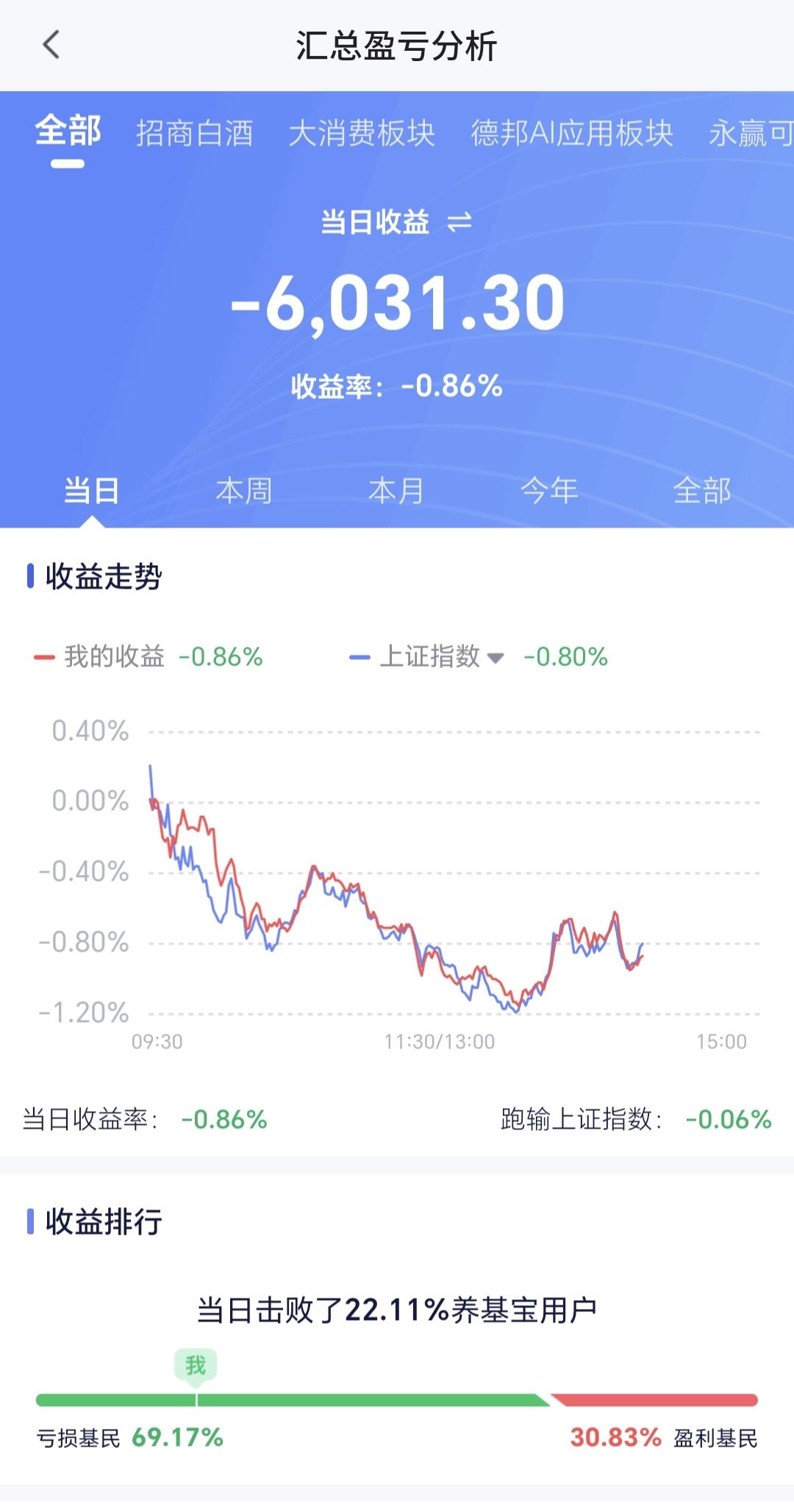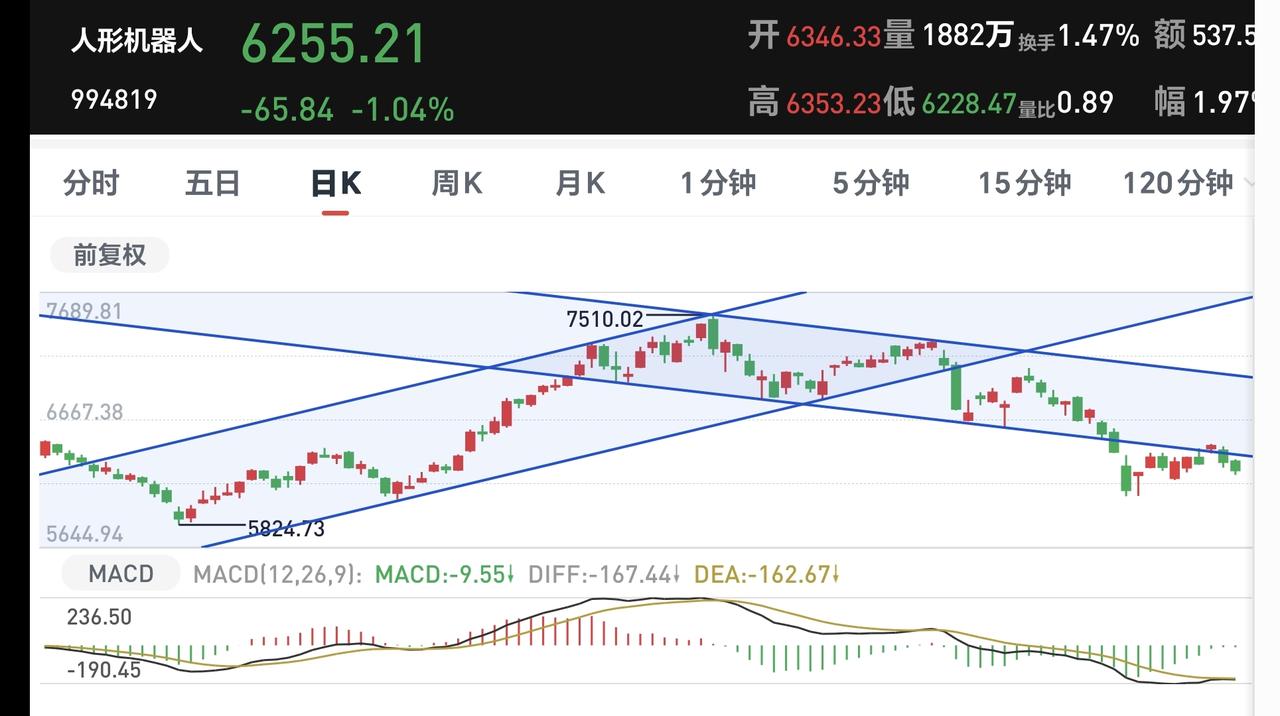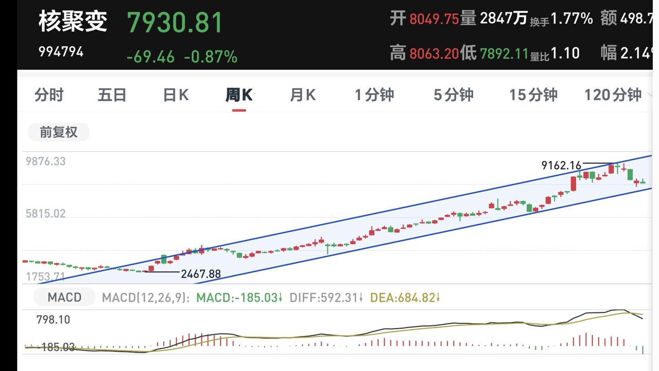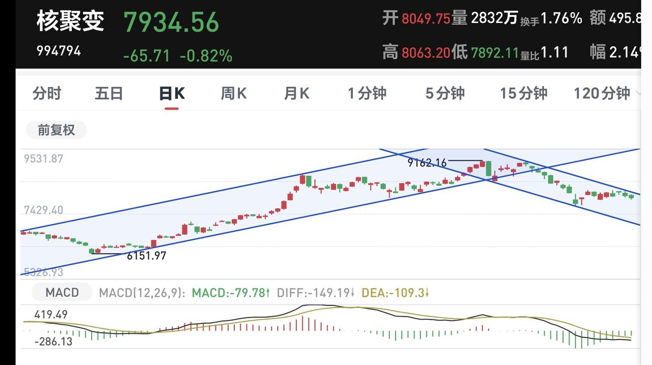 基金:是全线压上,还是谨慎对待 日本和韩国市场今天上涨,日本上涨了1.30%,韩国上涨了2.81%,上涨幅度都不小,香港市场今天休市。 现在三大指数还都是下跌中,但下跌幅度已经缩小,两市累计成交13665亿,相比于昨天同期缩量了11%,市场上涨888家,下跌4567家,上涨家数少于下跌家数,涨停37家,跌停32家,主力资金净流出359亿。 今天的成交量只有16000亿左右,很多人在问这个成交量是不是地量,因为他们认为是地量就会出地价,我认为今天的成交量还不是地价,因为4197点那一天的成交量是3万1600多亿,地量通常是高量的一半左右,也就是16000亿左右,但今天的16000亿并不是一个正常的成交量,因为,今天香港市场休市,没有北向资金,北向资金正常情况下,一天是在1000多亿,所以,今天如果有北向之间的话,今天的成交量应该在18000亿左右,所以今天的成交量不能称之为地量,也就无所谓地价,而且地价与地量并不一定是同一天发生,出现了地量,只是表示距离地价不远了。 整个市场上涨幅度最大的三个板块是:CPO板块,通信板块,人工智能板块,下跌幅度最大的三个板块是:煤炭板块,光伏板块,农林牧渔板块。 持有基金现在盘中估值亏损了6031元,盈利金额最大的三个板块是:5G板块,沪港深消费板块,军工板块,亏损金额最大的三个板块是:创新药板块,白酒板块,大消费板块。 半导体材料设备板块日线级别处于下跌通道中,今天的上涨并没有能够突破这个下跌通道的上轨线,今天的上涨并没有能够改变这个板块日线级别的下跌趋势,短线持有的人继续注意风险。 半导体材料设备板块周线级别处于上涨趋势破位中,上周跌破了周线级别上涨通道的下轨线,本周是在这条下轨线下方震荡,如果确认是有效破位,长线持有的人也需要注意风险。 可控核聚变板块日线级别处于短期下跌通道中,近期都是在这个下跌通道中震荡,短线持有的人需要注意风险,除非上涨突破这个下跌通道的上轨线,再考虑要不要进场。 可控核聚变板块周线级别处于上涨通道中,距离上涨通道的下轨线更近一些,近期观察会不会有效破位这个周线级别上涨通道的下轨线,如果有效破位了这条下轨线,长线持有的人也需要注意风险。 机器人板块日线级别处于短期下跌趋势中,前几天下跌跌破了日线级别短期下跌通道的下轨线,进入了加速下跌走势,短线持有的人需要注意风险。 机器人板块周线级别处于上涨趋势破位中,本周是破位周线级别上涨通道下轨线的第三个星期,处于有效破位当中,长线持有的人需要注意风险。 低空经济板块日线级别处于下跌趋势中,前段时间下跌跌破了日线级别下跌通道的下轨线,进入了加速下跌走势,短线持有的人继续注意风险。 低空经济板块周线级别处于上涨趋势破位中,上周下跌跌破了周线级别上涨通道的下轨线,本周继续在下轨线下方震荡,长线持有的人需要注意风险。 现在指数还是处于无效波动当中,既没有上涨突破3955点,也没有下跌跌破3852点,这就把悬念留给了节后,今天很多人在问要不要进场,这是根据每个人自己的情况来决定的,如果你认为那边的局势会在节后开盘之前平稳下来,甚至是在节后开盘之前就结束,那你今天完全可以全线压上,如果你认为在节后开盘之前还不能结束,还存在许多的不确定性,那你今天就需要谨慎一下。 今天究竟应该怎么办?我会在评论区留言。 大家帮忙评论点赞,转发和分享,谢谢大家的支持。 我写文章请大家过来欣赏,许多人看了以后,什么痕迹都没有留下,走的时候也是一声不吭,连一个点赞,连一句评论都不会留下,走的是那样的无声无息,这样的人是不地道的,没有做人最起码的准则,我不愿意与这样的人交朋友。