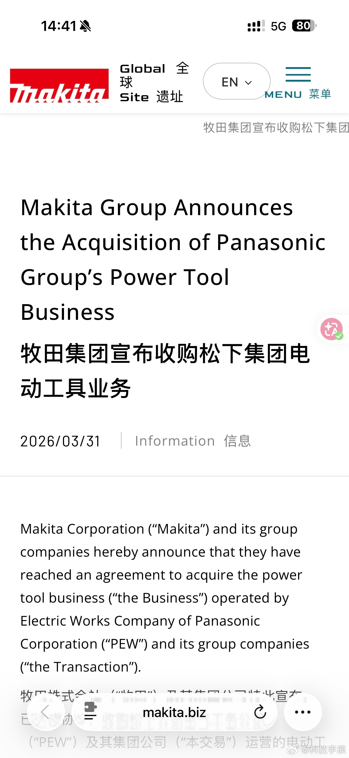 牧田直接把松下的电动工具业务收了。说实话,看到这条消息我愣了一下——两家日系老牌,一个专注专业级,一个家喻户晓,这次整合之后产品线会怎么走?技术下放还是品牌调整?你觉得这对普通用户是好事吗?