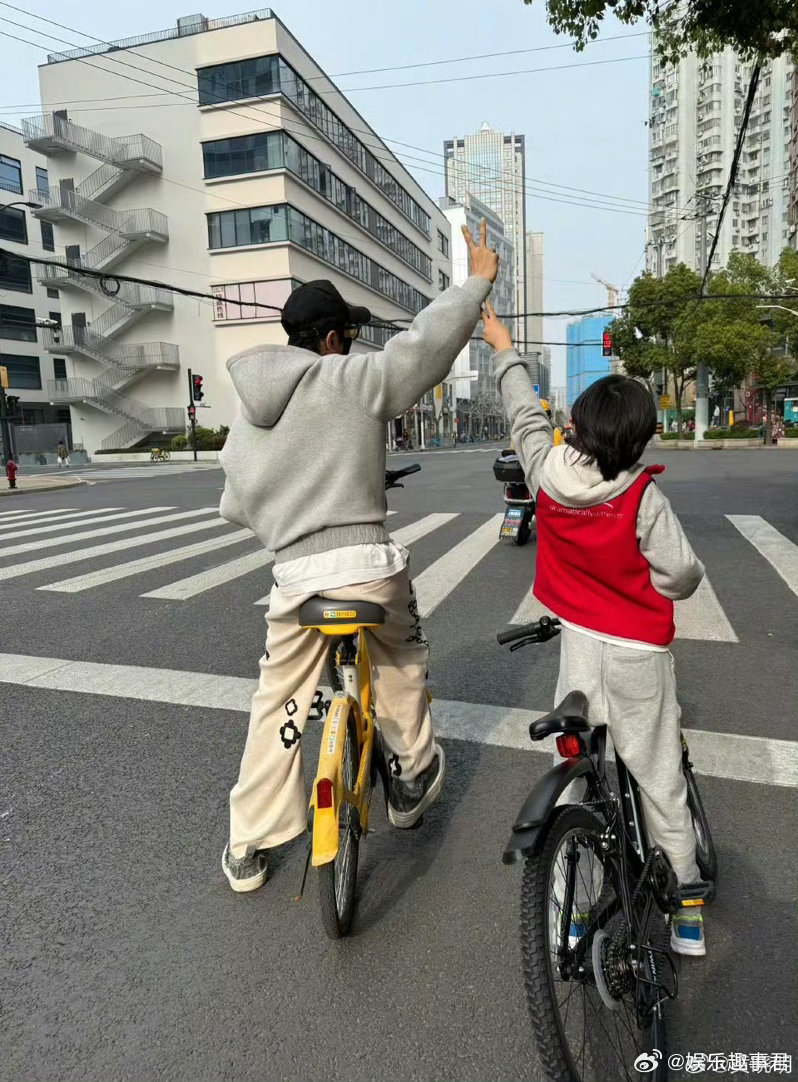 黄晓明晒和儿子春日骑行照黄晓明手提小黄车和儿子小海绵在上海骑行,还和儿子身穿同款浅灰色卫衣。两人沿途击掌、比耶互动。