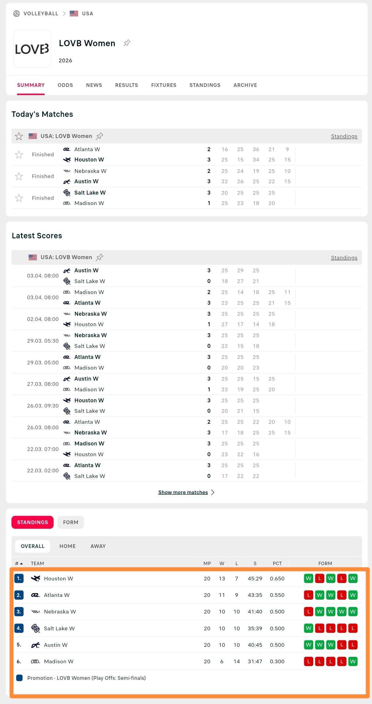 美国LOVB常规赛结束,龚翔宇结束首期留洋 2026年美国LOVB女排职业联赛常规赛最后一轮比赛结束,麦迪逊1-3不敌盐湖城遭遇4连败,比分25-20, 23-25, 18-25, 20-25,龚翔宇27扣8中3失1被拦、4拦1发拿到13分,麦迪逊总战绩6胜14负排名垫底。 常规赛各队最后排名:休斯敦、亚特兰大、内布拉斯加、盐湖城、奥斯汀、麦迪逊。 常规赛前4名进入季后赛,这也意味着龚翔宇在麦迪逊的比赛全部结束。季后赛采用淘汰赛形式,半决赛1v4、2v3,半决赛和决赛均采用两场+金局制。 龚翔宇