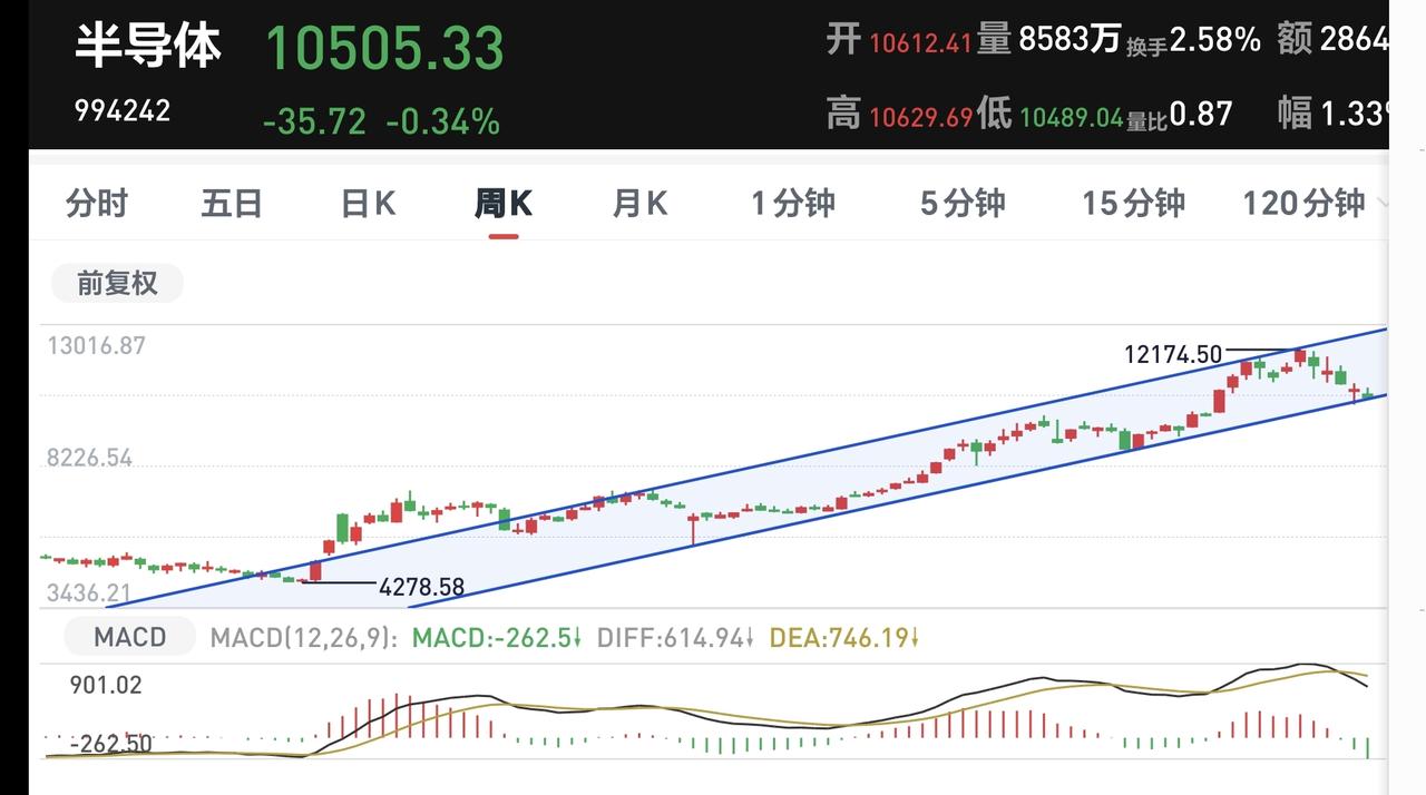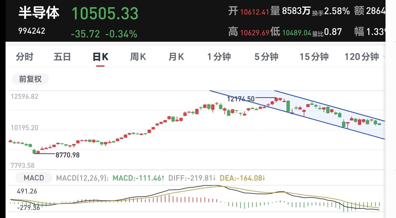 基金:半导体板块应该怎么办 很多人都持有半导体板块基金,这个板块上周五上涨了0.20%,持有人数在所有板块当中排名第九位,散户人数也是不小。 半导体板块近一个月以来下跌了8.62%,近三个月以来下跌了1.25%,近六个月以来下跌了4.21%,近一年以来上涨了41.67%,近三年以来上涨了39.19%,这个板块有38只基金,各只基金的情况见下面的截图7。 半导体板块日线级别处于短期下跌通道中,距离下跌通道的上轨线比较近,近期观察是在上轨线附近遇阻回落,还是会上涨突破这个下跌通道的上轨线,如果是遇阻回落,短线的人需要继续注意风险,如果上涨有效突破这条上轨线,短线的人可以考虑要不要进场。 半导体板块周线级别处于上涨通道中,距离上涨通道的下轨线比较近,近期观察是在上涨通道下轨线附近反弹,还是会下跌跌破这个上涨通道的下轨线,如果是在这里进行反弹,长线持有的人可以继续持有,如果是有效跌破上涨通道的下轨线,长线持有的人需要注意风险。 半导体板块后面一段时间的走势很重要,短线持有的人和长线持有的人都需要密切注意,日线级别因为处于下跌通道的上轨线附近,遇阻回落的概率会大一些,周线级别因为处于上涨通道的下轨线附近,触底反弹的概率会大一些,由于小方向要符合大方向,日线级别要服从于周线级别,在日线级别向下,周线级别向上的情况之下,我们暂时先把它看作为向上的概率大,大概率的情况之下会是一个震荡偏向上走势,但这些都是我们的预估,我们的操作不根据预估的走势来进行,我们的操作是根据实际走势来确定。 半导体板块基金我持有54365元,持有收益15054元,持有收益率38.31%,累计收益160022元,每天定投10块钱,这只基金全部都是利润在里面飞。 经历过多次止盈之后,大部分基金都可以保持利润在里面飞,然后是等待一个相对确定性的低位区域进场,进行新一轮的筹码捞取,进行新一轮资金的增值,所有这些都需要有充分的耐心,这个过程有可能需要几年,这几年的过程当中,有可能有很大的时间段是处于亏损状态,亏损状态的时候你不能考虑要不要割肉离场,在亏损状态的时候你考虑的是要不要加大定投的额度,甚至是要不要手动进场捞取便宜筹码,只有足够多的便宜筹码,才能让你将来满嘴流油,只有足够多的便宜筹码,才能让你将来盆满钵满,半导体板块现在就处于耐心等待的过程当中。 我写文章请大家过来欣赏,许多人看了以后,什么痕迹都没有留下,走的时候也是一声不吭,连一个点赞,连一句评论都不会留下,走的是那样的无声无息,这样的人是不地道的,没有做人最起码的准则,我不愿意与这样的人交朋友。