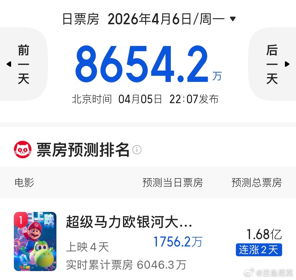 《超级马力欧》第二部预测票房1.68亿,与第一部基本持平(第一部内地票房1.71亿)。