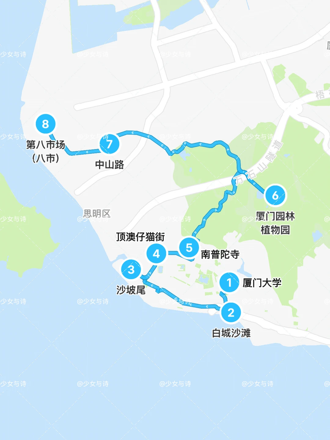 🗺️路线:厦门大学👉白城沙滩👉沙坡尾👉顶澳仔猫街👉南普陀寺👉厦门园林植物园👉中山路👉第八市场