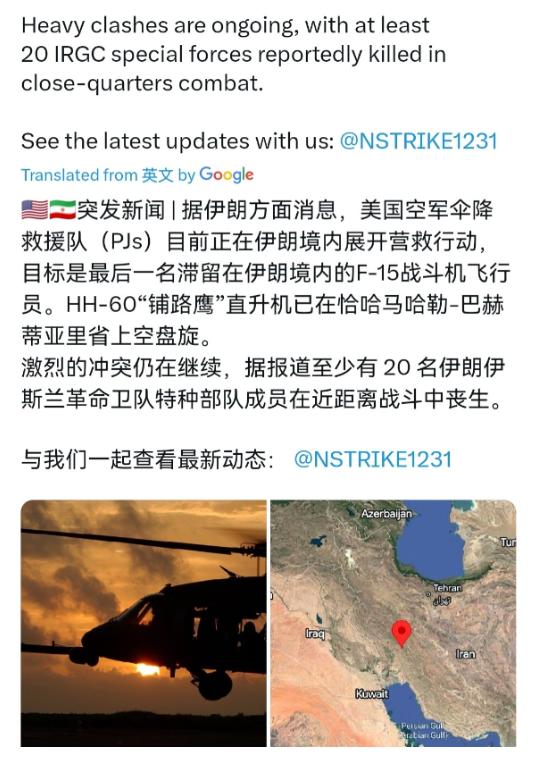遭遇美国特种部队,伊朗革命卫队死战不退!超过 20 名革命卫队成员战死!4 月 5 日,外媒报道称,美国空军伞降救援队员(PJ)正在伊朗境内展开行动,营救 F-15 战机的一名幸存飞行员。 从2026年2月28日开始,美国和以色列就联手对伊朗发动了军事行动,到4月5日这一天,双方的战事已经持续了37天。美军一开始仗着海空优势狂轰滥炸,还放话说已经摧毁了伊朗的防空系统、掌握了制空权,结果转头就被狠狠打了脸。 4月3日,伊朗用自己研发的“霍尔达德-15”防空系统,一天之内就击落了美军一架F-15E战斗机和一架A-10攻击机,这次要营救的,就是那架被击落F-15E上的幸存飞行员。 美国这边倒是挺会给自己脸上贴金,特朗普在社交媒体上把这次营救行动吹成“美国历史上最大胆的搜救行动之一”,还说飞行员已经平安获救。 可实际上呢,这场营救就是一场赔本买卖,美军付出的代价大到超乎想象,而伊朗革命卫队的死战不退,更是让美军的嚣张气焰被狠狠浇了一盆冷水。 其实在4月2日,伊朗高层就已经放了狠话。伊朗军队总司令阿米尔·哈塔米直接下命令,只要美军踏入伊朗领土,就不允许任何一人生还;革命卫队总司令侯赛因·萨拉米说得更直接,敢进来就全部消灭。 而伊朗革命卫队也确实是真的说到做到。4月5日美军PJ队员伞降进入伊朗境内后,刚展开营救,就被早已布防的革命卫队盯上了,双方瞬间爆发激烈交火。 当时伊朗的搜捕人员已经离飞行员藏身的山岩缝隙不到3公里,美军被逼得没办法,只能在近距离内多次搞“定点火力清除”,可即便这样,革命卫队也没有丝毫退缩。 他们靠着本土地形优势,在扎格罗斯山脉的复杂地形里与美军周旋,明知美军装备更先进,明知可能会付出生命代价,还是死战到底,最终超过20名革命卫队成员倒在了战场上,用牺牲换来了对国土的守护。 反观美军,看似完成了营救任务,实则损失惨重到肉疼。根据伊朗官方发布的消息,他们在这次行动中击落了美军两架“黑鹰”直升机和一架C-130运输机,还找到了被击落F-15E的弹射座椅残骸。 更讽刺的是,美军还有两架C-130运输机在临时着陆点接应时,被革命卫队的重火力伏击,起降系统被打坏,根本没法起飞。为了防止机上的先进设备被伊朗缴获,美军只能自己动手,把这两架运输机彻底炸掉。 不算不知道,一算吓一跳。一架C-130运输机的成本就高达1.14亿到1.2亿美元,两架就是2.3亿多美元;加上被击落的F-15E战斗机(造价8000万美元)、被击中坠毁的A-10攻击机(3000万美元),还有两架受损严重可能报废的HH-60W/G搜救直升机(合计超1亿美元),美军这一次营救行动,光飞机损失就超过了4亿美元,堪称赔本赚吆喝。 而且美军为了这次营救,可谓是倾尽全力,中情局全程参与,还特意散布假消息,说已经找到飞行员并正在转移,想分散伊朗的注意力。 可伊朗革命卫队根本不上当,一边派兵搜捕,一边用火力拦截美军战机,硬生生让美军的计划处处受阻。说白了,美国就是仗着自己军事实力强,想强行闯入伊朗领土逞威风,却没想到碰到了硬骨头。 就在营救行动当天,特朗普还在放狠话,威胁伊朗4月7日前不达成协议,就轰炸伊朗的发电厂和桥梁,还说要“炸毁一切并夺取石油”。 可伊朗压根不吃这一套,最高领袖穆杰塔巴·哈梅内伊直接表态,要继续封锁霍尔木兹海峡这个战略杠杆,革命卫队海军也说要在波斯湾建立“新秩序”,明摆着就是要跟美国硬刚到底。 伊朗人之所以这么硬气,不只是因为高层的强硬指令,更因为全国上下的团结。自从战事爆发后,德黑兰、伊斯法罕等主要城市的征兵点,有700多万人主动报名参军,每个人都抱着保卫祖国的决心。 他们清楚,美军入侵的目的就是为了控制中东、掠夺资源,一旦妥协,只会迎来更残酷的压迫,所以哪怕付出牺牲,也要死战不退。 这场交火,看似是美军营救飞行员的小规模行动,实则是美伊对峙的缩影。美国总想靠着霸权主义横行霸道,以为随便派支特种部队就能在别的国家为所欲为,却没想到伊朗革命卫队用死战不退的决心,给他们上了生动的一课——国土神圣不可侵犯,不管对手多强大,只要全民一心、奋勇抵抗,就没有打不赢的仗。 那些战死的革命卫队成员,用生命诠释了什么是家国情怀,他们没有白牺牲,不仅让美军付出了惨痛代价,更让全世界看到了伊朗人民捍卫国家主权的坚定决心。 而美国呢,看似赢了营救,实则输得一塌糊涂,既赔了巨额装备,又暴露了自己霸权主义的真面目,估计到最后也没明白,为什么明明装备更先进,却拿一个誓死抵抗的国家没办法。