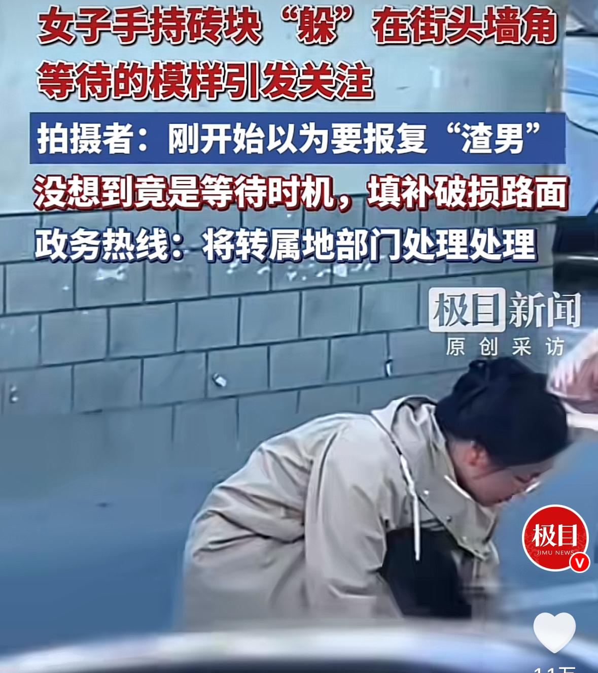 此刻,她光芒万丈!河南郑州,一男子在路边发现一年轻女子手握砖头,靠在墙边。男子以为女子要报复哪个负心汉,没想到,红灯亮了时,女子竟拿着砖头径直走到路中间,弯下腰,将手里的砖头铺在了破损的路面上,方便行人和车辆通过。男子一看,破损的那段路面,已经铺了七八块儿砖头了,可想而知,女孩在这里等了多久!