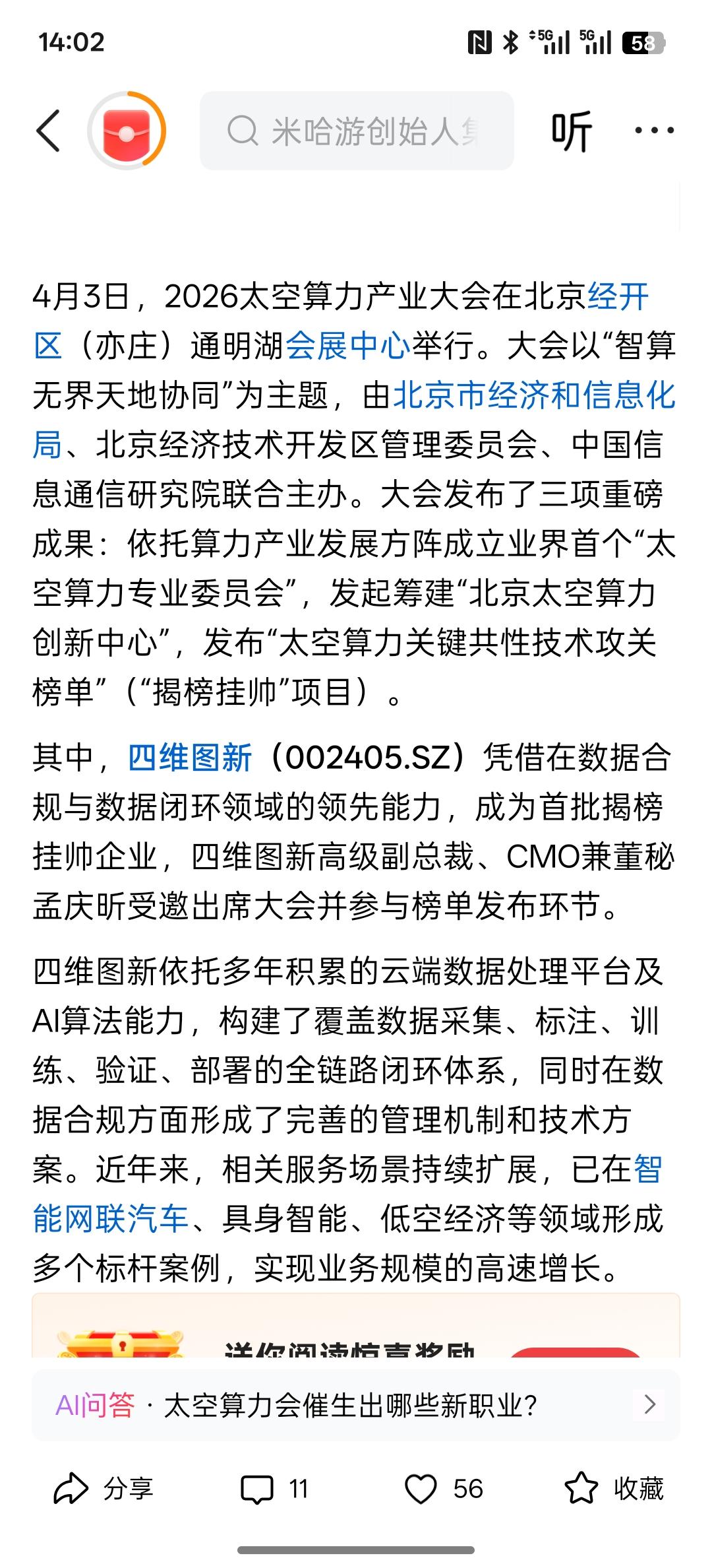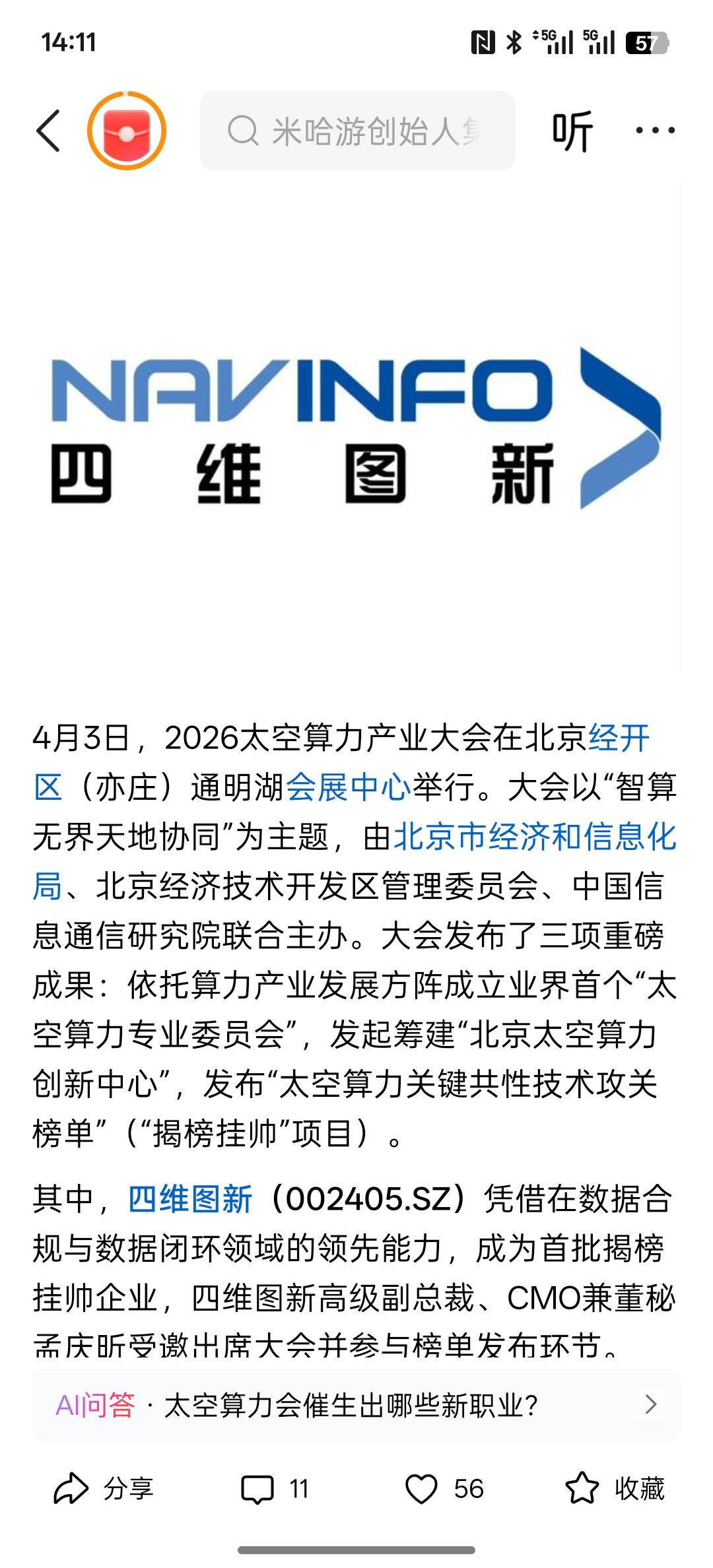 四维图新入选北京太空算力关键共性技术攻关榜单【2026太空算力产业大会发布十大重点攻关项目】 依托中国在太空算力的发展,未来中国的其他相关企业也将得到这样的发展机会,尤其是技术上未来的突破,我在太空经济发展同样会带来更大的机遇,而人工智能又不会实现太空AI你为卫星将成为太空平台以及太空通信,这样会实现低轨卫星的发展趋势,那么,太空的智能化将需要更多的算力,也就是太空算力以及数据中心的建设。同样,太空光伏就成为这些产业发展的重要能源支撑!结合太空的芯片发展技术!中国的科技必然会延伸到太空持续发展!