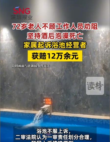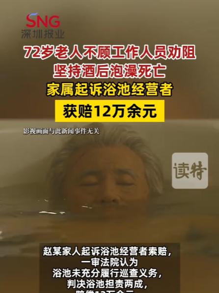 这是一次代价极其惨痛的教训,足以给所有爱喝酒、爱泡澡的人敲响警钟。 一位72岁的老汉,在酒精的麻痹下,执意踏进那池冒着热气的温水,却没能再站着走出来。 随之而来的,是一场索赔60万的法律博弈,更是一面折射出社会规则与个人责任的镜子。 在秦皇岛的这个冬日里,生命的消逝与12万的判赔,让“自己负责”这四个字变得格外沉重。 赵大爷这天心情不错,几杯白酒下肚,整个人走起路来都有些摇晃,脸红得像熟透的红枣。 按照他多年的老习惯,酒后得去浴池“散散汗”,觉得这样才算通透,血液才能循环开。 可他不知道的是,这种所谓的“养生经验”,其实是他在向死神递交投名状。 当赵大爷摇摇晃晃出现在村里浴池门口时,老板一眼就瞧出了不对劲。 那满身的酒气和踉跄的步伐,摆明了是个“烫手山芋”,老板赶紧上前劝阻,让他清醒点再来。 赵大爷听完把脸一沉,梗着脖子大声嚷嚷,说自己泡了几十年澡,从来没出过岔子。 他甚至甩下一句狠话:“要是出了事,我自己担着,不用你们瞎操心!” 老板毕竟是开门做生意的,面对这种犟老头,最终还是没能硬下心肠拦死,只能让他进了门。 本以为只是个寻常的插曲,谁料这竟成了赵大爷在这个世界上留下的最后一段声音。 仅仅十分钟后,浴池的宁静被一声惊叫打破,工作人员发现,赵大爷已经面朝下栽倒在水中。 面色惨白、呼吸全无,尽管救护车飞速赶来,但这短短的十分钟,已经夺走了一切生还的可能。 葬礼办完,家属的悲痛迅速转化成了愤怒,一纸诉状将浴池老板告上法庭,开口就要60万。 家属认为,既然老人都喝成那样了,浴池就不该放他进去,进去了也得有人时刻盯着。 老板觉得比窦娥还冤:我也劝了,我也拦了,总不能给每个客人都配个贴身保镖吧? 这场关于“安全保障义务”的边界之争,最终被摆在了天平的两端。 虽然赵大爷是完全民事行为能力人,且明知酒后泡澡危险,应承担80%的主要责任。 但浴池作为经营场所,对这类高风险人群的保护,不能仅仅停留在“嘴皮子”的劝告上。 依据《民法典》第1198条,法院判定浴池承担20%的责任,也就是赔偿家属12万余元。 这就涉及到了硬核的医学逻辑:酒精会扩张血管、加速心率,而热水会再次加剧这种反应。 一个72岁的老人,在心血管负荷达到极限时,大脑瞬间缺血缺氧,只需几秒钟就会失去意识。 在医学实验中,这种组合被称为“心脑血管的自杀式冲击”,几乎没有任何容错空间。 既然你明知他处于醉酒状态,且这种状态进入浴池具有极高的人身危险,你就必须采取更有效的防御措施。 比如,禁止其入内,或者指派专人进行强制性的实时看护,而不是简单的口头叮嘱。 法律的逻辑在于:商业经营不能只顾着收那几十块钱的门票,而对明显的致命风险视而不见。 这12万的赔偿金,不仅仅是给死者家属的补偿,更是给整个服务行业的一记重锤。 它告诉所有的经营者,安全保障义务不是贴在墙上的标语,而是实打实的成本与责任。 对于我们每一个人来说,更要清醒地认识到,所谓的“老习惯”有时就是取命的镰刀。 千万不要用一句“没事”去赌命,因为生命这局棋,一旦落子,就再也没有推倒重来的机会。 我们要警惕那种“我命由我不由天”的盲目自信,尤其是在脆弱的生理极限面前。 赵大爷走了,留下了一个破碎的家庭,和一家至今心有余悸的浴池。 希望这起案件能成为一道防火墙,挡住那些试图挑战生理常识的冲动。 别让“散散酒气”这种毫无科学依据的偏见,继续在我们的生活里制造悲剧。 如果你身边还有那种爱酒后泡澡、酒后运动的长辈,请一定把这个真实的案例讲给他们听。