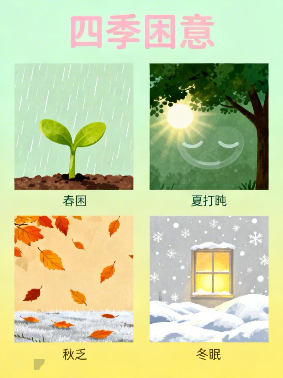 都说春困、秋乏、夏打盹,再来个冬眠,这么一算,一年下来,要么在睡觉的过程中,要么在去睡觉的道路上啊[呲牙][呲牙] 这“春困、秋乏、夏打盹、冬眠”的说法还真形象。春天,万物复苏,身体却像被施了魔法,总犯困,上班时眼皮直打架。夏天,酷热难耐,午后就想找个地儿打盹。秋天,秋高气爽,可身体却提不起劲儿,乏得很。到了冬天,外面冰天雪地,谁不想窝在被窝里冬眠。 我之前春天上班,上午就开始迷糊,工作效率直线下降。夏天午休时,恨不得多睡一会儿。秋天整个人懒洋洋的,干啥都没精神。冬天就更不用说了,周末能在床上躺一天。这么看来,一年里大部分时间都和睡觉脱不了干系。 春季困重 春光懒困总人倦 提神解乏之春 春困饮食调养 冬天为什么嗜睡 春假焦虑 汽车春困
