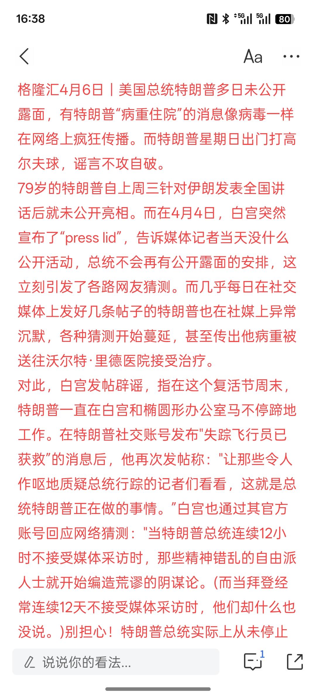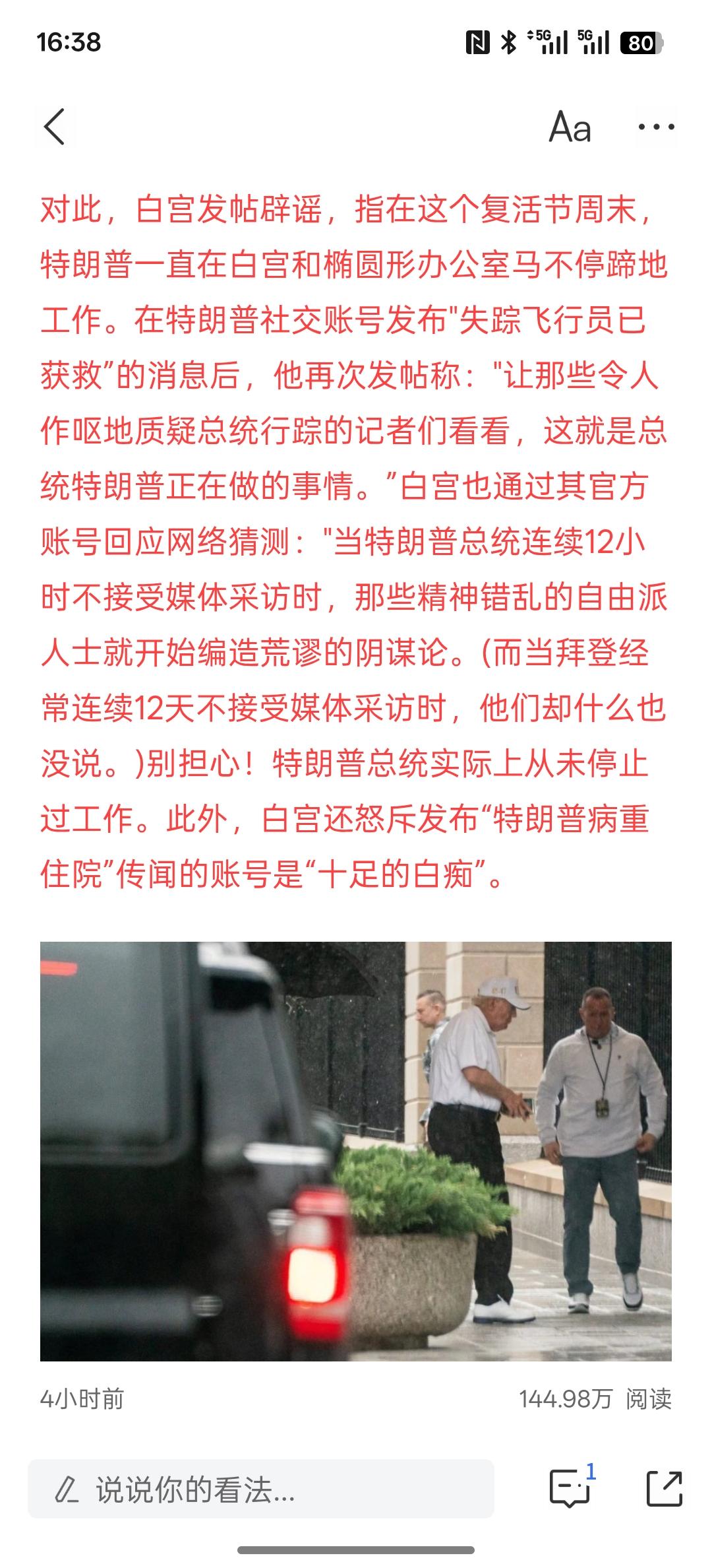 特朗普重病这层谣言美国已经否认,并没有发生此类事情,那特朗普正在打高尔夫!但不知道是谁放出此类消息! 根据白宫发表的信息言论说,那些错误精神自由言论派!其实是制造荒谬的谎言!所以特朗普只要12个小时不在社交媒体或者没有出面发表言论,可能就会有谣言四起!特朗普确实喜欢发表相关言论,如果一旦24小时没有发表相关言论,可能会造成这样的言论局面!