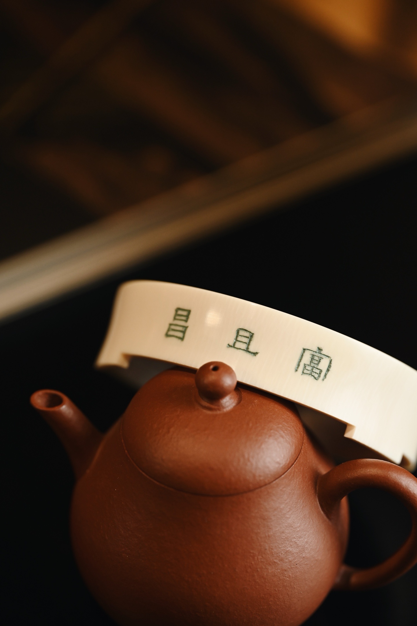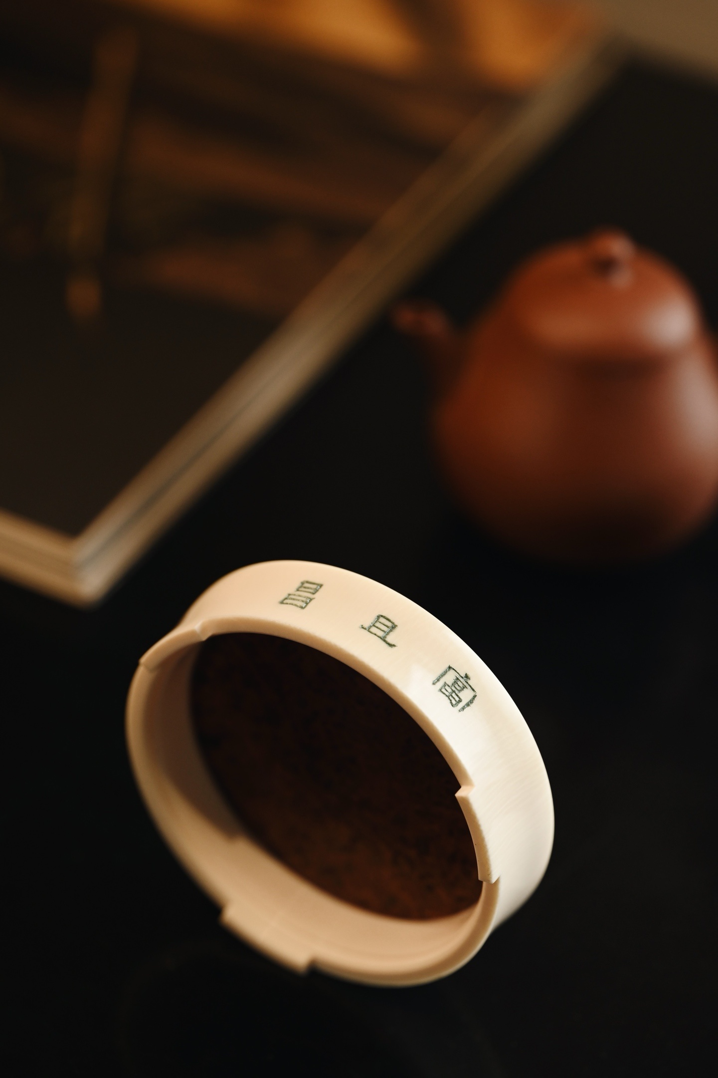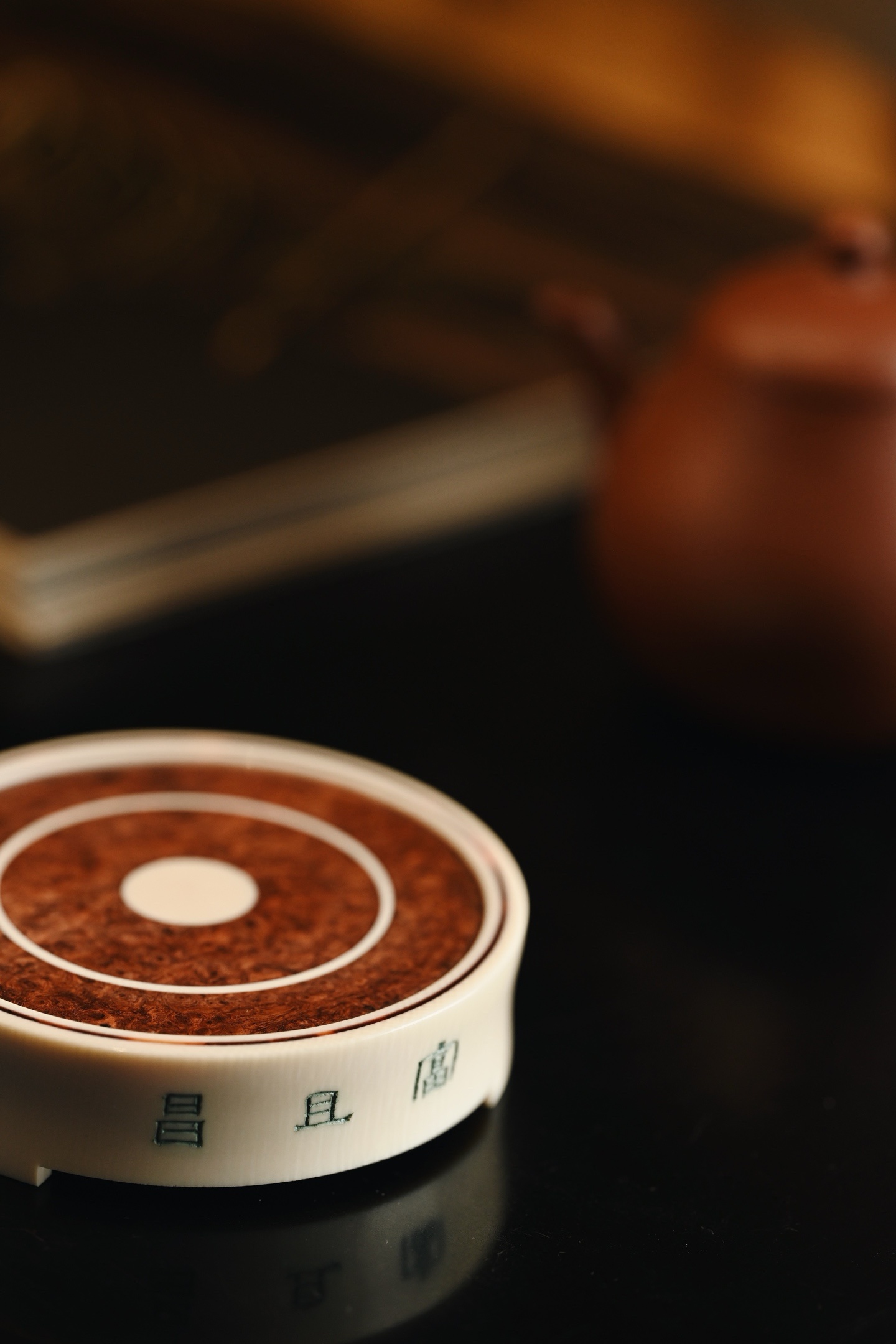 料质细腻,层次分明,素雅大方,侧壁阴刻古篆「富且昌」三字,笔力遒劲,取吉语铭文,寓意富贵昌隆、家业兴旺。三足承托,稳重大气,可为文房摆件、香器、雅玩之承托。