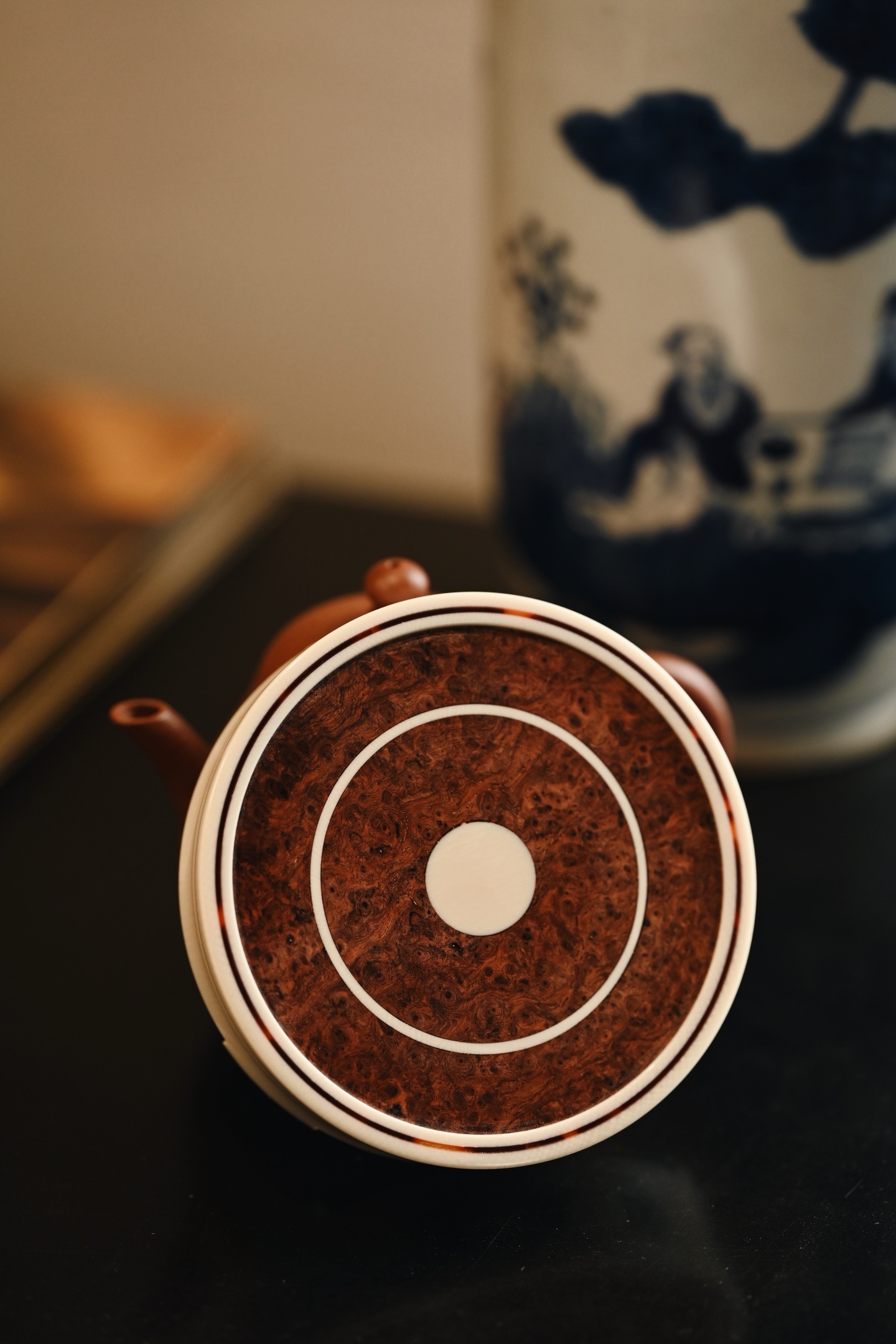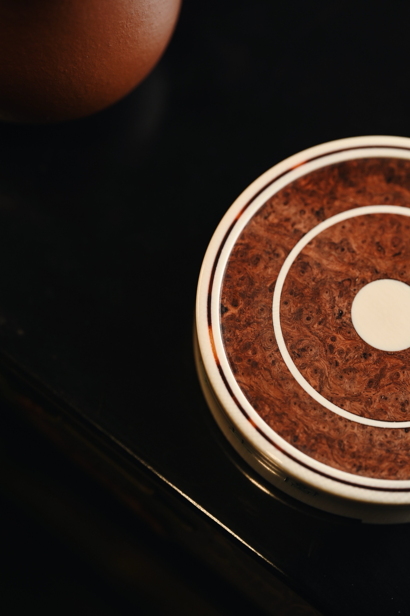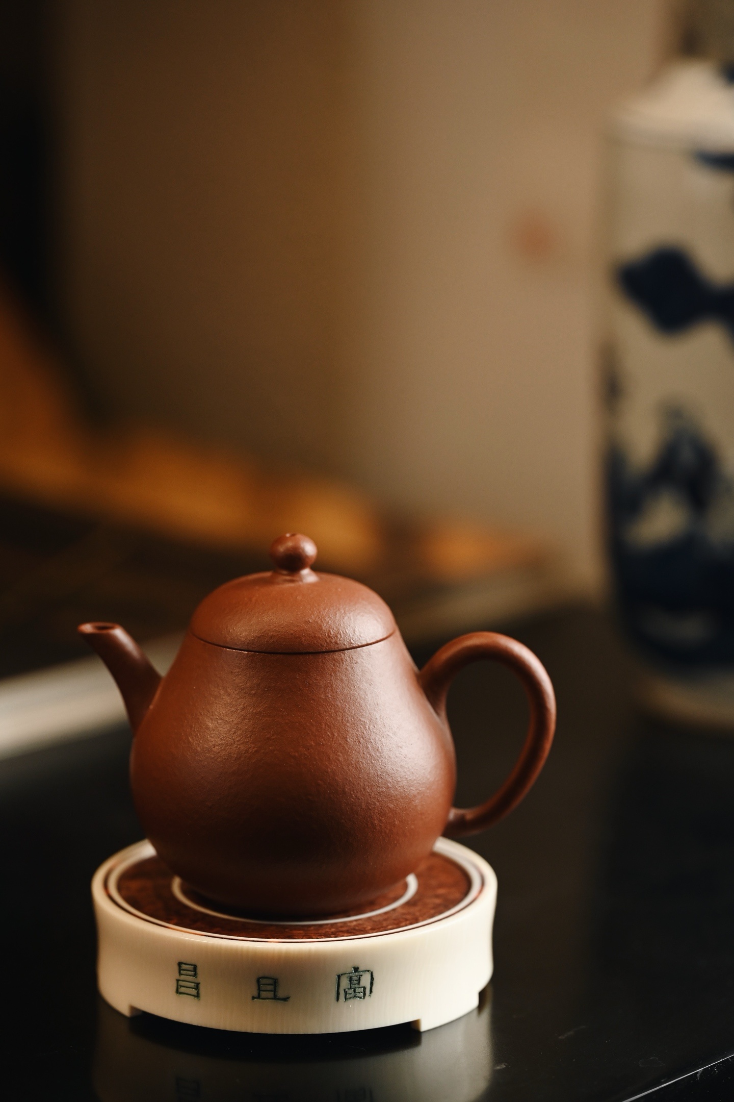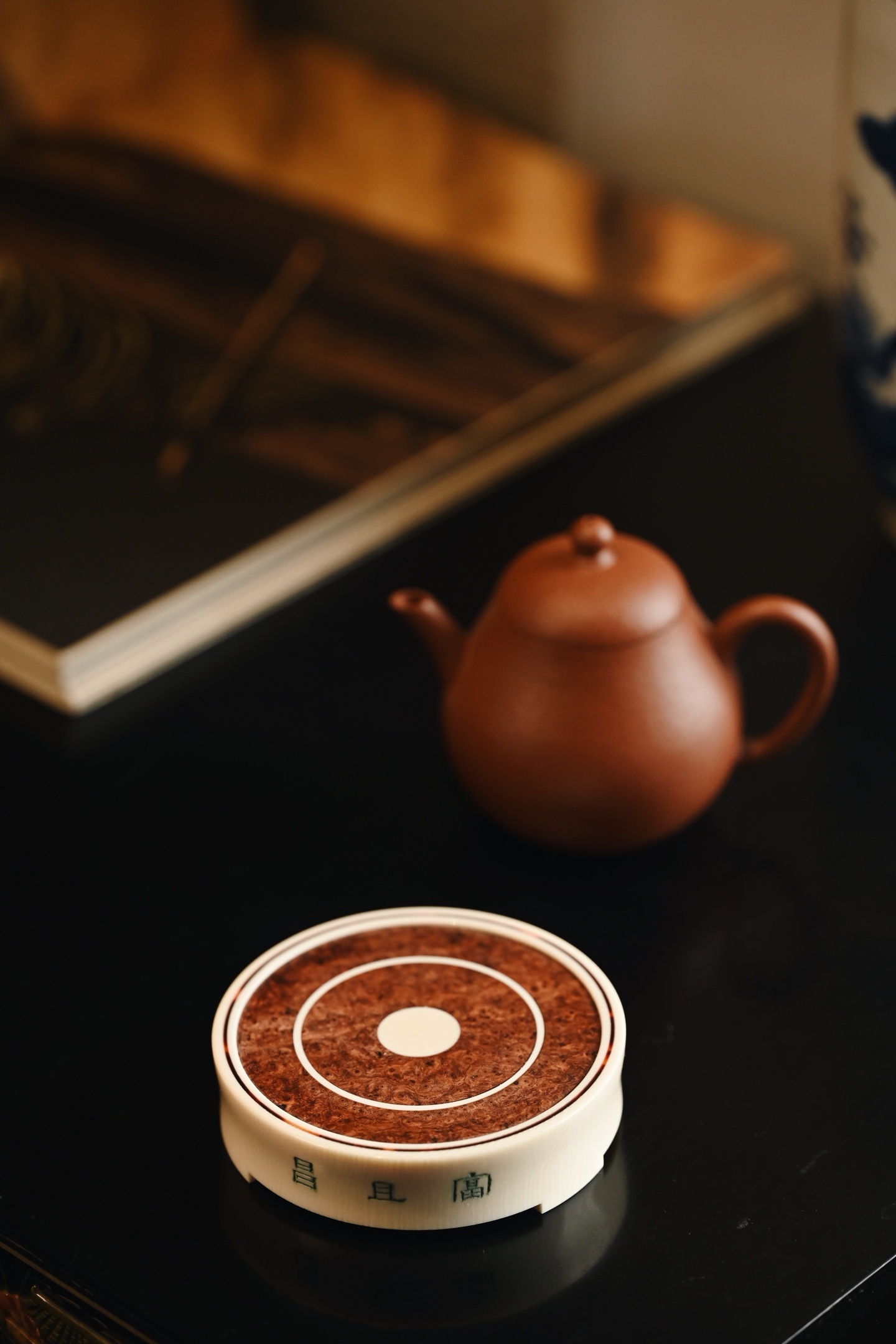 料质细腻,层次分明,素雅大方,侧壁阴刻古篆「富且昌」三字,笔力遒劲,取吉语铭文,寓意富贵昌隆、家业兴旺。三足承托,稳重大气,可为文房摆件、香器、雅玩之承托。