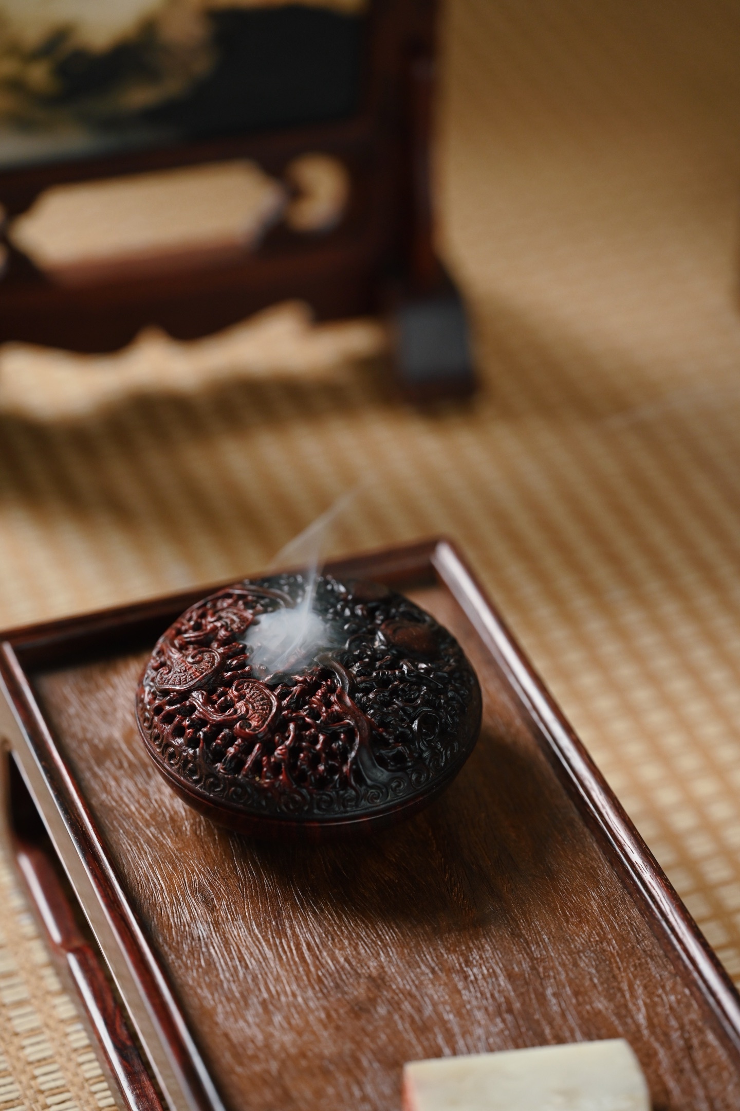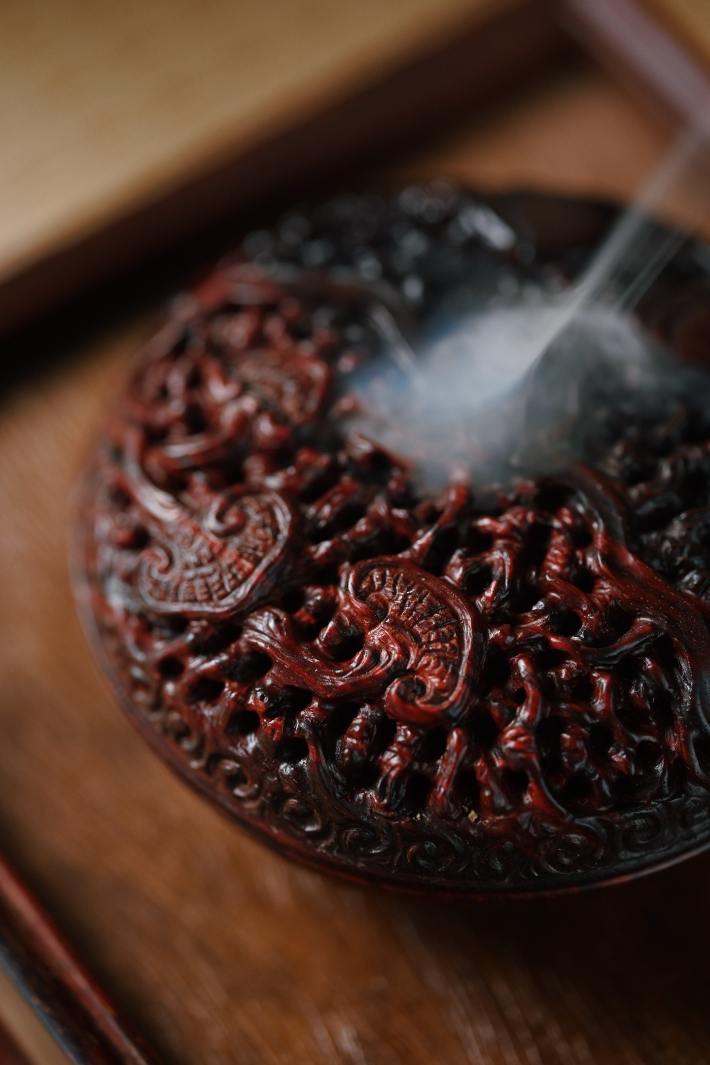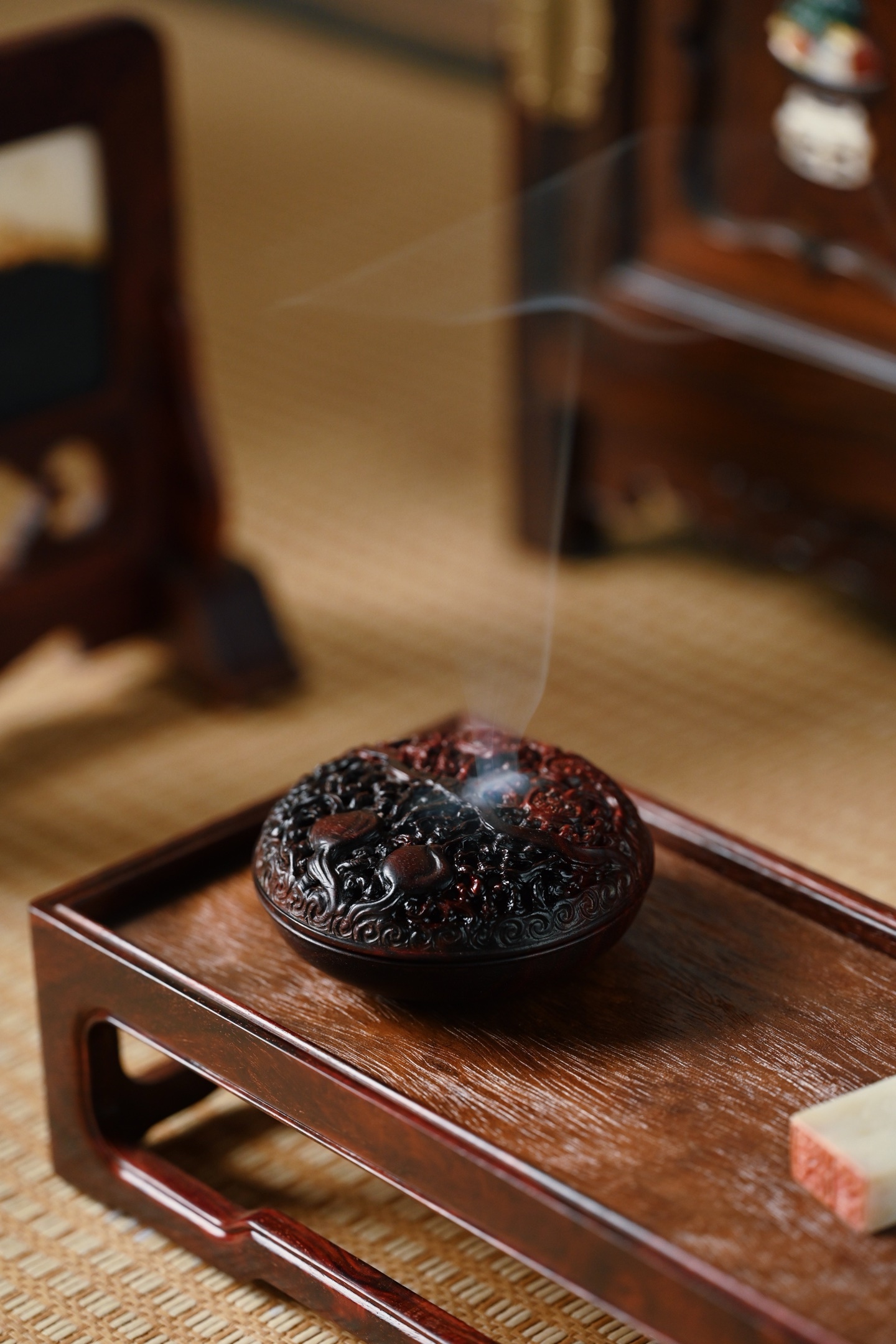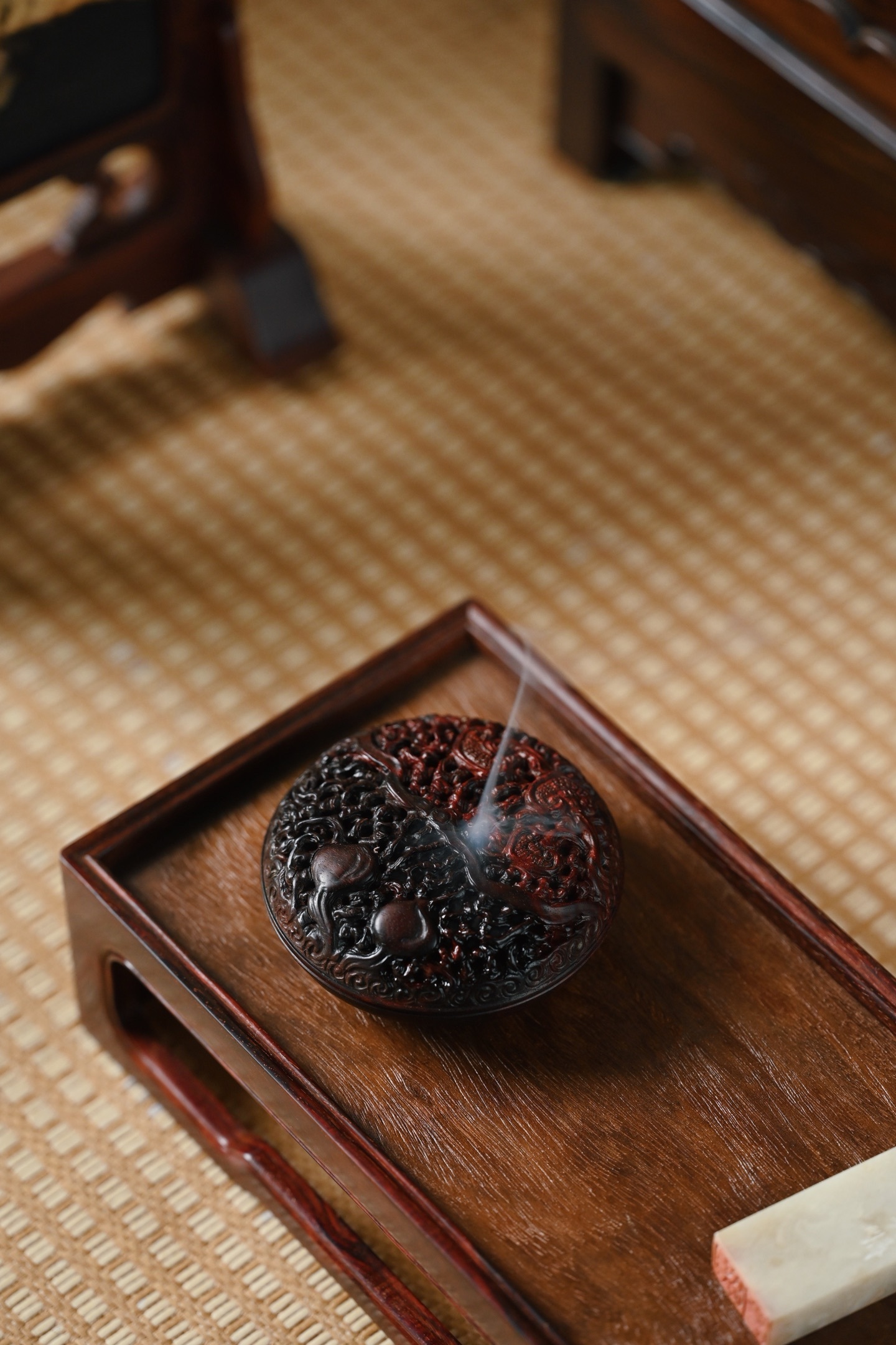 木色沉穆古雅,于方寸圆盒之上,雕刻灵芝清新灵动,寿桃圆润饱满,枝蔓缠绕间疏密有致,孔洞通透,既保香气流转,又显工艺之精妙,赏用皆宜。
