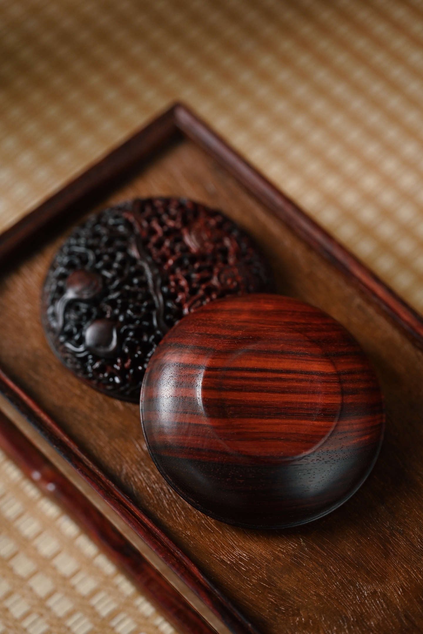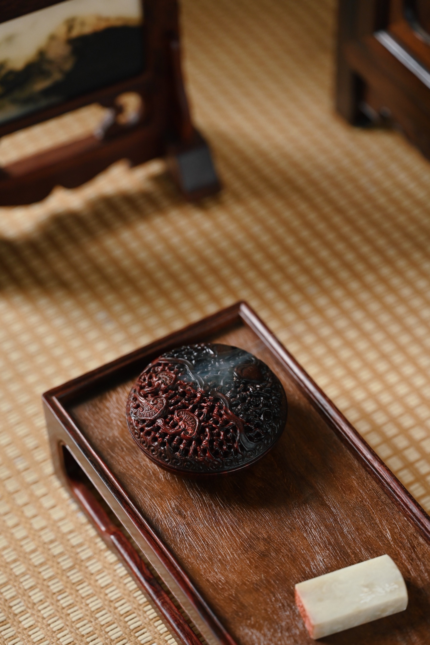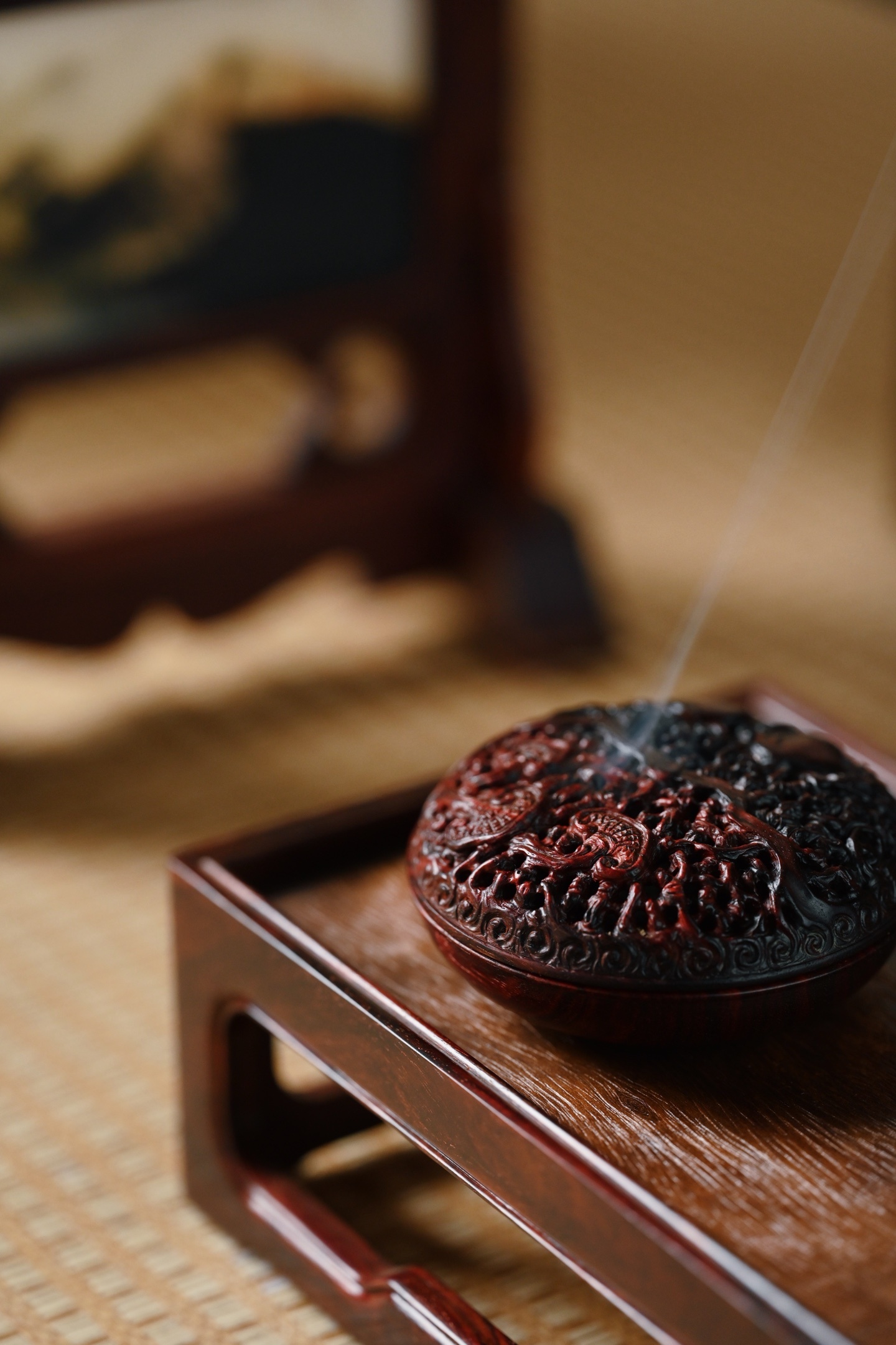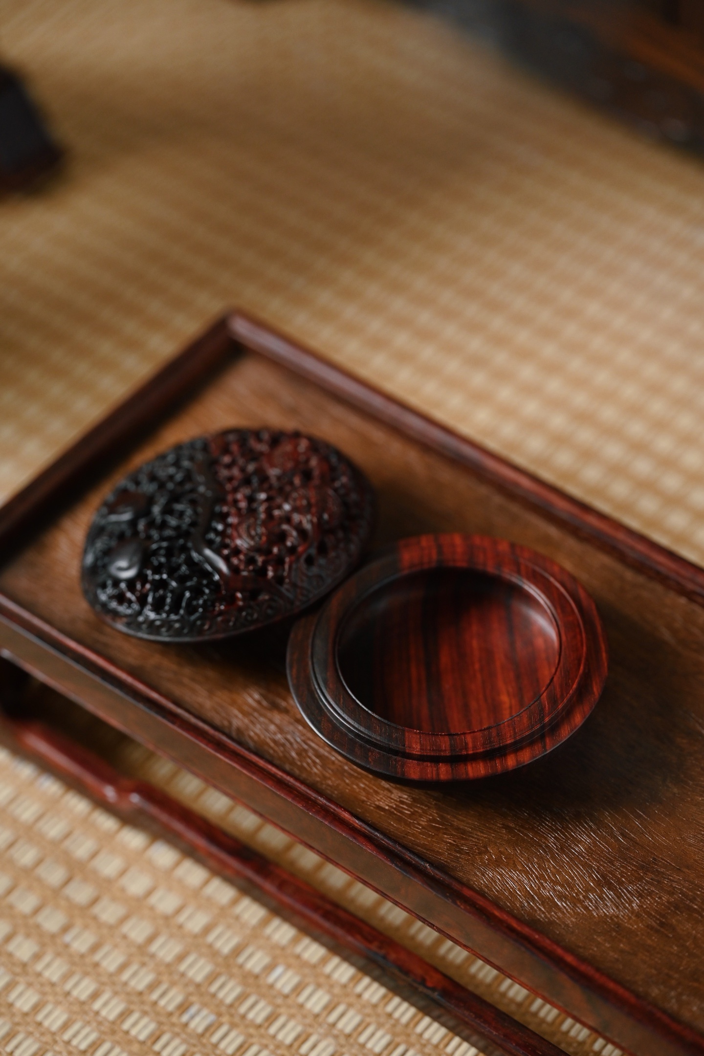 小叶紫檀 | 福寿绵延 香炉木色沉穆古雅,于方寸圆盒之上,雕刻灵芝清新灵动,寿桃