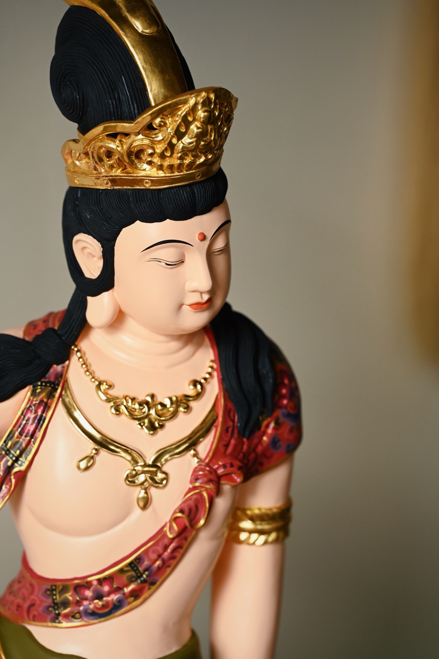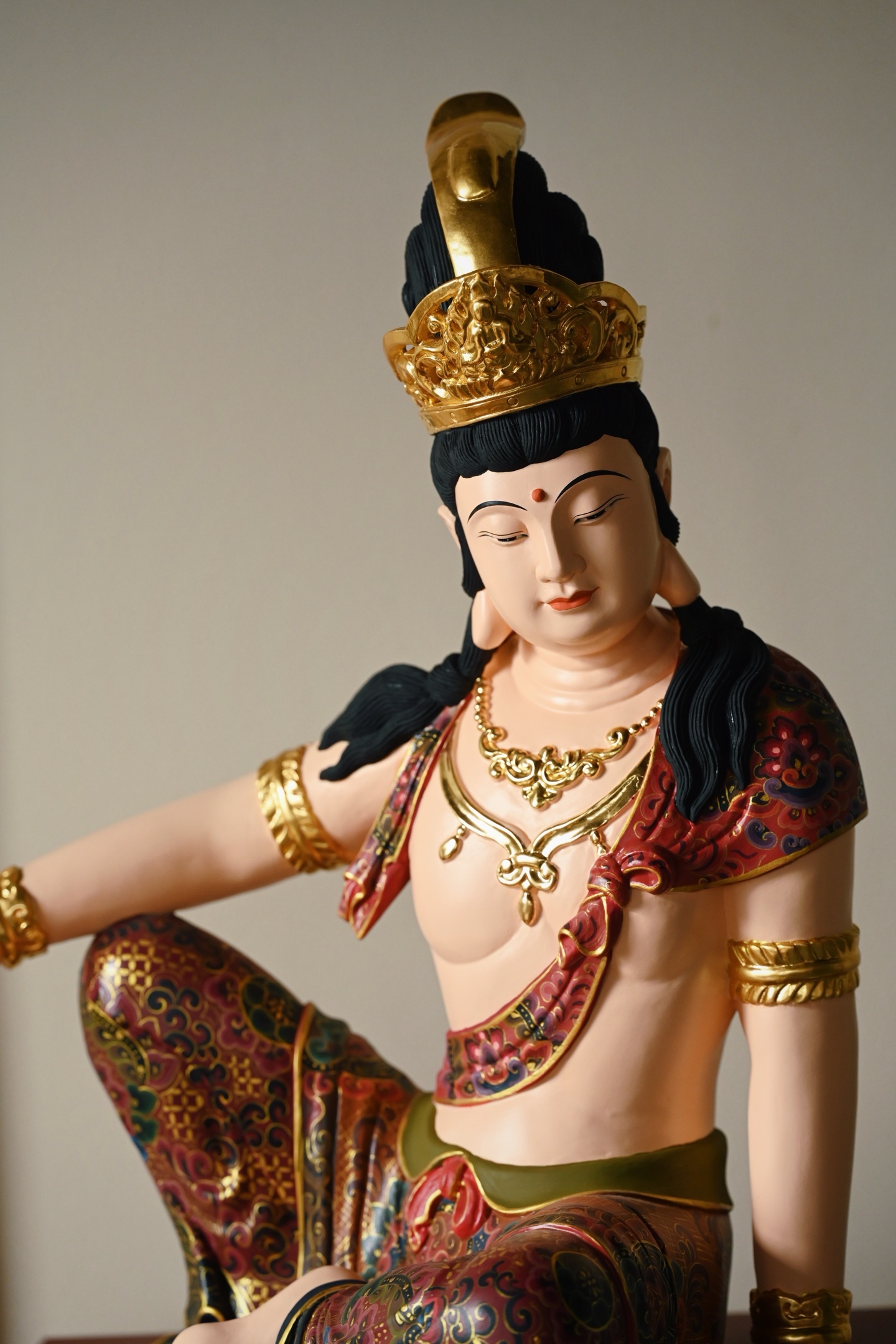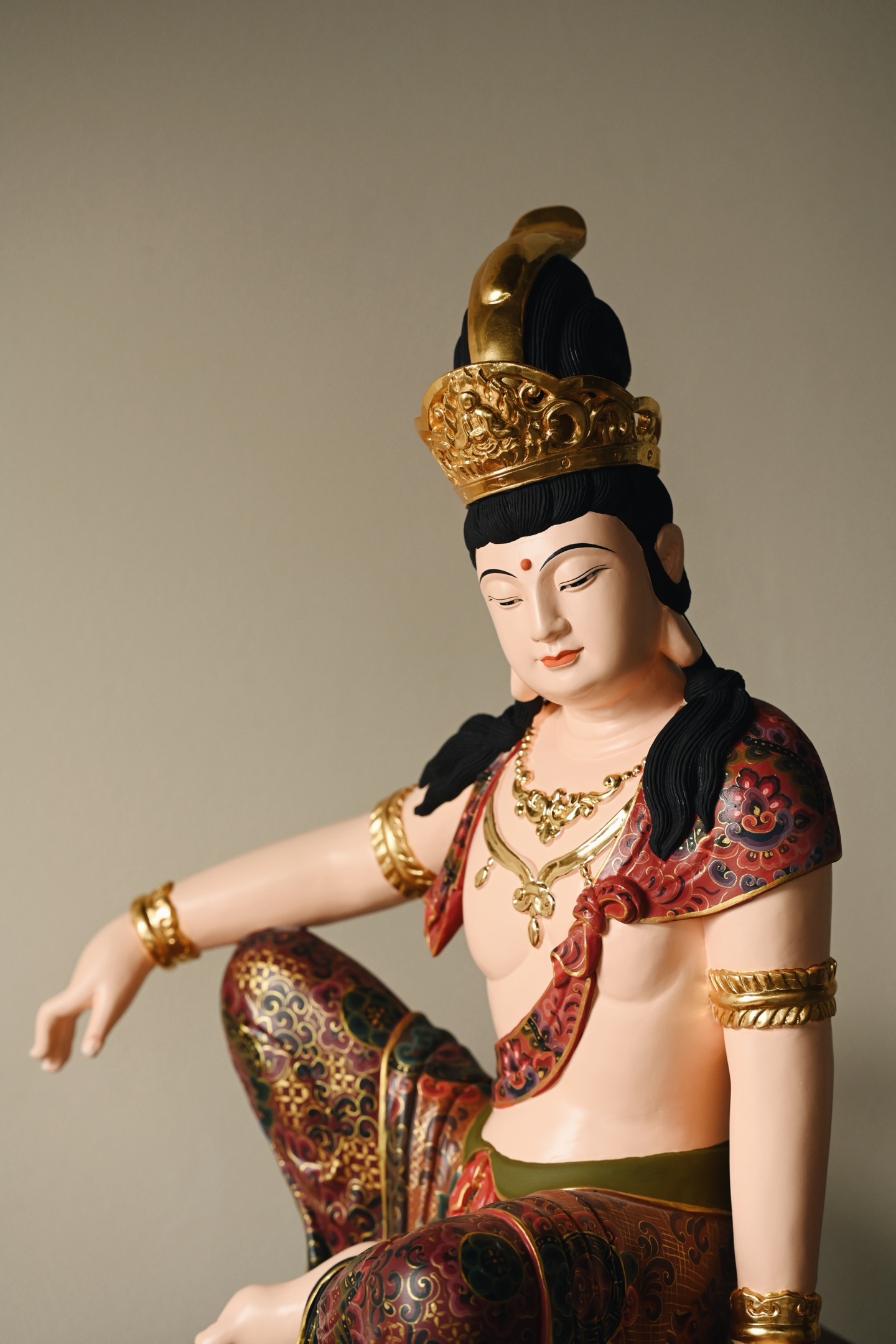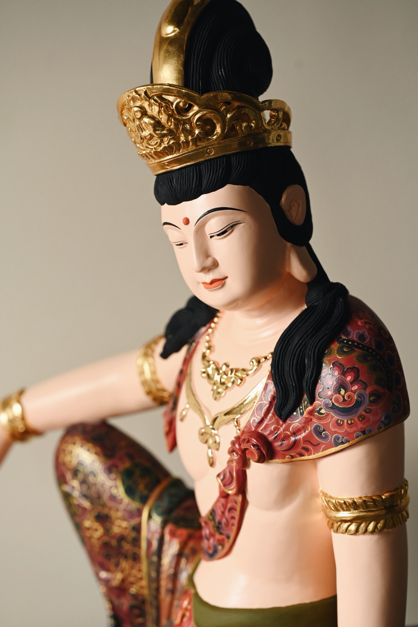 整料雕刻,观音面容圆润,眉目低垂,神态慈悲安详。宝冠鎏金璀璨,璎珞臂钏精工细作,衣袍以矿物彩料绘就缠枝宝相花纹,富丽堂皇,身姿舒展闲逸,尽显“观自在”之禅意。