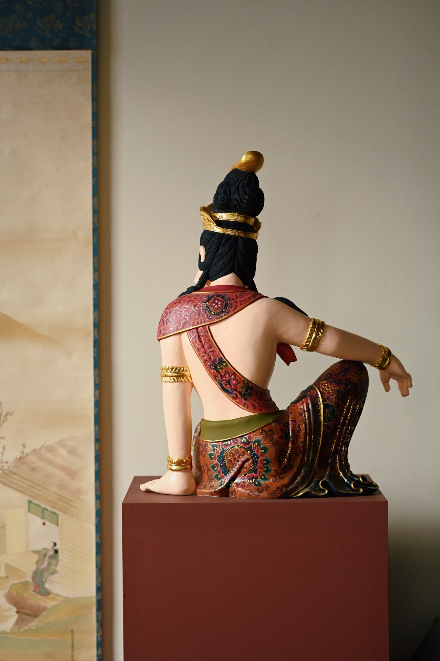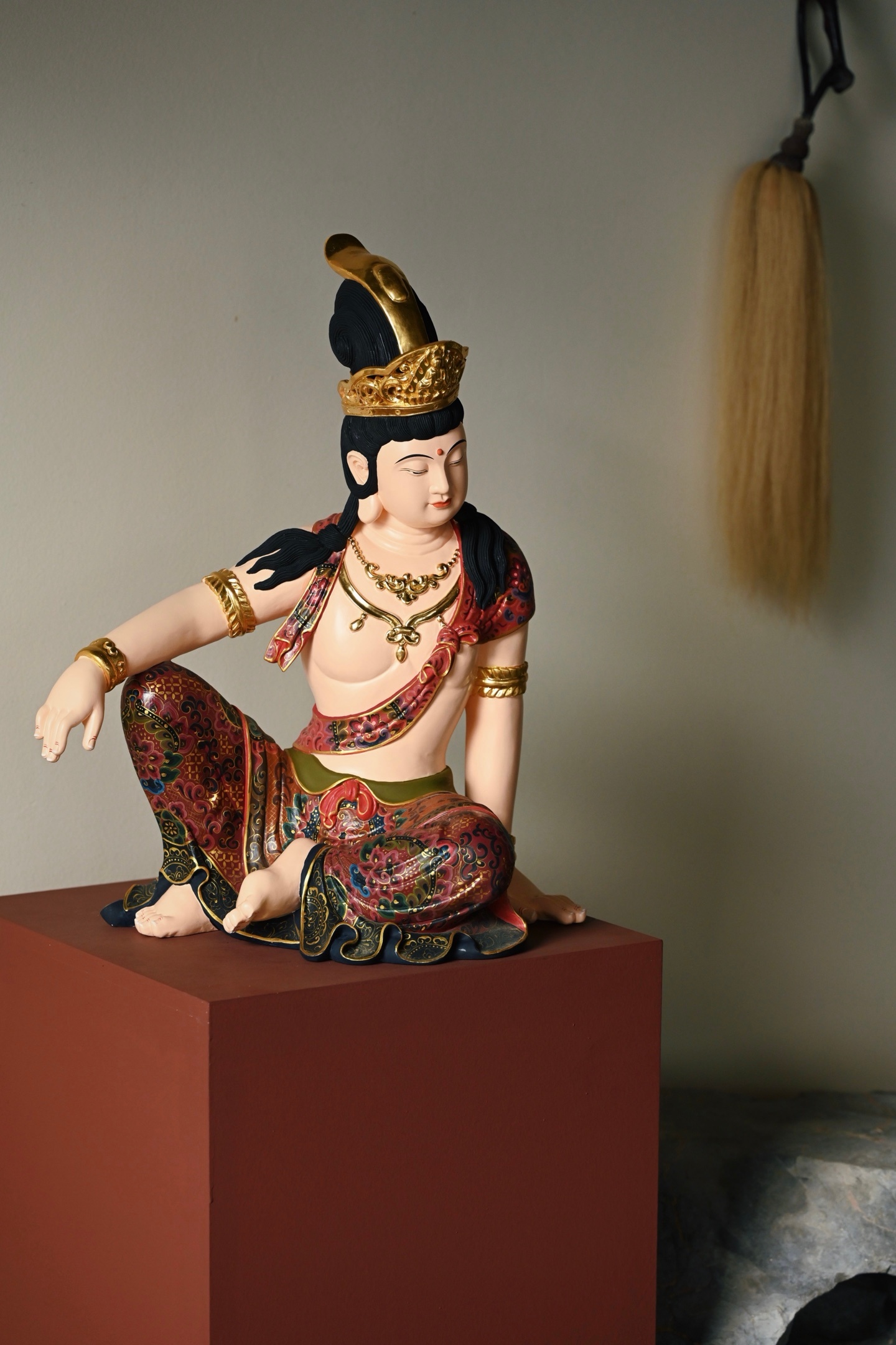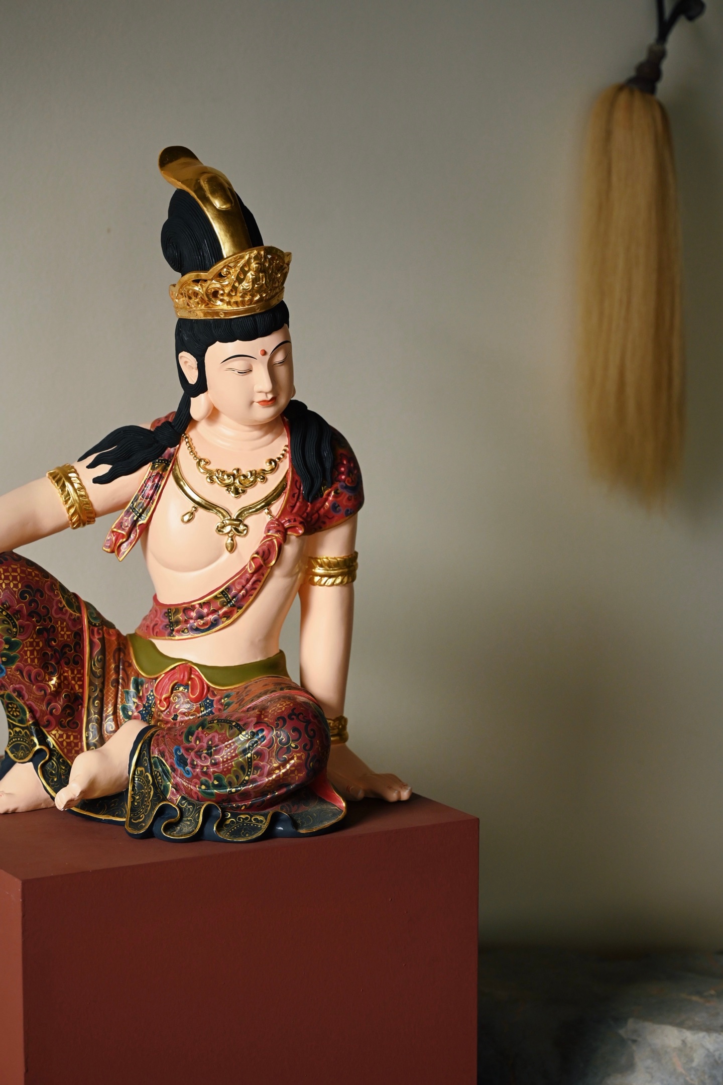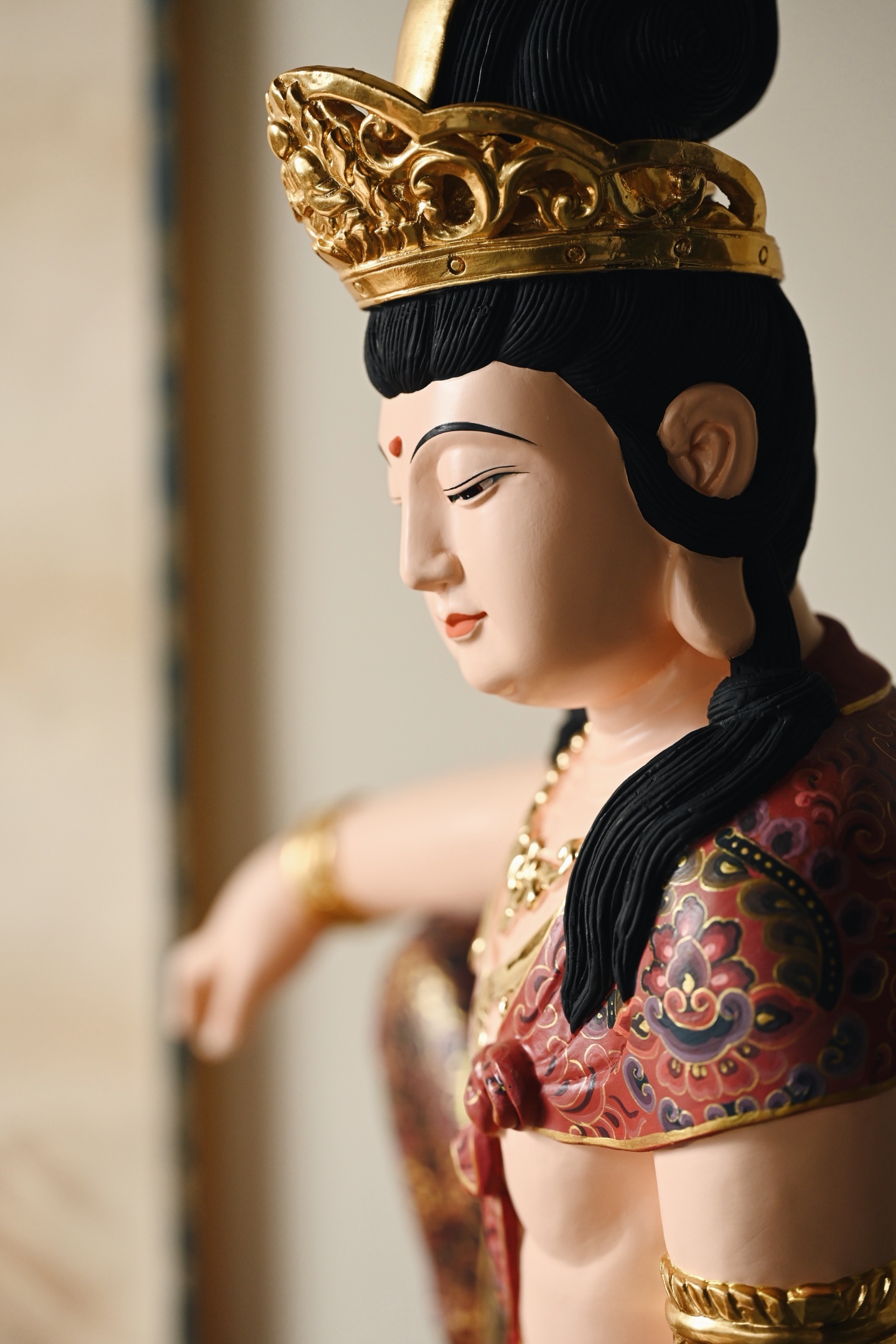 整料雕刻,观音面容圆润,眉目低垂,神态慈悲安详。宝冠鎏金璀璨,璎珞臂钏精工细作,衣袍以矿物彩料绘就缠枝宝相花纹,富丽堂皇,身姿舒展闲逸,尽显“观自在”之禅意。
