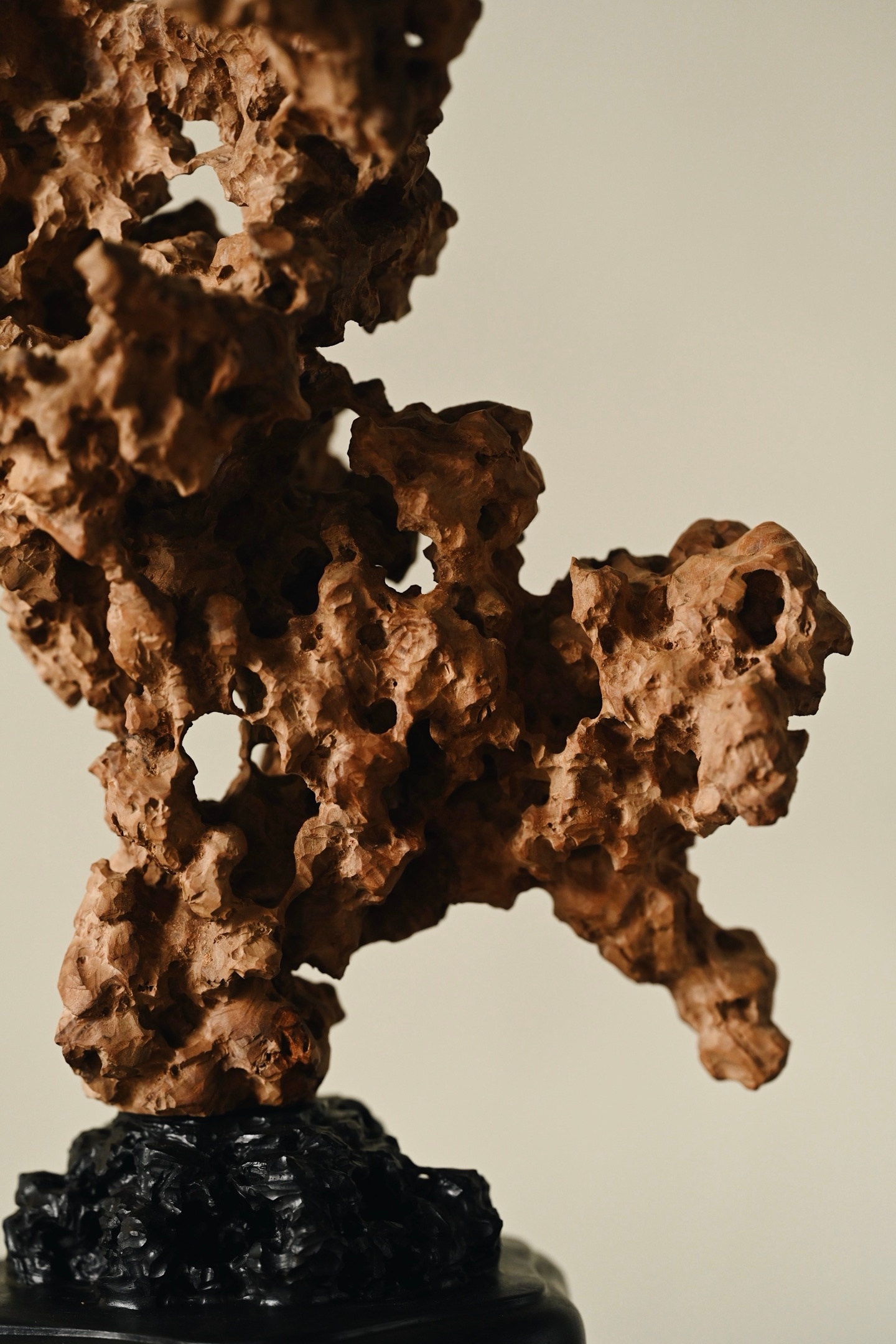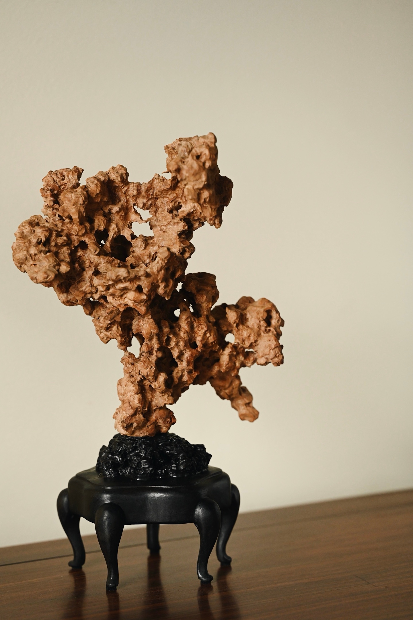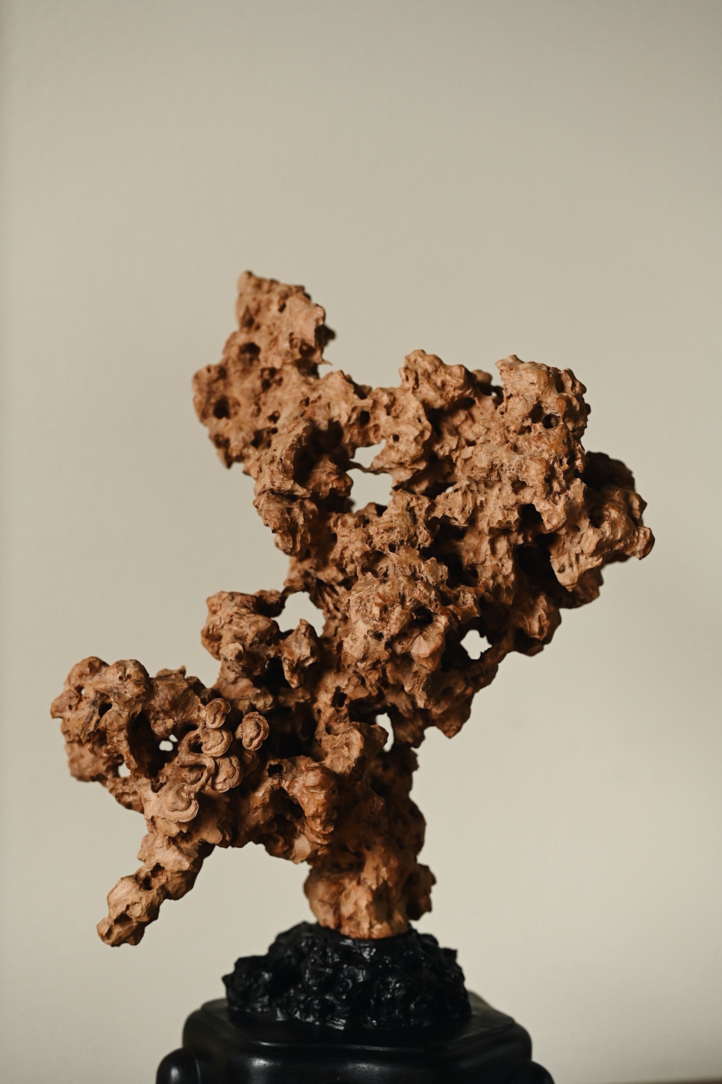 以木为纸,以刀代笔,将太湖石的空灵之美凝于木上。观其形,瘦劲挺拔,褶皱层叠,孔洞贯通,虚实相生,尽得“漏、透、瘦、皱”四字真髓;察其工,刀工精湛,灵芝婉转,于细微处见功力,置于案头,祥意重重。