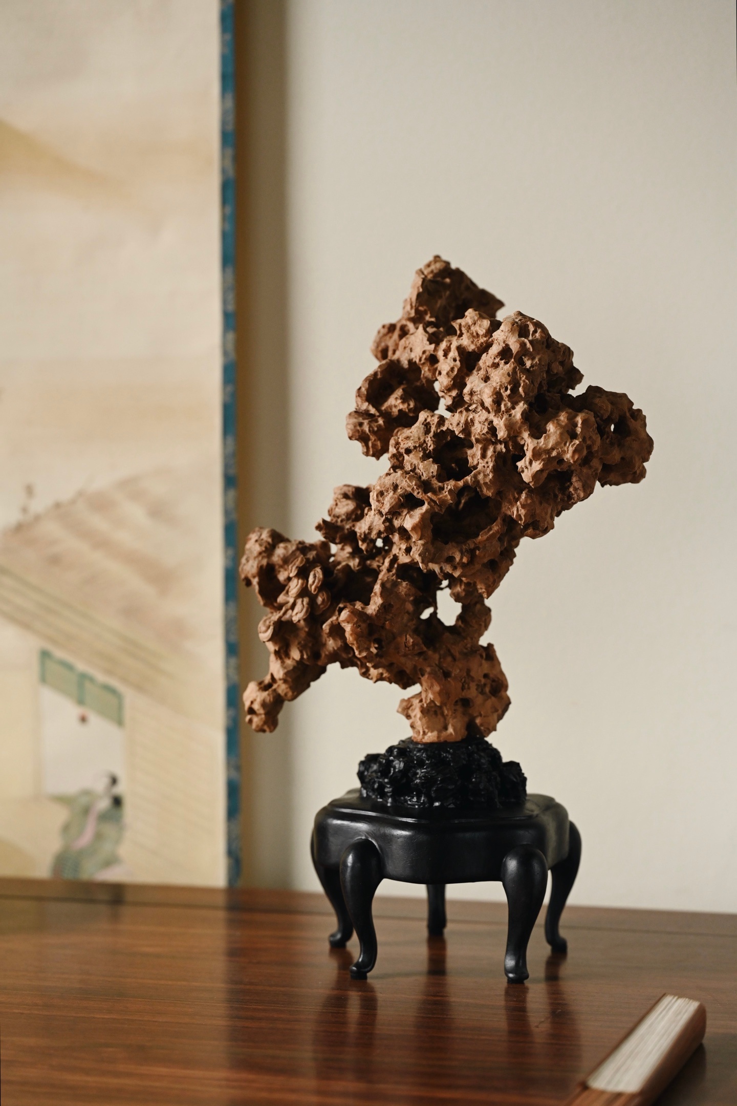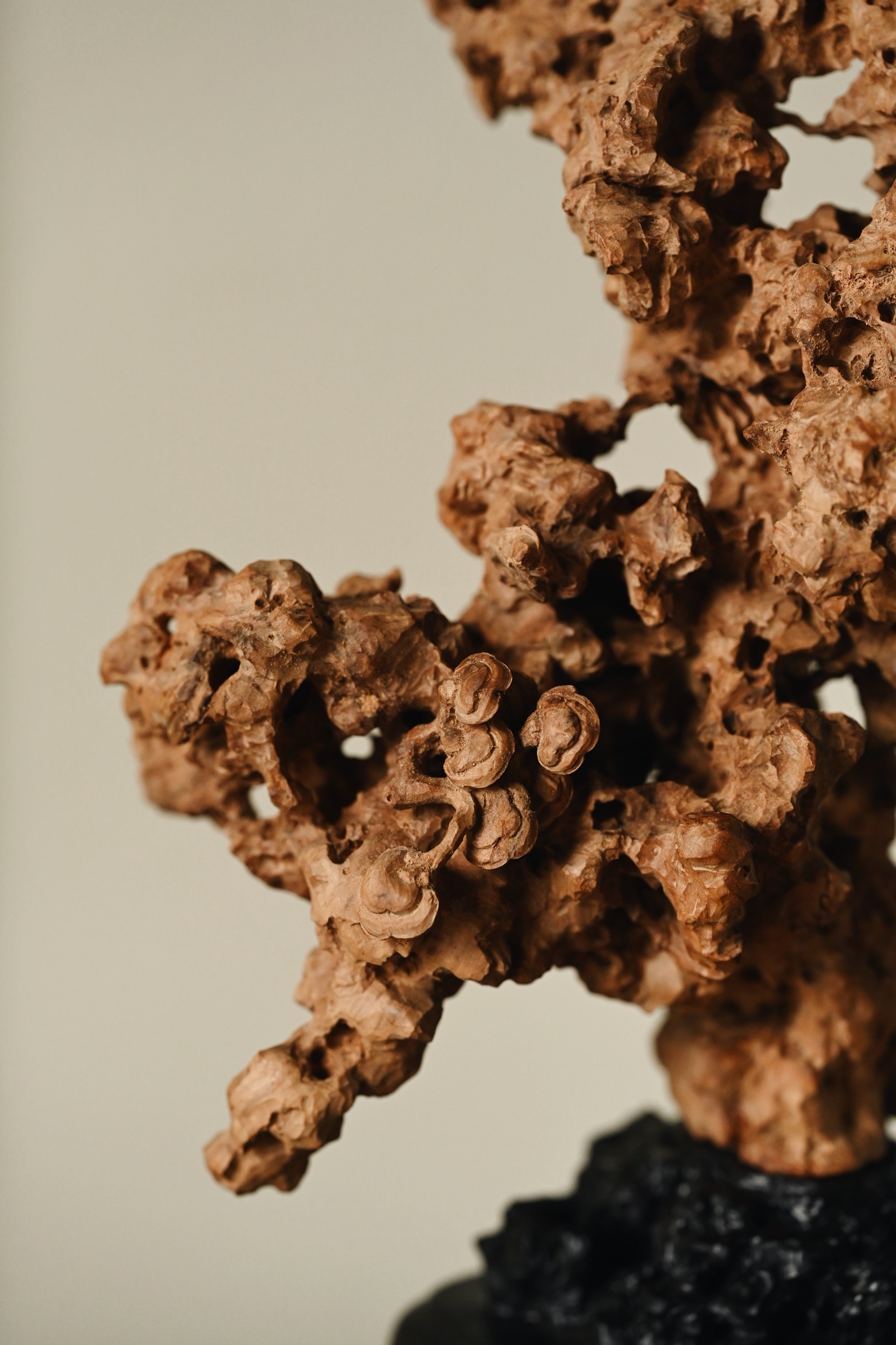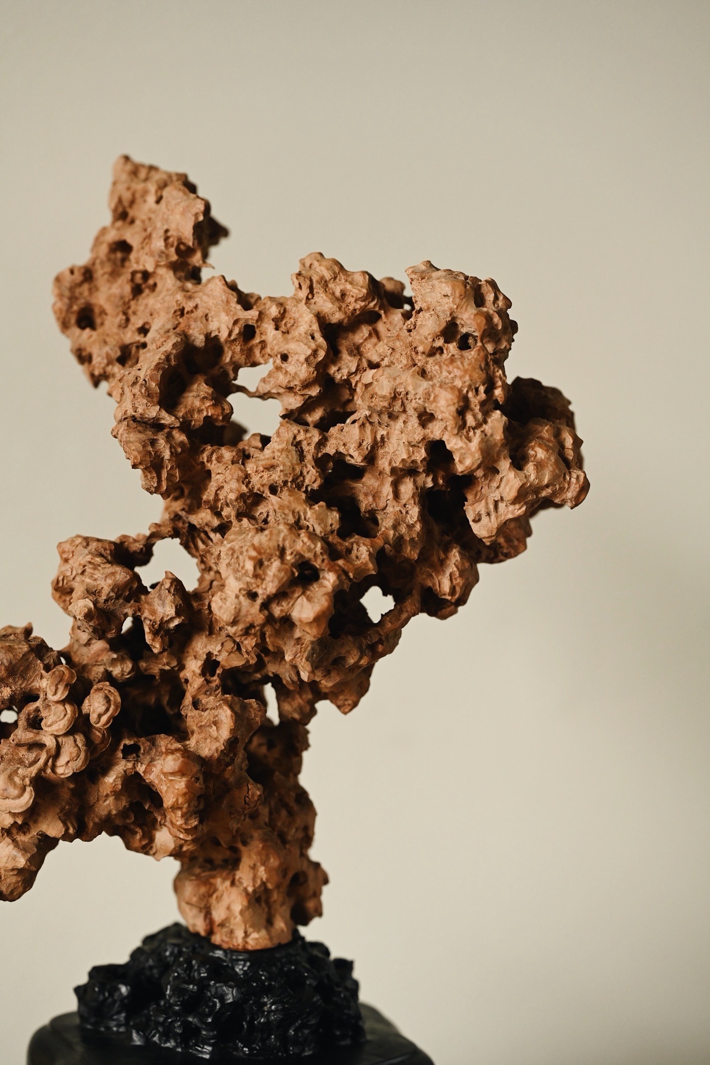 以木为纸,以刀代笔,将太湖石的空灵之美凝于木上。观其形,瘦劲挺拔,褶皱层叠,孔洞贯通,虚实相生,尽得“漏、透、瘦、皱”四字真髓;察其工,刀工精湛,灵芝婉转,于细微处见功力,置于案头,祥意重重。