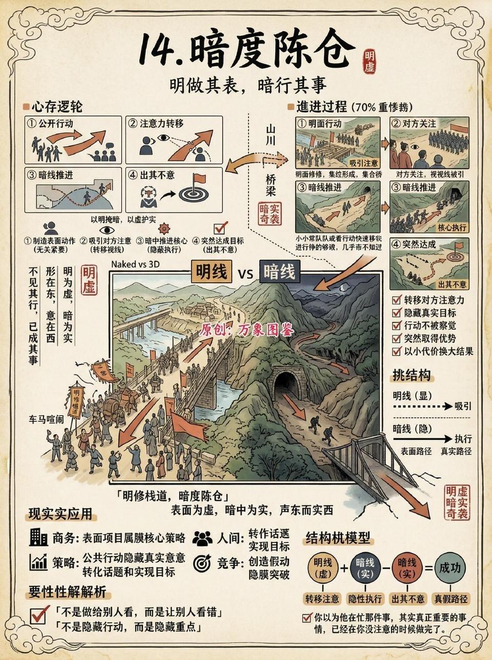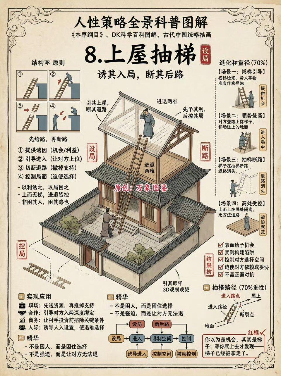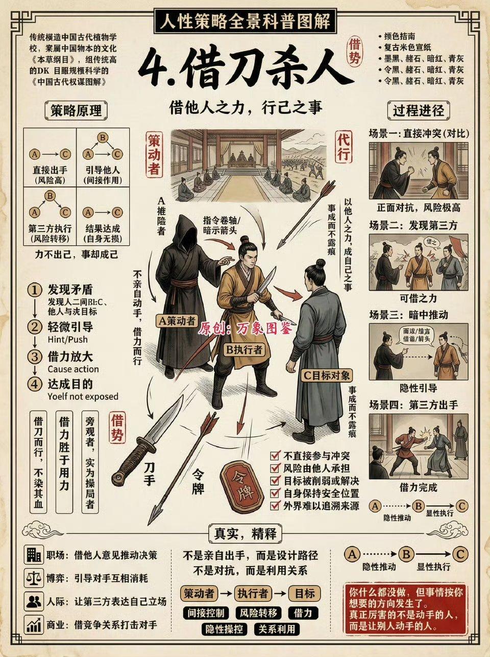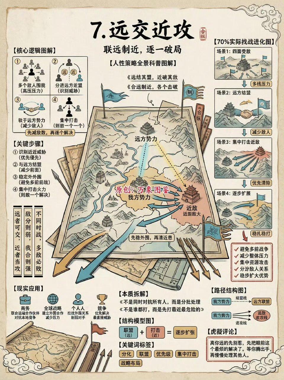 🔥吃透这 16 个顶级人性谋略,普通人也能逆风翻盘 如果你总觉得自己在人际、职场、生活里处处被动,被人拿捏、错失机会,那这 17 个源自《三十六计》的顶级人性策略,一定要反复研读。 这不是厚黑学,而是古人用千年智慧总结的「生存底层逻辑」: 1、想不费吹灰之力削弱对手?看推恩令,以恩为刀,削权无形 2、想从被动变主动掌控全局?学反客为主,借对手失误,顺势上位 3、想零成本放大影响力?用无中生有,造势成局,虚而化实 4、想借力打力保全自己?懂借刀杀人,不亲自出手,坐收渔利 5、想盘活资源快速起势?用借尸还魂,借旧之名,起新之势 6、想借强者之势快速成长?学树上开花,站在巨人肩膀,放大自己 7、想多线压力下破局?用远交近攻,联远制近,逐个击破 8、想让对手进退两难?学上屋抽梯,诱其入局,断其后路 9、想一次性解决问题?用关门捉贼,先布其局,再一举拿下 10、想让对手一步步走进圈套?学连环计,多计叠加,整体成局 11、想坐收渔翁之利?用隔岸观火,观其内斗,待机而取 12、想积小成大积累优势?学顺手牵羊,见机而取,不露痕迹 13、想以柔克刚掌控局面?用笑里藏刀,表面温和,内藏锋芒 14、想出其不意达成目标?学暗度陈仓,明修栈道,暗度陈仓 15、想危机时刻安全脱身?用金蝉脱壳,留形脱身,转危为安 16、想以小博大撬动高回报?学抛砖引玉,先舍小利,后得大利 每一个策略都拆解了底层逻辑、关键步骤和现实应用,从职场博弈、商业竞争,到人际相处、人生破局,全场景适用。 真正厉害的人,从不是靠蛮力硬拼,而是懂人性、用谋略,顺势而为。 收藏这篇,遇事翻一翻,少走 10 年弯路!
