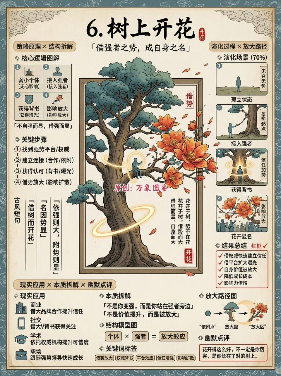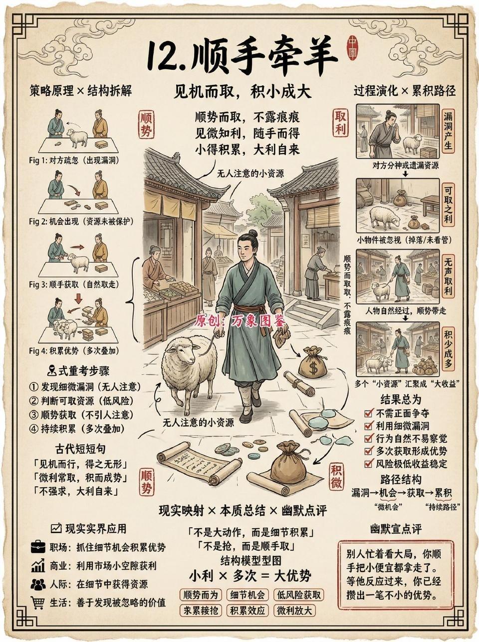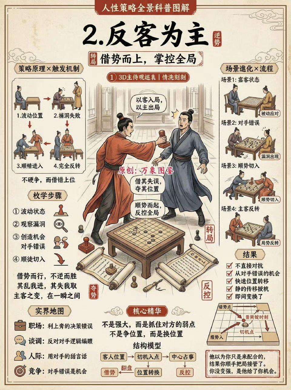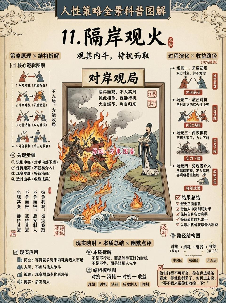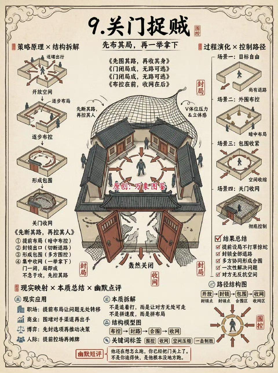 🔥吃透这 16 个顶级人性谋略,普通人也能逆风翻盘 如果你总觉得自己在人际、职场、生活里处处被动,被人拿捏、错失机会,那这 17 个源自《三十六计》的顶级人性策略,一定要反复研读。 这不是厚黑学,而是古人用千年智慧总结的「生存底层逻辑」: 1、想不费吹灰之力削弱对手?看推恩令,以恩为刀,削权无形 2、想从被动变主动掌控全局?学反客为主,借对手失误,顺势上位 3、想零成本放大影响力?用无中生有,造势成局,虚而化实 4、想借力打力保全自己?懂借刀杀人,不亲自出手,坐收渔利 5、想盘活资源快速起势?用借尸还魂,借旧之名,起新之势 6、想借强者之势快速成长?学树上开花,站在巨人肩膀,放大自己 7、想多线压力下破局?用远交近攻,联远制近,逐个击破 8、想让对手进退两难?学上屋抽梯,诱其入局,断其后路 9、想一次性解决问题?用关门捉贼,先布其局,再一举拿下 10、想让对手一步步走进圈套?学连环计,多计叠加,整体成局 11、想坐收渔翁之利?用隔岸观火,观其内斗,待机而取 12、想积小成大积累优势?学顺手牵羊,见机而取,不露痕迹 13、想以柔克刚掌控局面?用笑里藏刀,表面温和,内藏锋芒 14、想出其不意达成目标?学暗度陈仓,明修栈道,暗度陈仓 15、想危机时刻安全脱身?用金蝉脱壳,留形脱身,转危为安 16、想以小博大撬动高回报?学抛砖引玉,先舍小利,后得大利 每一个策略都拆解了底层逻辑、关键步骤和现实应用,从职场博弈、商业竞争,到人际相处、人生破局,全场景适用。 真正厉害的人,从不是靠蛮力硬拼,而是懂人性、用谋略,顺势而为。 收藏这篇,遇事翻一翻,少走 10 年弯路!