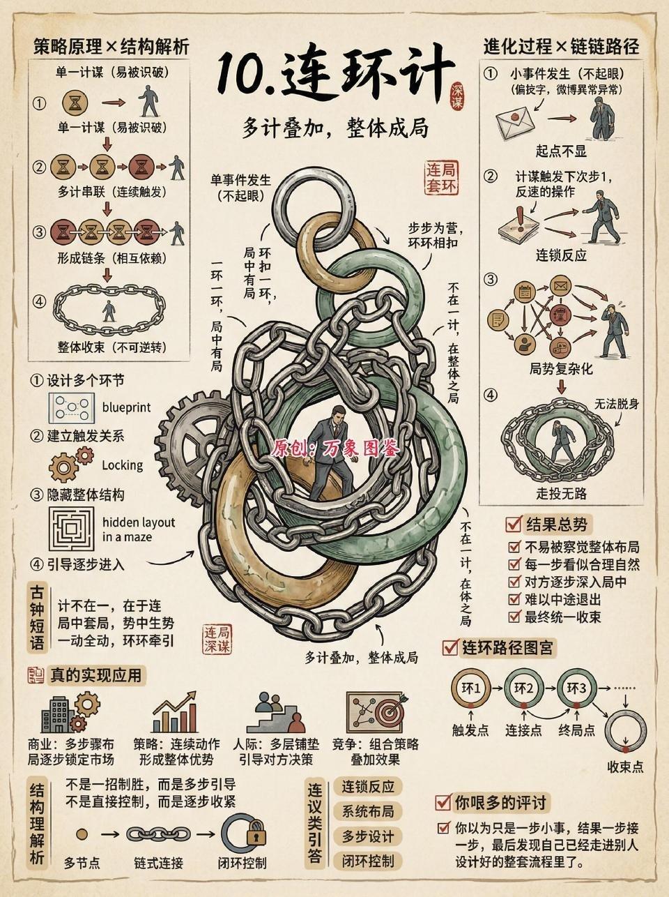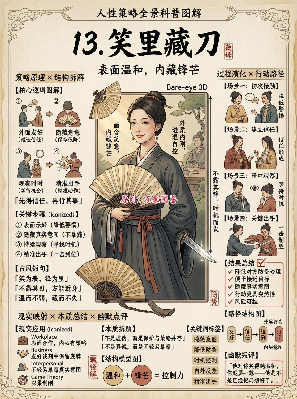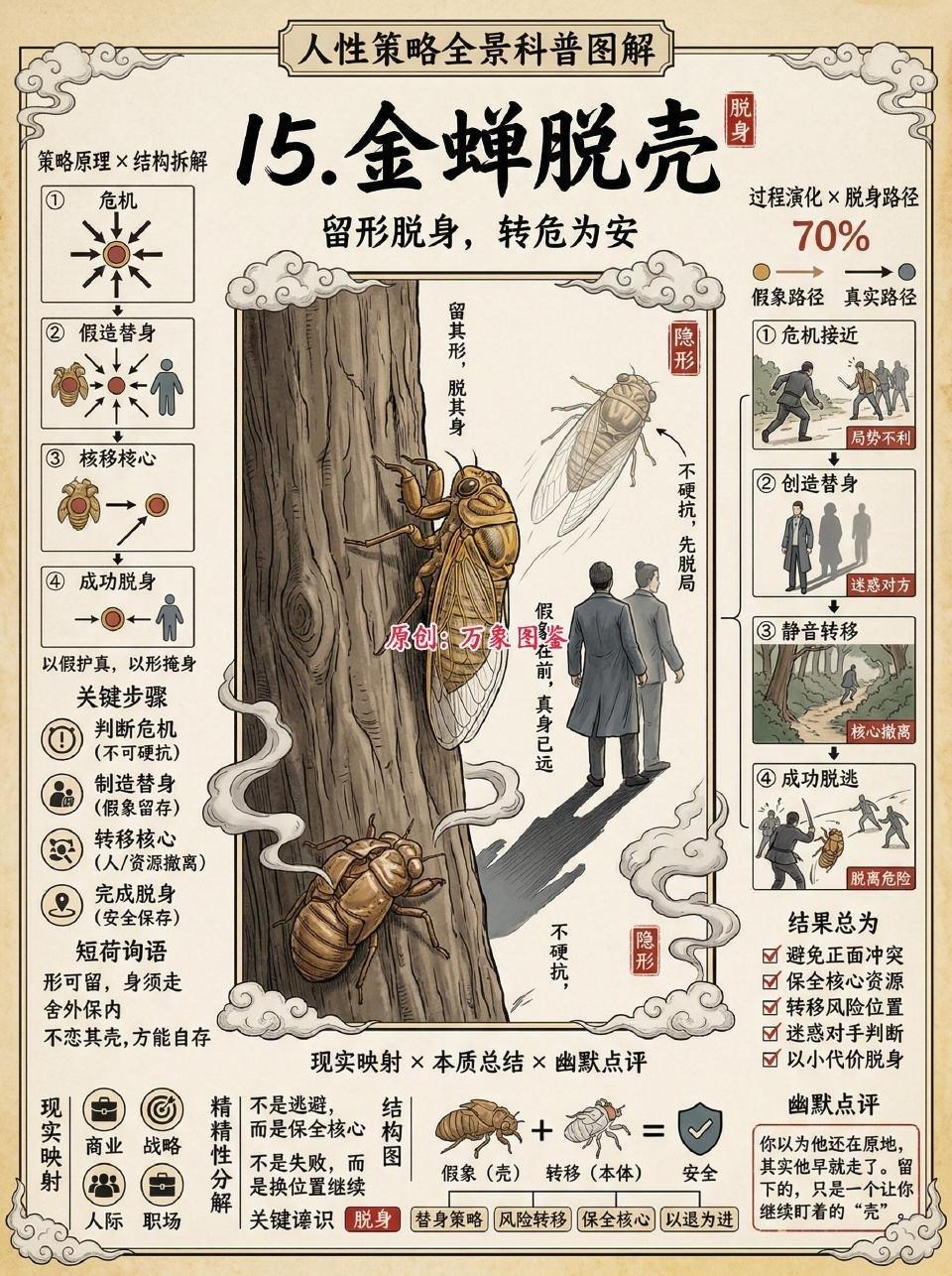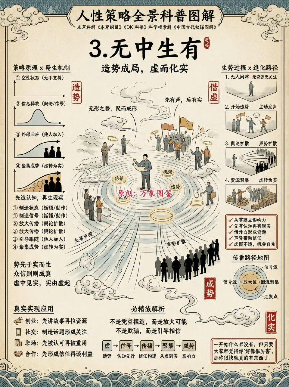 🔥吃透这 16 个顶级人性谋略,普通人也能逆风翻盘 如果你总觉得自己在人际、职场、生活里处处被动,被人拿捏、错失机会,那这 17 个源自《三十六计》的顶级人性策略,一定要反复研读。 这不是厚黑学,而是古人用千年智慧总结的「生存底层逻辑」: 1、想不费吹灰之力削弱对手?看推恩令,以恩为刀,削权无形 2、想从被动变主动掌控全局?学反客为主,借对手失误,顺势上位 3、想零成本放大影响力?用无中生有,造势成局,虚而化实 4、想借力打力保全自己?懂借刀杀人,不亲自出手,坐收渔利 5、想盘活资源快速起势?用借尸还魂,借旧之名,起新之势 6、想借强者之势快速成长?学树上开花,站在巨人肩膀,放大自己 7、想多线压力下破局?用远交近攻,联远制近,逐个击破 8、想让对手进退两难?学上屋抽梯,诱其入局,断其后路 9、想一次性解决问题?用关门捉贼,先布其局,再一举拿下 10、想让对手一步步走进圈套?学连环计,多计叠加,整体成局 11、想坐收渔翁之利?用隔岸观火,观其内斗,待机而取 12、想积小成大积累优势?学顺手牵羊,见机而取,不露痕迹 13、想以柔克刚掌控局面?用笑里藏刀,表面温和,内藏锋芒 14、想出其不意达成目标?学暗度陈仓,明修栈道,暗度陈仓 15、想危机时刻安全脱身?用金蝉脱壳,留形脱身,转危为安 16、想以小博大撬动高回报?学抛砖引玉,先舍小利,后得大利 每一个策略都拆解了底层逻辑、关键步骤和现实应用,从职场博弈、商业竞争,到人际相处、人生破局,全场景适用。 真正厉害的人,从不是靠蛮力硬拼,而是懂人性、用谋略,顺势而为。 收藏这篇,遇事翻一翻,少走 10 年弯路!