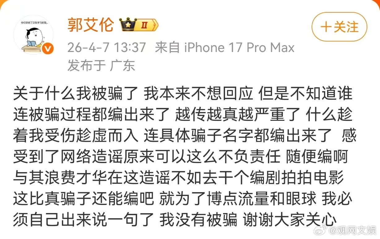 郭艾伦否认被骗近日,网传郭艾伦遭熟人“投资入股”诱导,被诈骗转账近千万。4月7日,发文辟谣,称感受到了网络造谣原来可以这么不负责任,随便编啊,这比真骗子还能编吧。最后强调“我没有被骗,谢谢大家关心”。