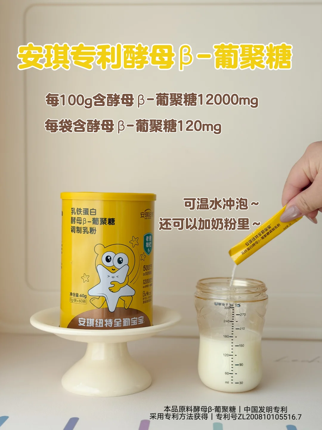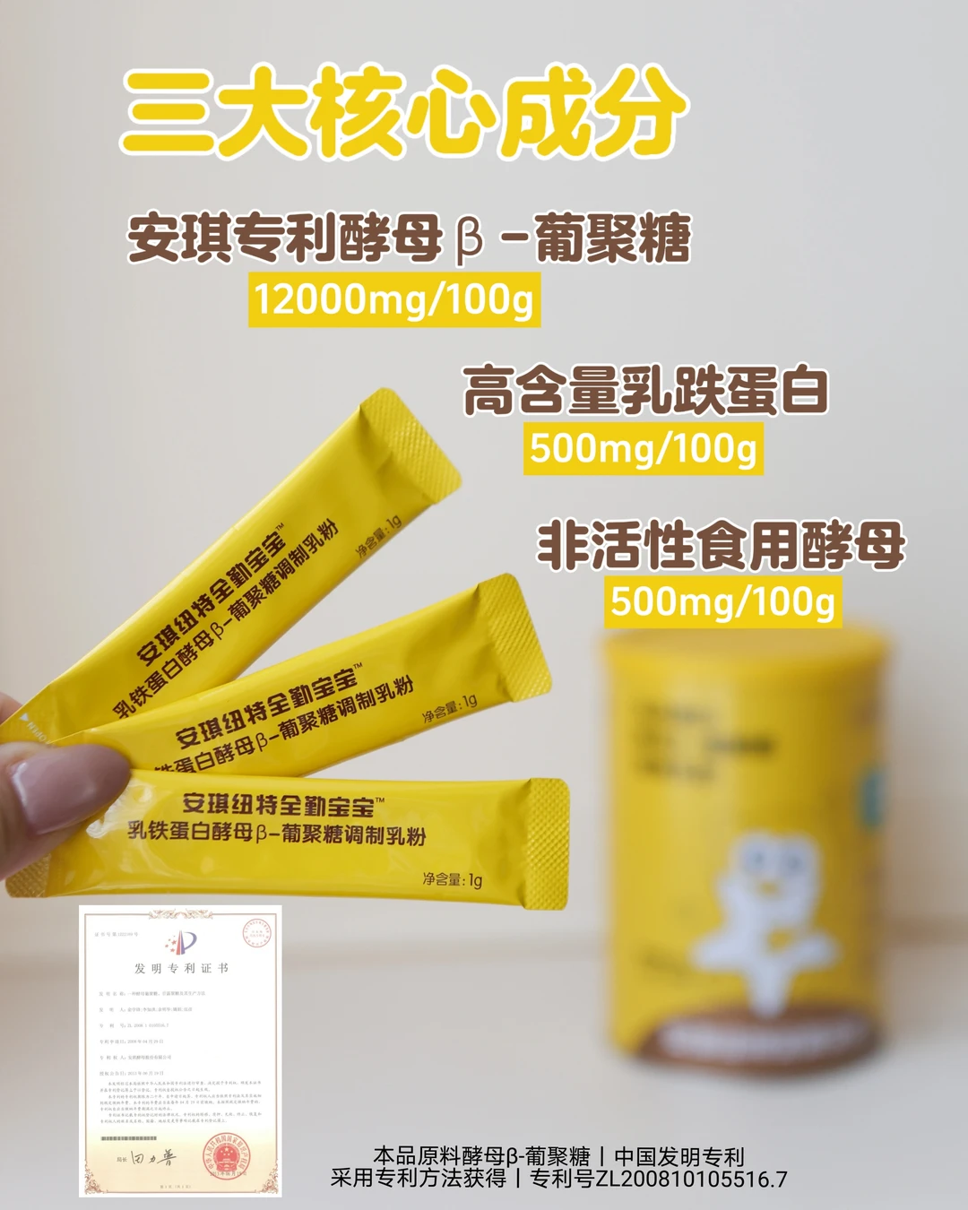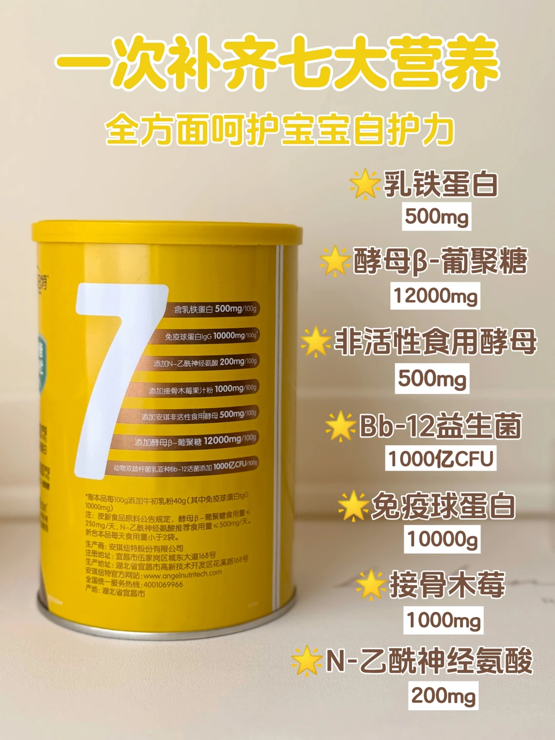 ✅它里面的酵母β-葡聚糖是安琪的专利成分每100g有12000mg,乳铁蛋白也有500mg,含量也是杠杠给力👍,另外,它里面还有食用非活性酵母,相当于加强版益生菌,对肠道特别友好。再搭配上Bb-12益生菌、接骨木莓这些,一共7重自护力成分协同发力。