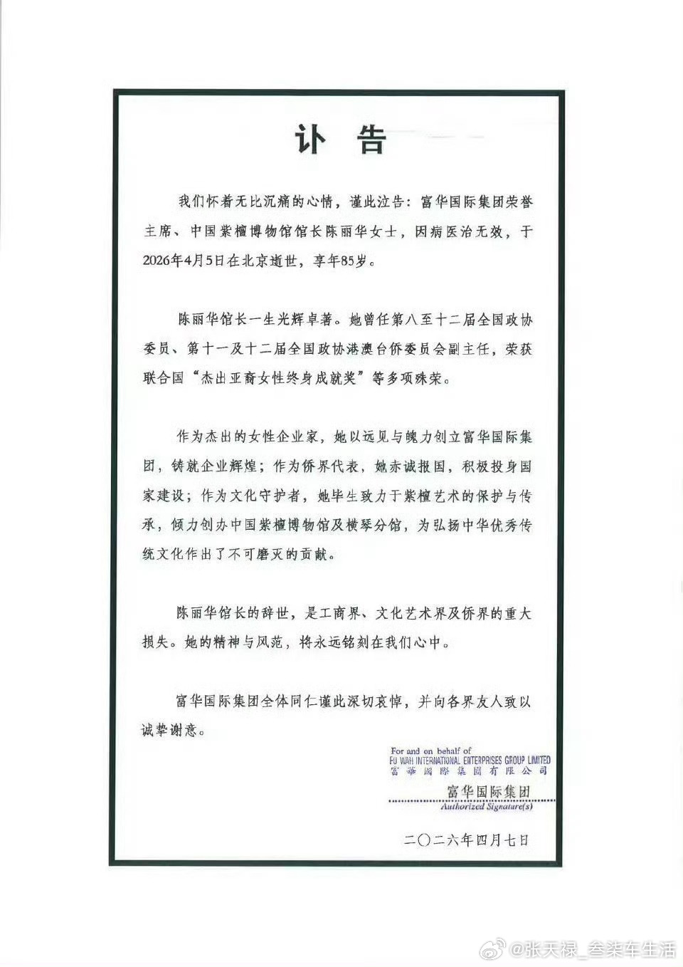 一代传奇女企业家陈丽华,走了!官方讣告已发,字字沉重。2026年4月5日20