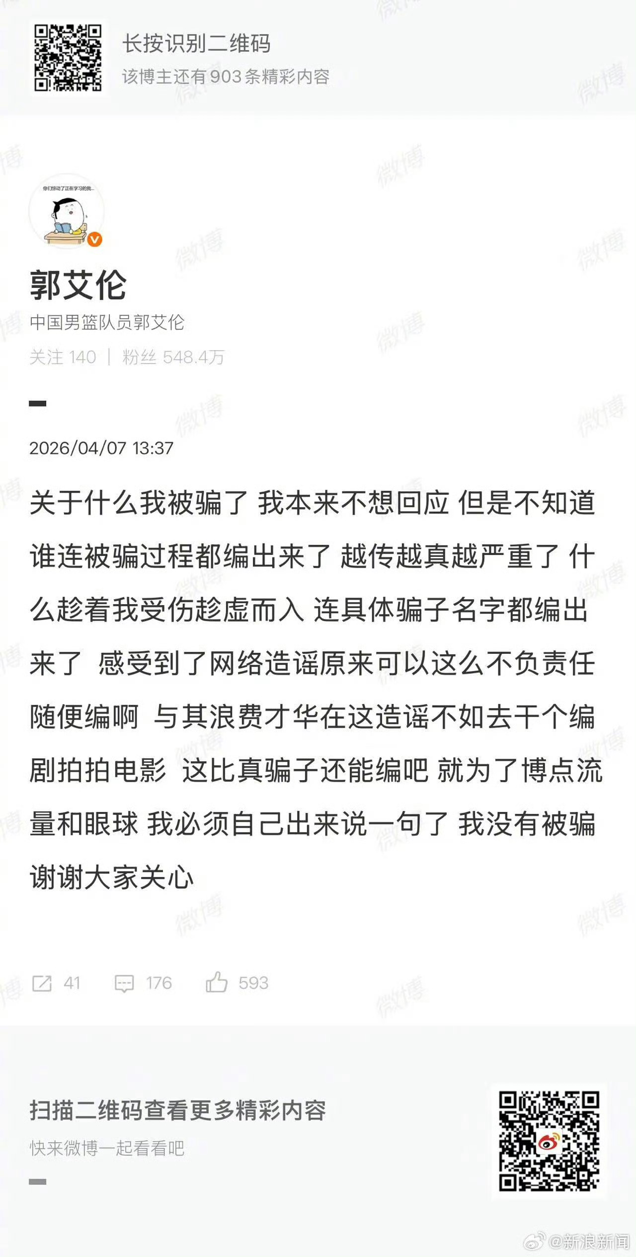 郭艾伦否认被骗啊?昨天热搜挂了大半天呢,那是新闻媒体造谣传谣吗……