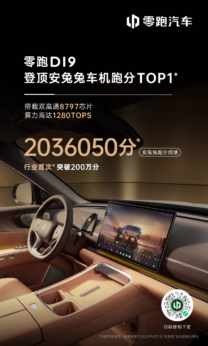 零跑D19搭载双8797,安兔兔跑分成绩突破200万
