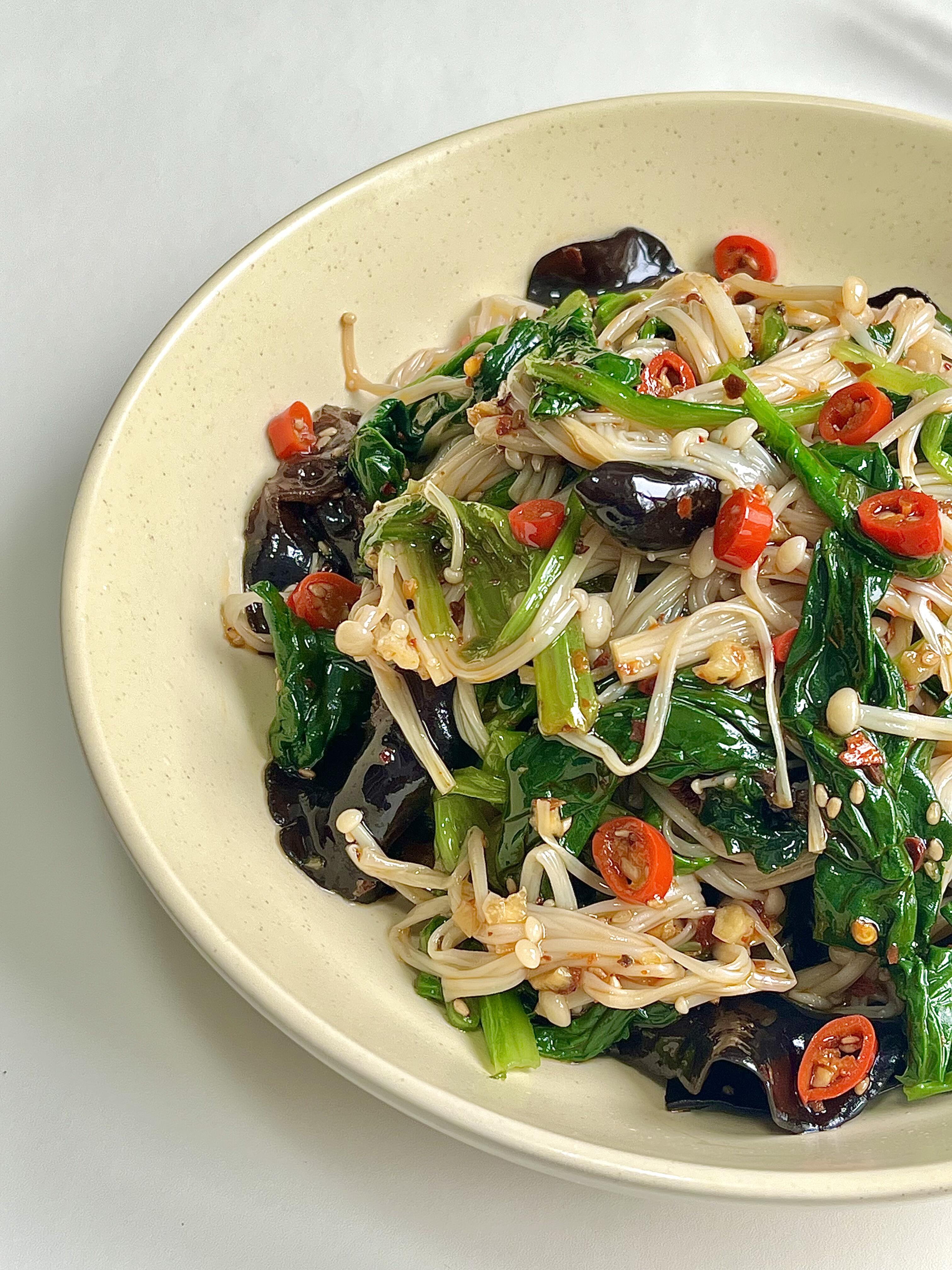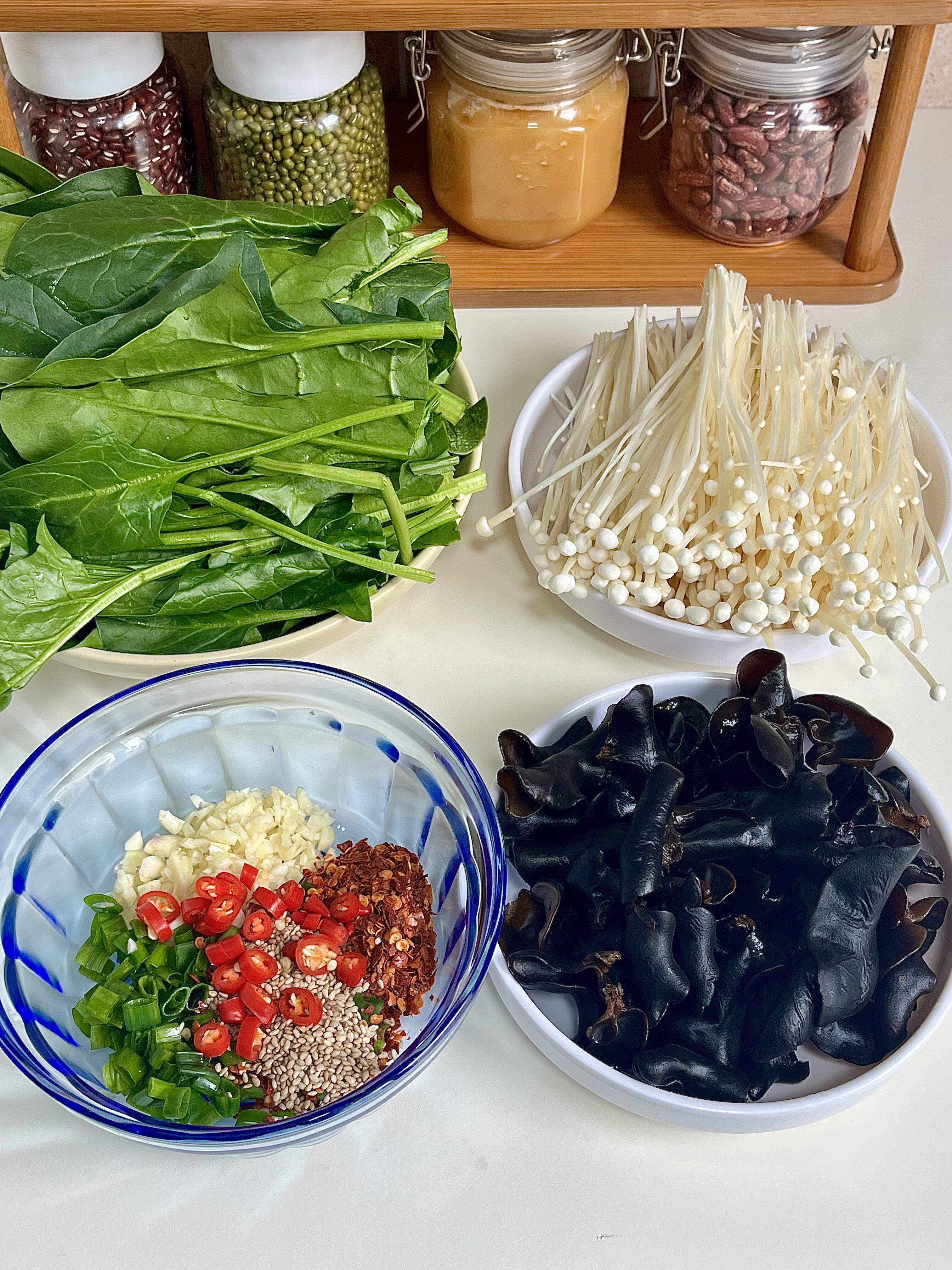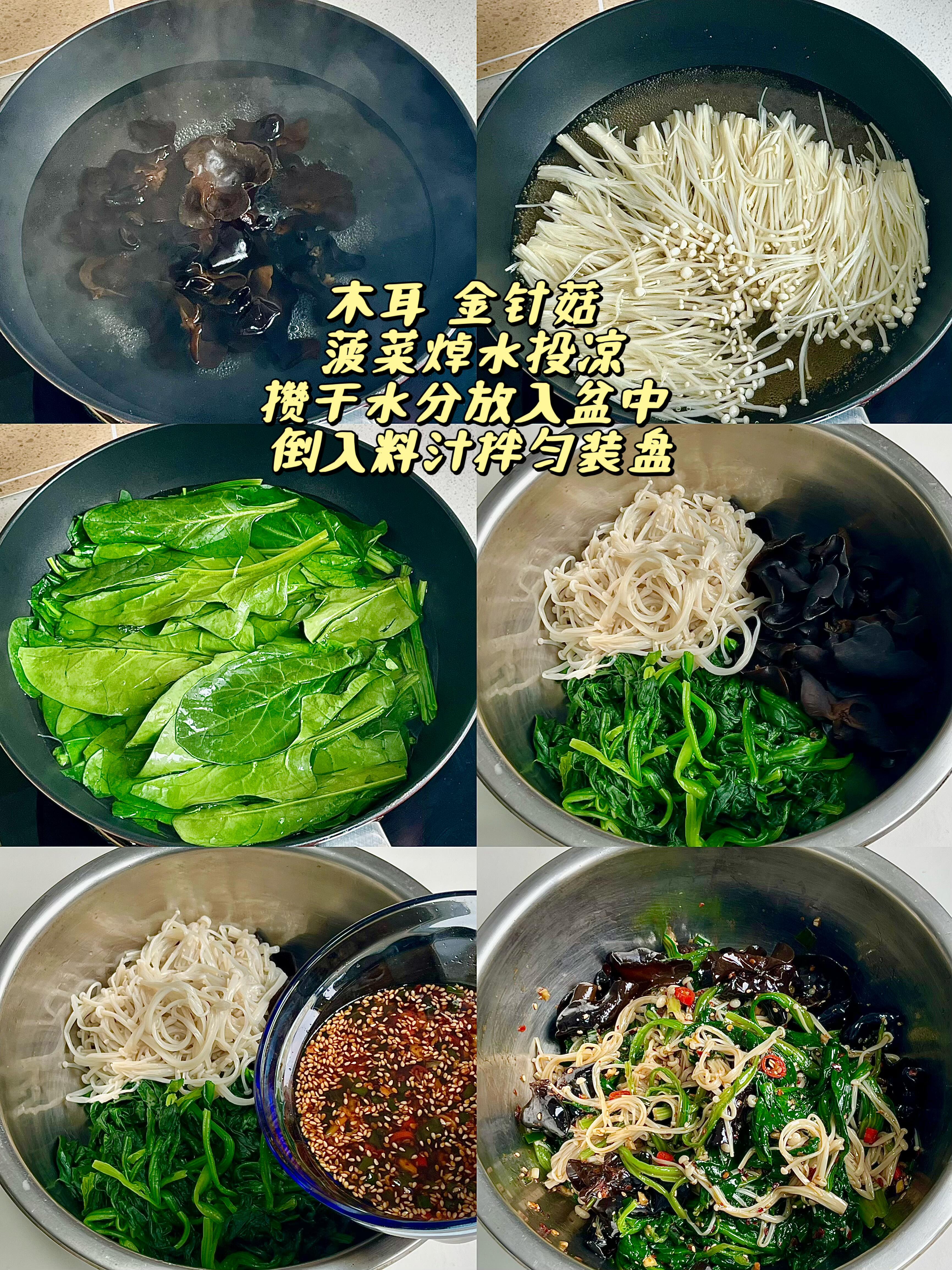 菠菜木耳拌金针菇,鲜脆清爽可口 菠菜软嫩、金针菇顺滑、木耳爽脆,简单一拌就鲜香入味。清爽不腻,开胃又下饭,家常快速小凉菜,吃着舒服又暖心,一口下去满是清爽滋味~ 👨🍳步骤: 1)菠菜去根洗净,金针菇去根撕散,木耳提前泡好 2)葱花蒜末辣椒面,小米辣熟芝麻用热油炸香,加半勺鸡精、半勺盐、一勺糖、两勺生抽、两勺香醋、一勺蚝油调匀 3)木耳金针菇菠菜焯水投凉,攒干水分菠菜切两刀放入盆中,倒入料汁拌匀装盘