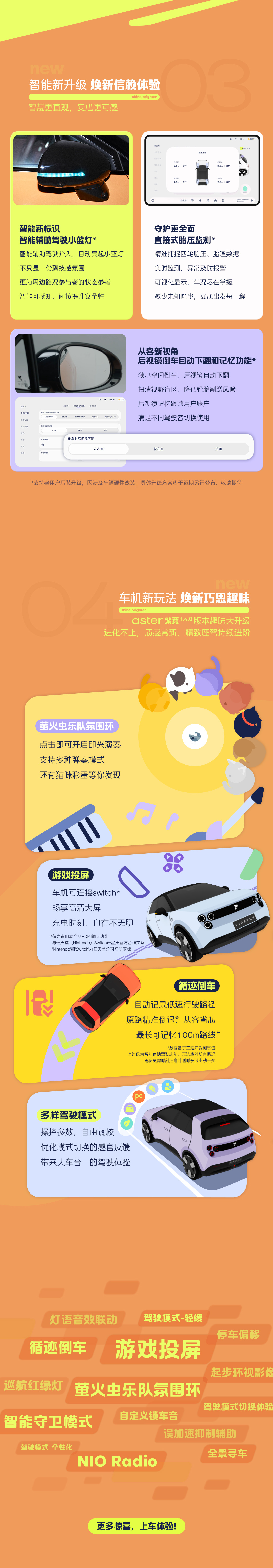 作为萤火虫车主,这次的焕新内容我必须来给大家划个重点:⭐️神仙颜值,一眼心动这次新增了超级吸睛的“美拉德”车色 !之前拍过游牧美拉德的经历,一直对这种色调情有独钟,这次官方源自波尔图老城区橘红色砖瓦的色彩灵感实在太对味了 。再配上回旋条幅设计的全新星轨双色合金轮圈,以及极具个性的斑点灰或精致纯粹的磨砂黑下包围,出街自带锋芒 。⭐️ 硬件拉满,动力进阶电机峰值功率直接提升至120kW,Sport模式下零百加速只要7.9秒,驾控更从容 !而且5月中旬全体车主都能通过OTA免费推送解锁进阶动力,这波必须夸 !同时还贴心新增了直接式胎压监测、两侧后视镜倒车自动下翻及位置记忆,以及智能辅助驾驶小蓝灯,细节控一本满足 。⭐️ 系统进化,体验跃升车机全面升级至 aster 紫菀 1.4.0 智能系统 。围绕智能座舱、智能伙伴lumo、智能辅助驾驶等四大板块,一口气新增与优化了近30项功能,日常出行交互更安心便捷 。