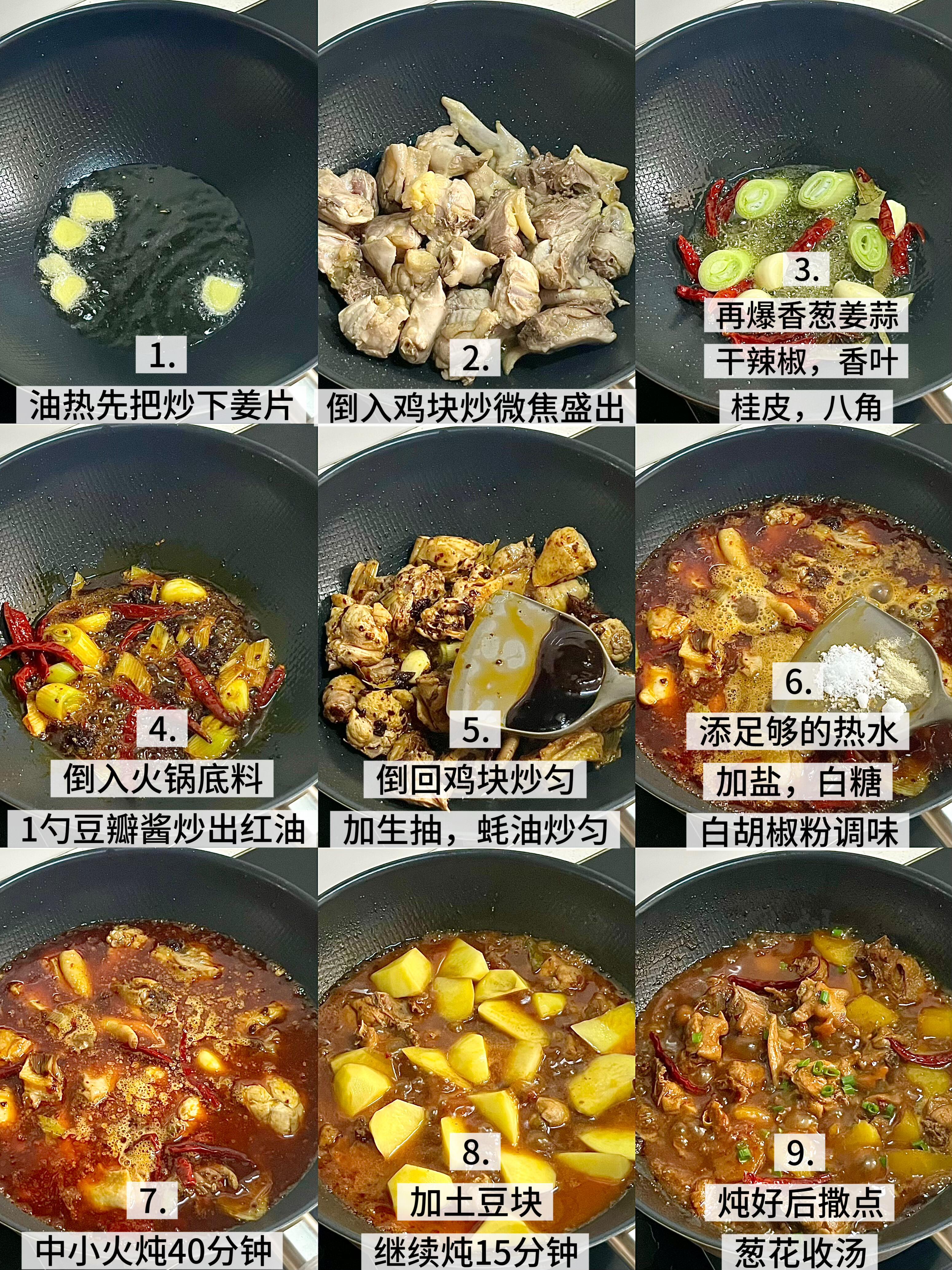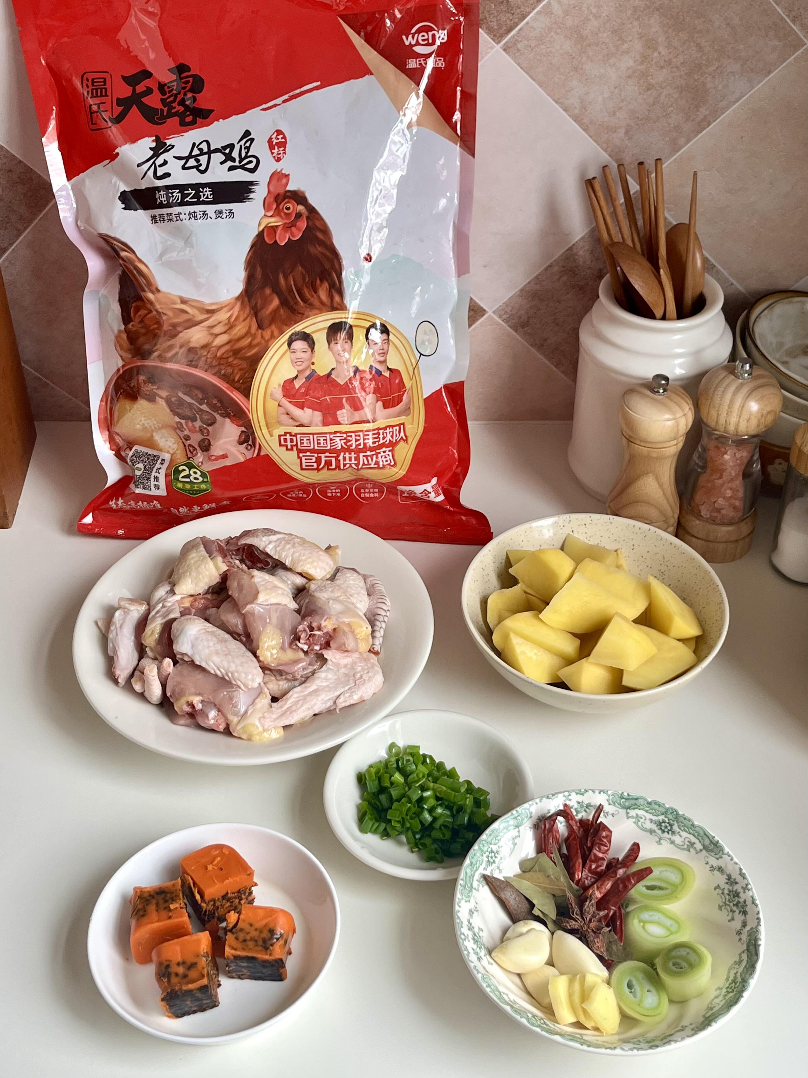 📝做法: 1)油热放入姜片爆香,倒入洗净的温氏老母鸡,炒至鸡肉微焦, 2)放大蒜、大葱、花椒、干辣椒、八角、桂皮、香叶炒出香味 3)加小块火锅底料+一勺豆瓣酱,炒出红油,放生抽、蚝油、白胡椒粉、白糖调味,倒一瓶啤酒+适量开水,加少许盐,盖盖焖煮40分钟 4)捞掉大料,放入土豆块再煮15分钟,大火收汁,撒上葱花就搞定啦!