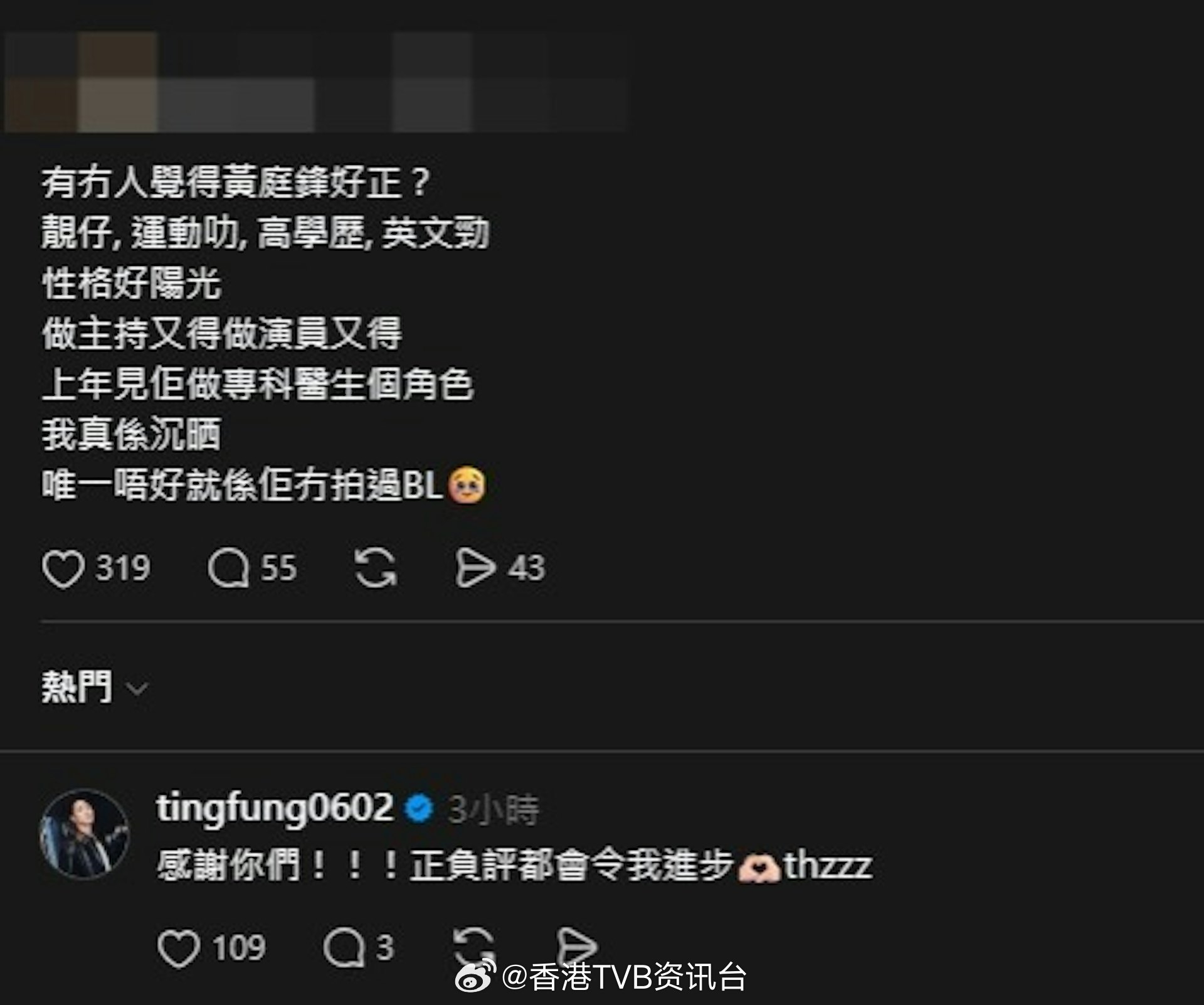 一连串评论更直接钓出黄庭锋本人留言回复:“感谢你们!!!正负评都会令我进步,thzzz。”整体而言,黄庭锋各方面条件都十分突出,但至今仍未大红,也让不少观众替他感到可惜。
