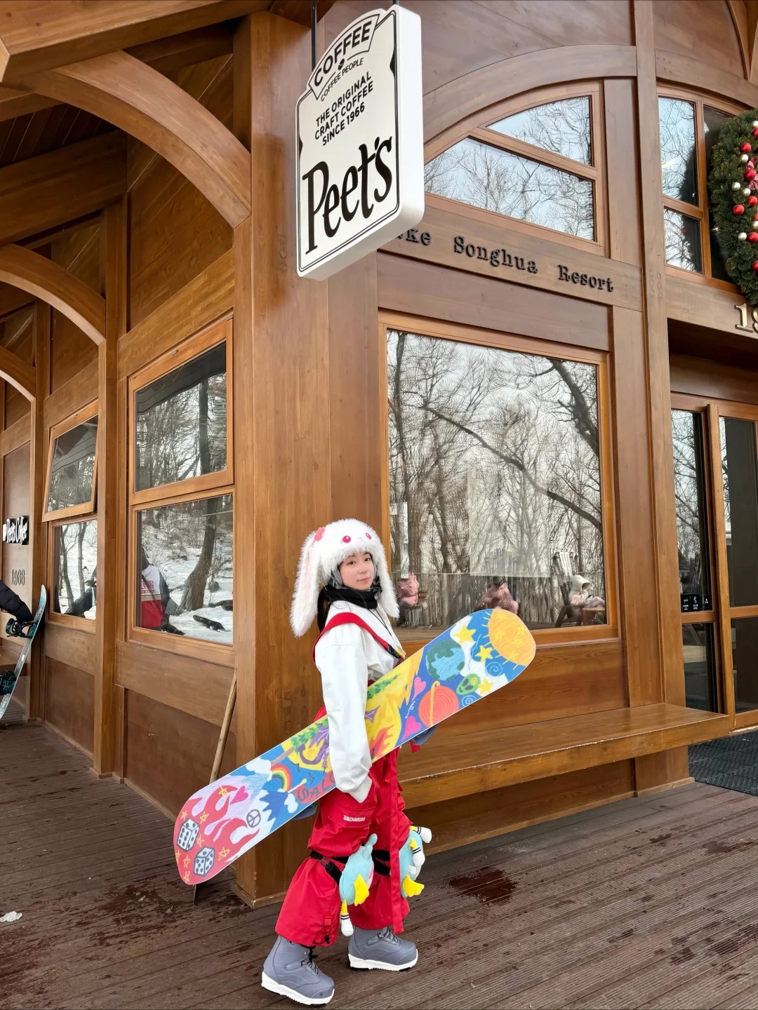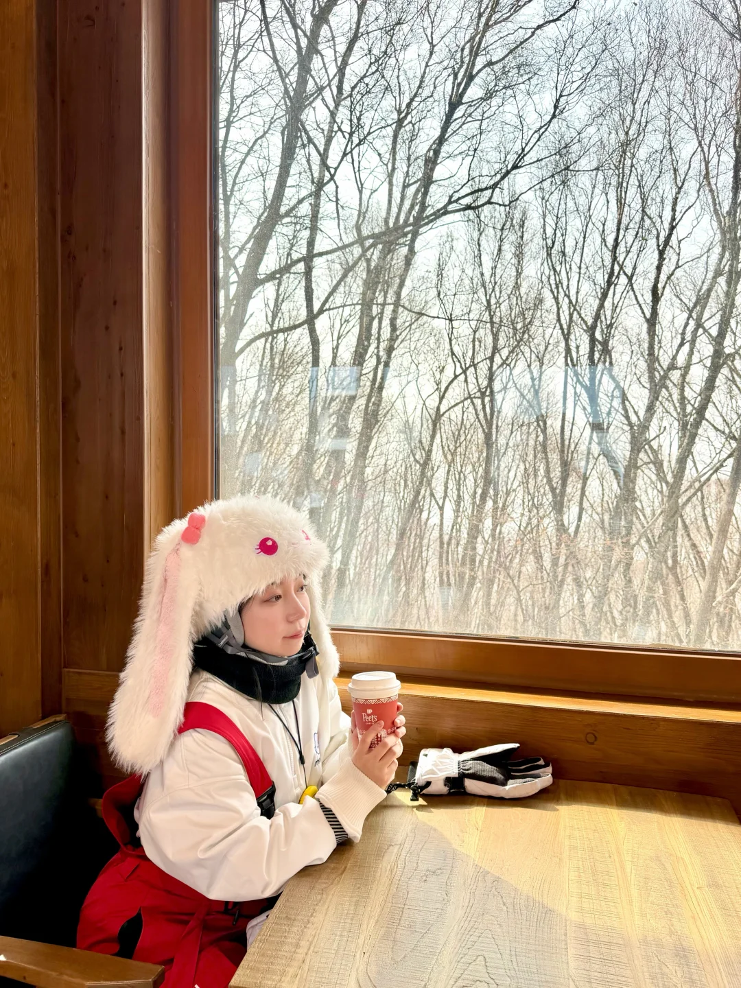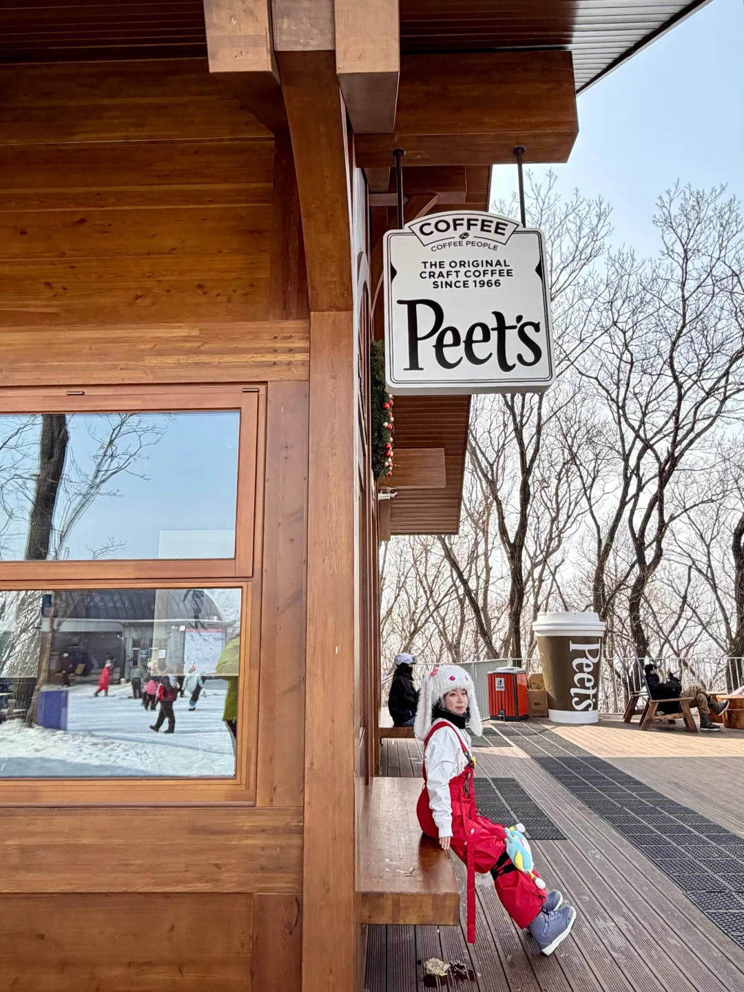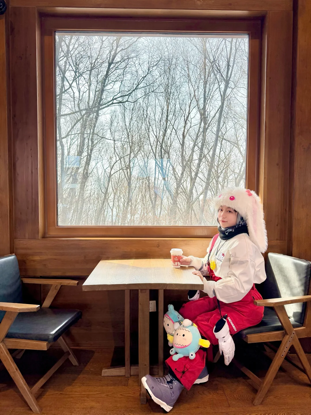 屋内窗边雪景、屋外木屋屋顶+logo墙都超好拍;午后暖光/日落绝配,手持热咖氛围感拉满~