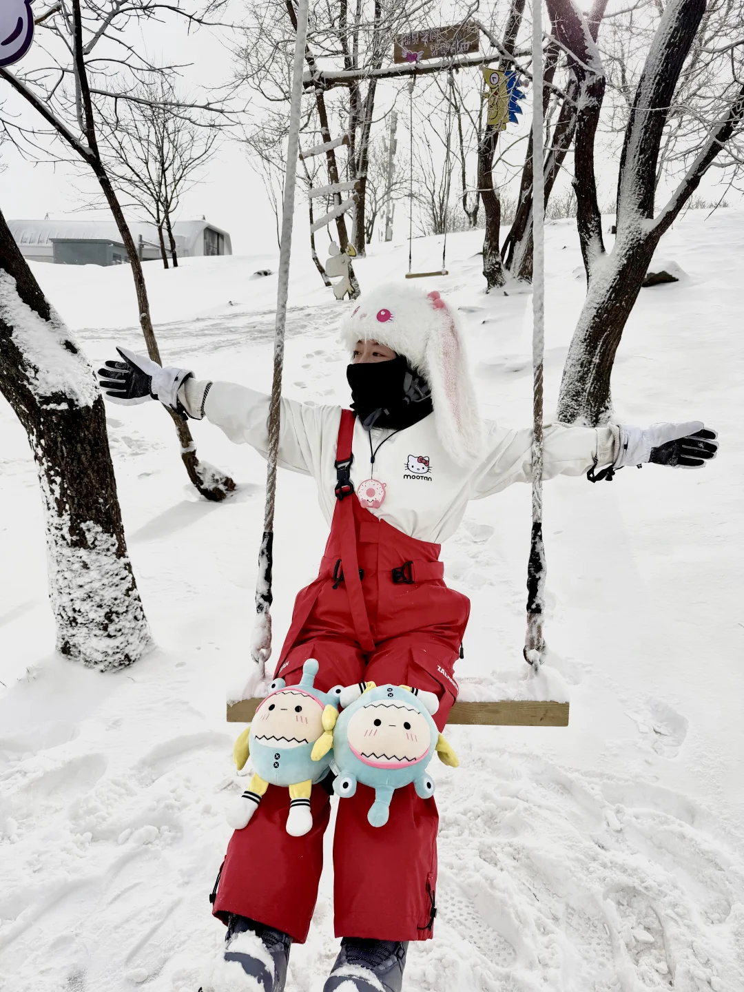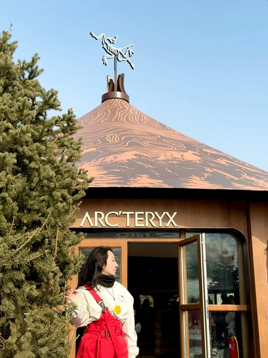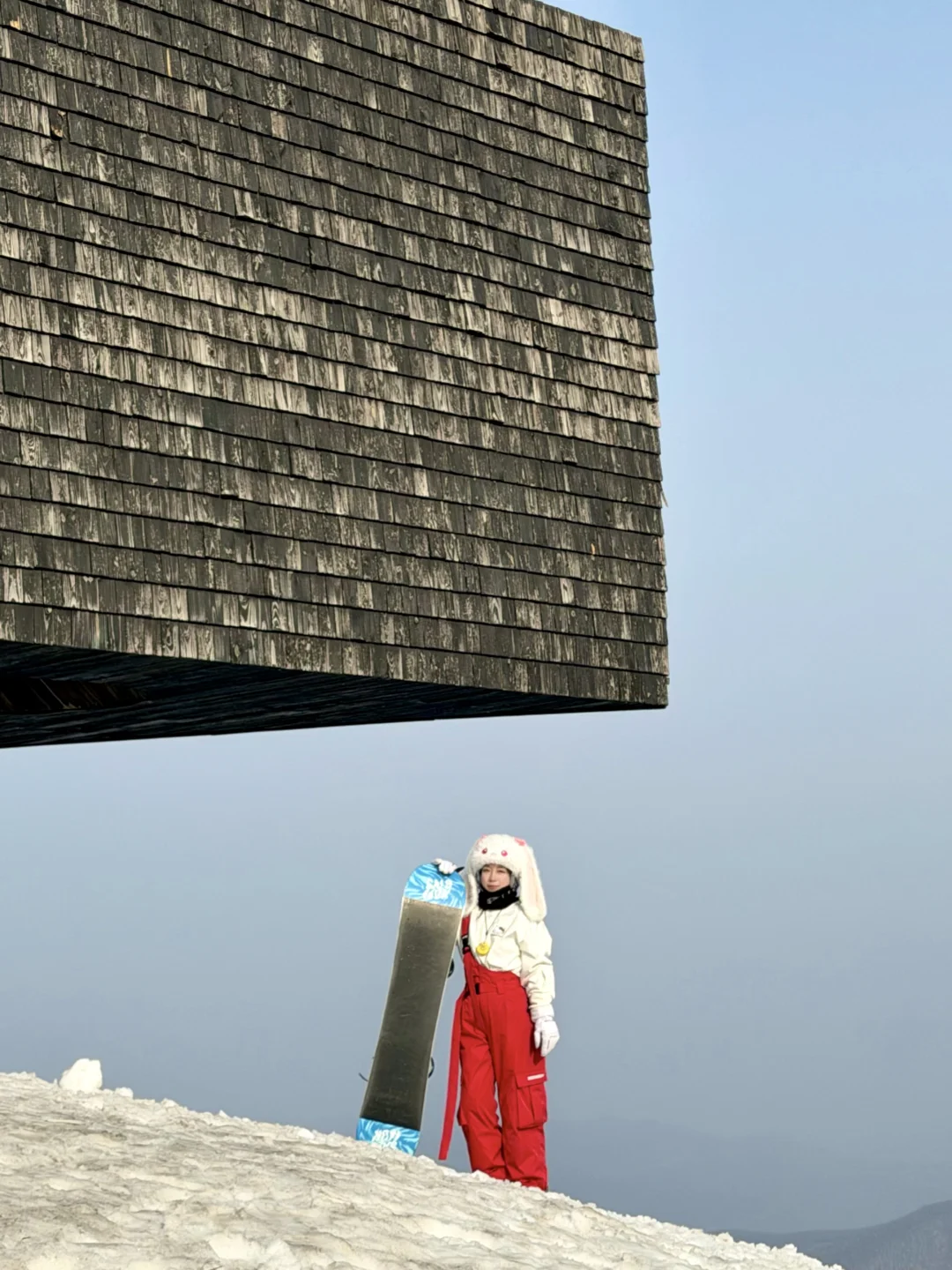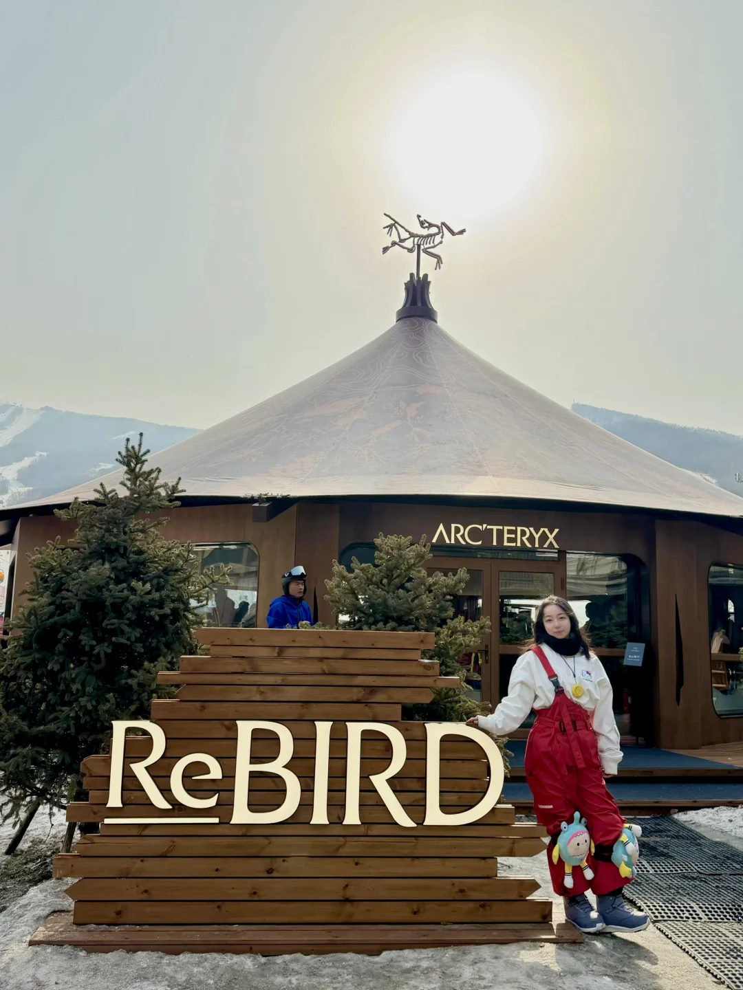 极简鸟标+雪场背景;白天自然光、夜间灯光氛围感强;机能风穿搭超酷~