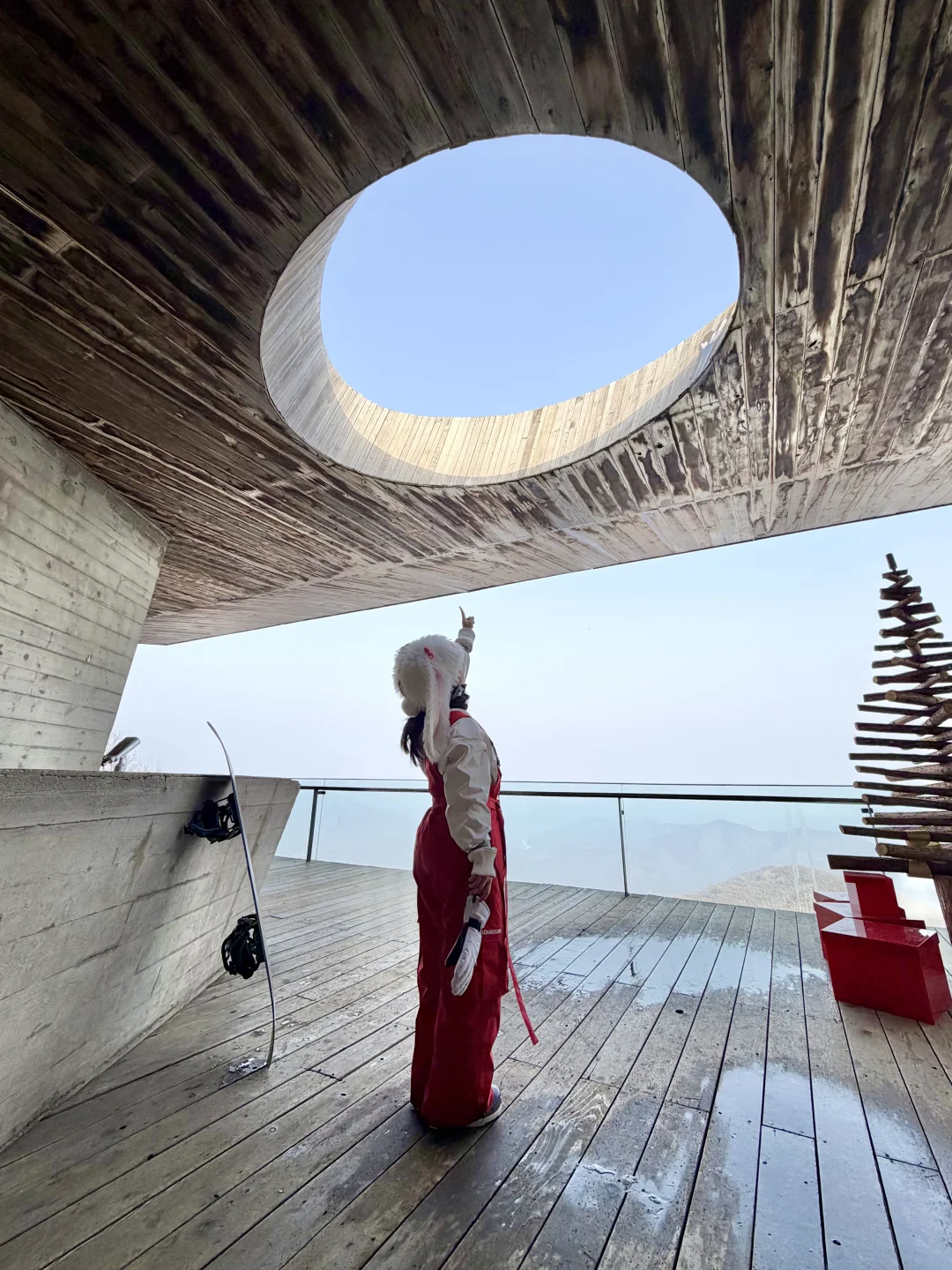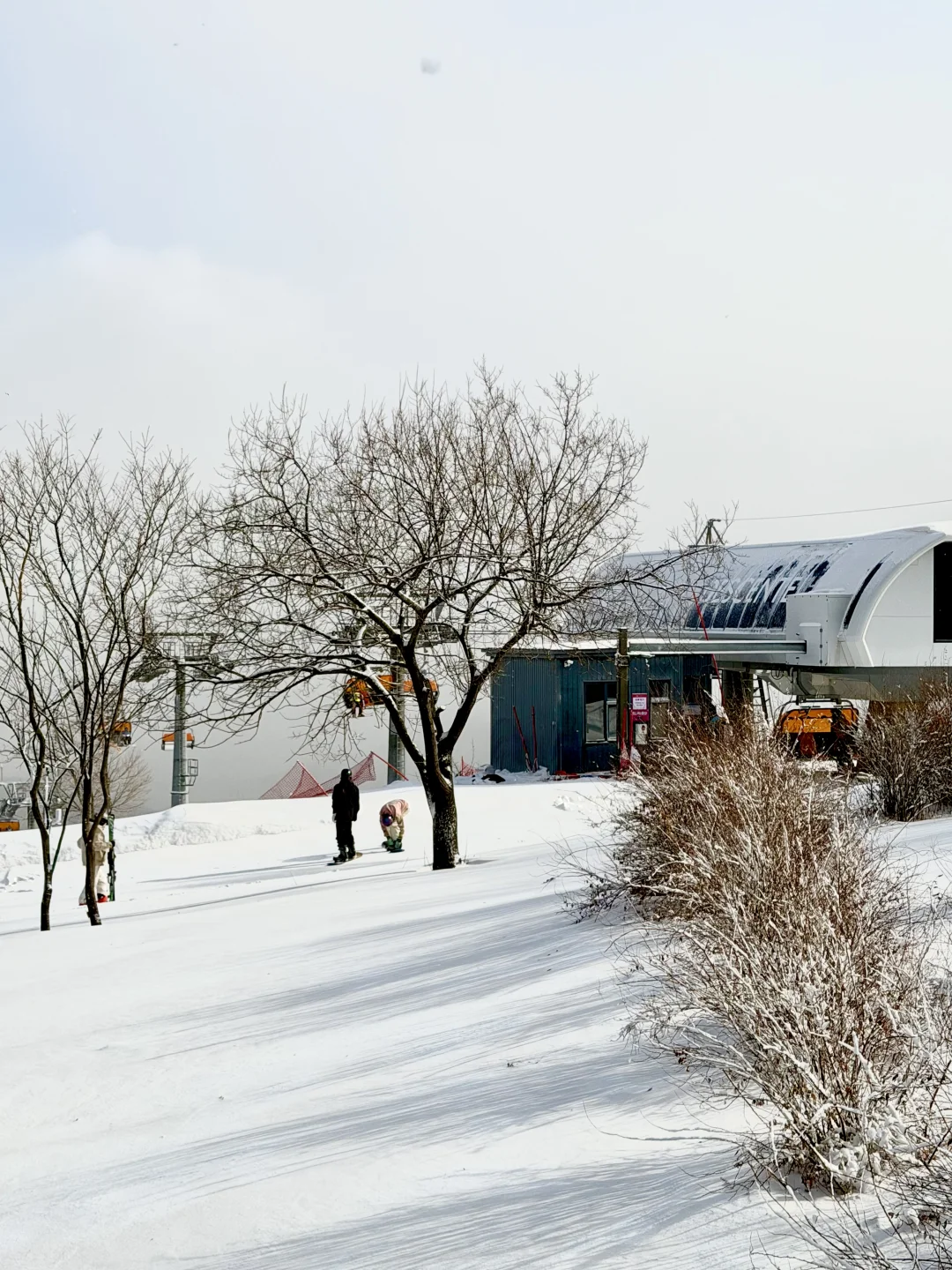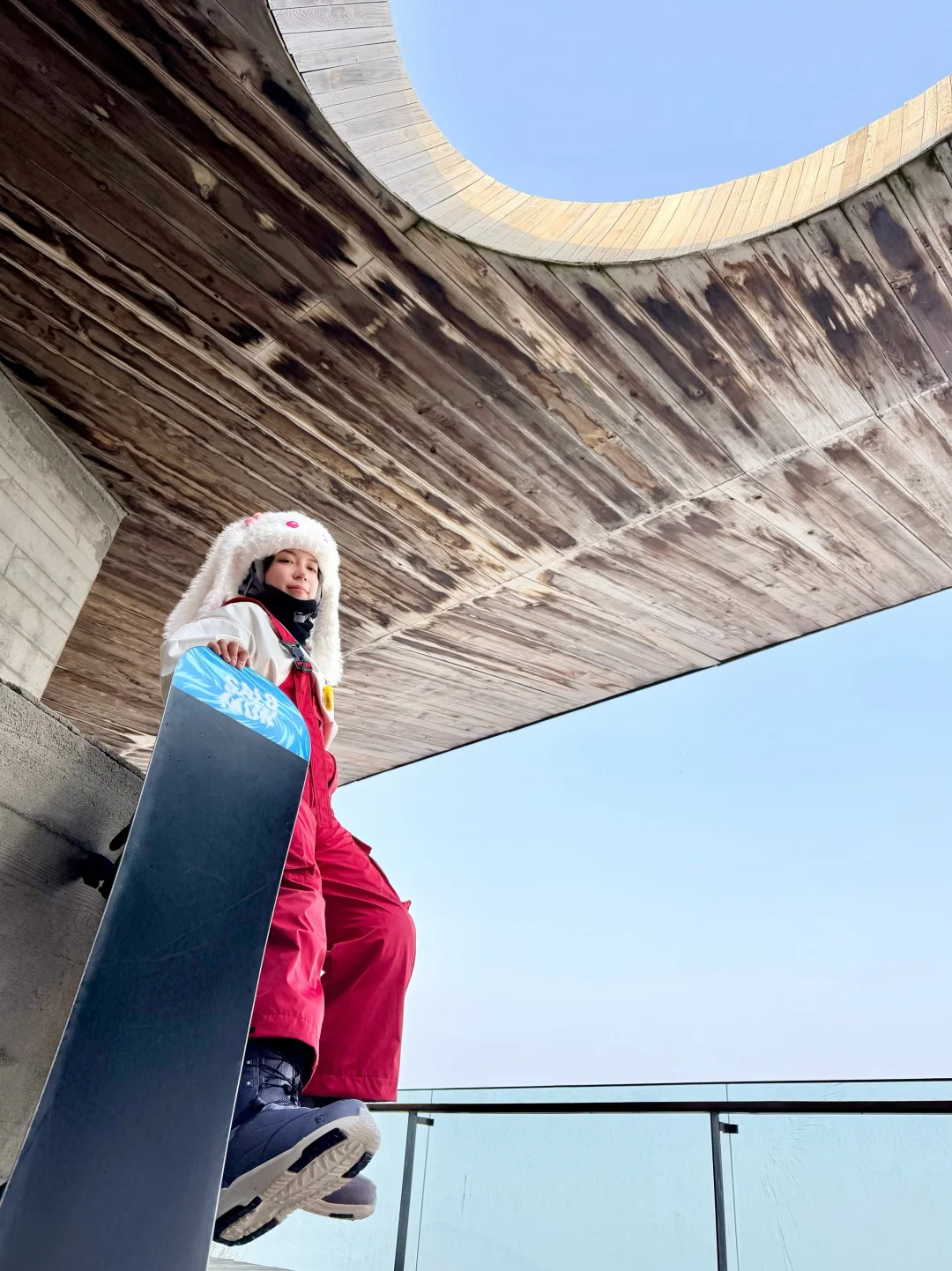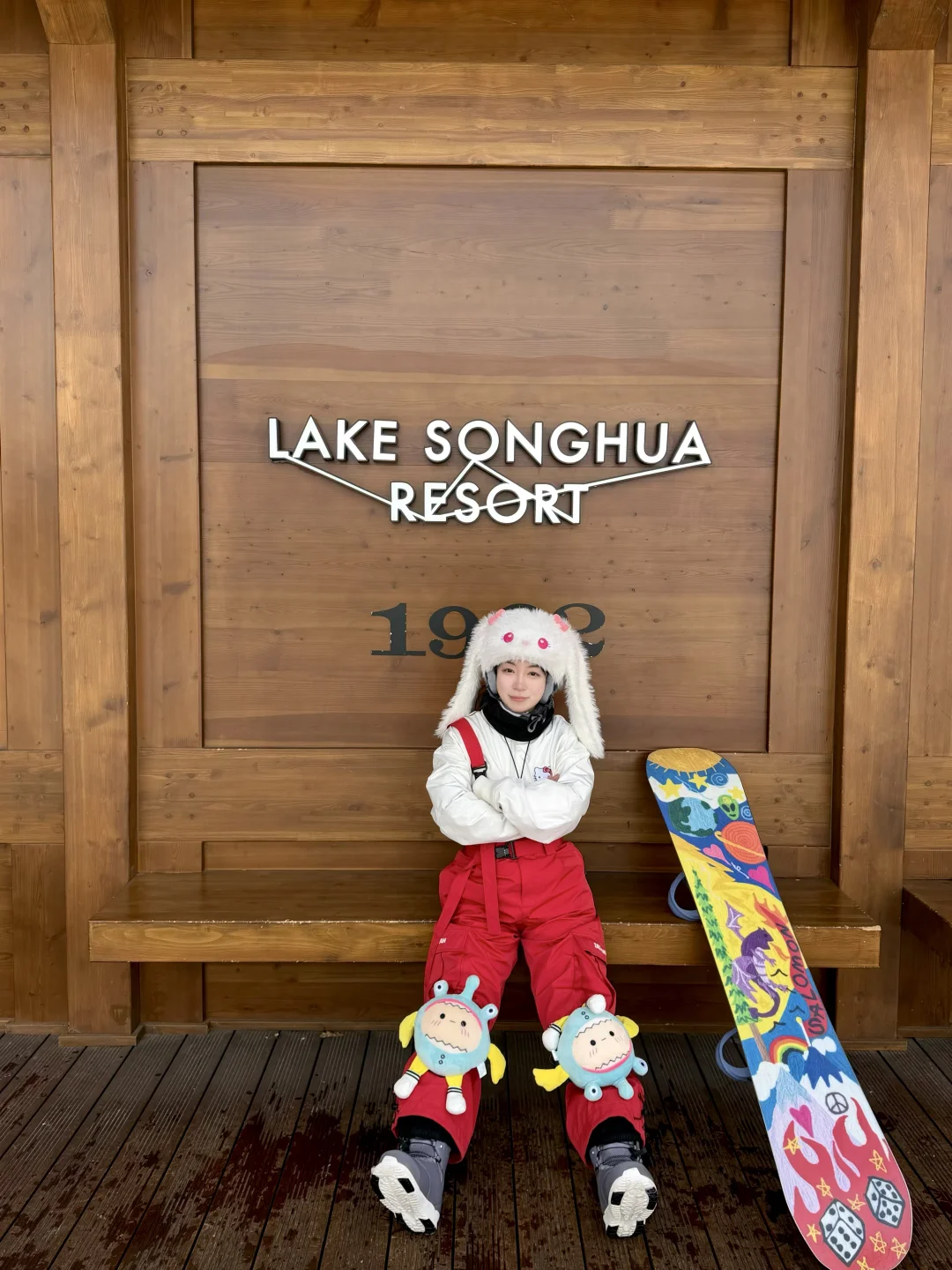 极简鸟标+雪场背景;白天自然光、夜间灯光氛围感强;机能风穿搭超酷~