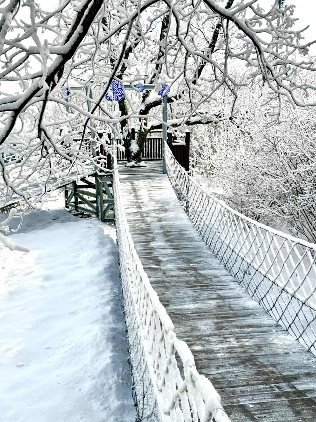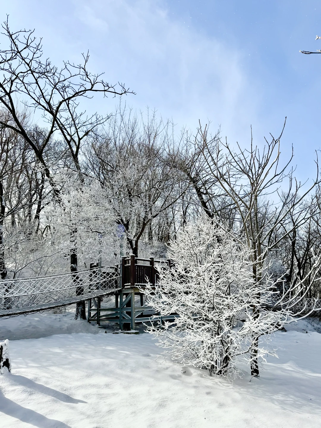 清晨9点前雾凇最饱满,搭配秋千、吊桥、冰瀑,童话感拉满,人少景绝超上镜~