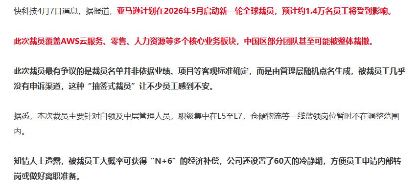 互联网消息指出,亚马逊计划在2026年5月启动新一轮裁员,预计波及14000名员