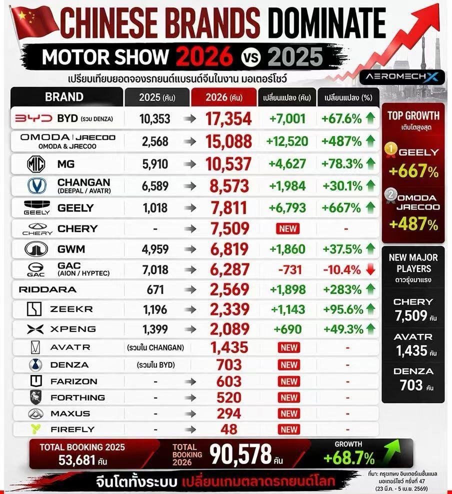 刚落幕的2026年曼谷国际车展,传来一个让全球汽车圈都不得不服的消息,中国品牌在