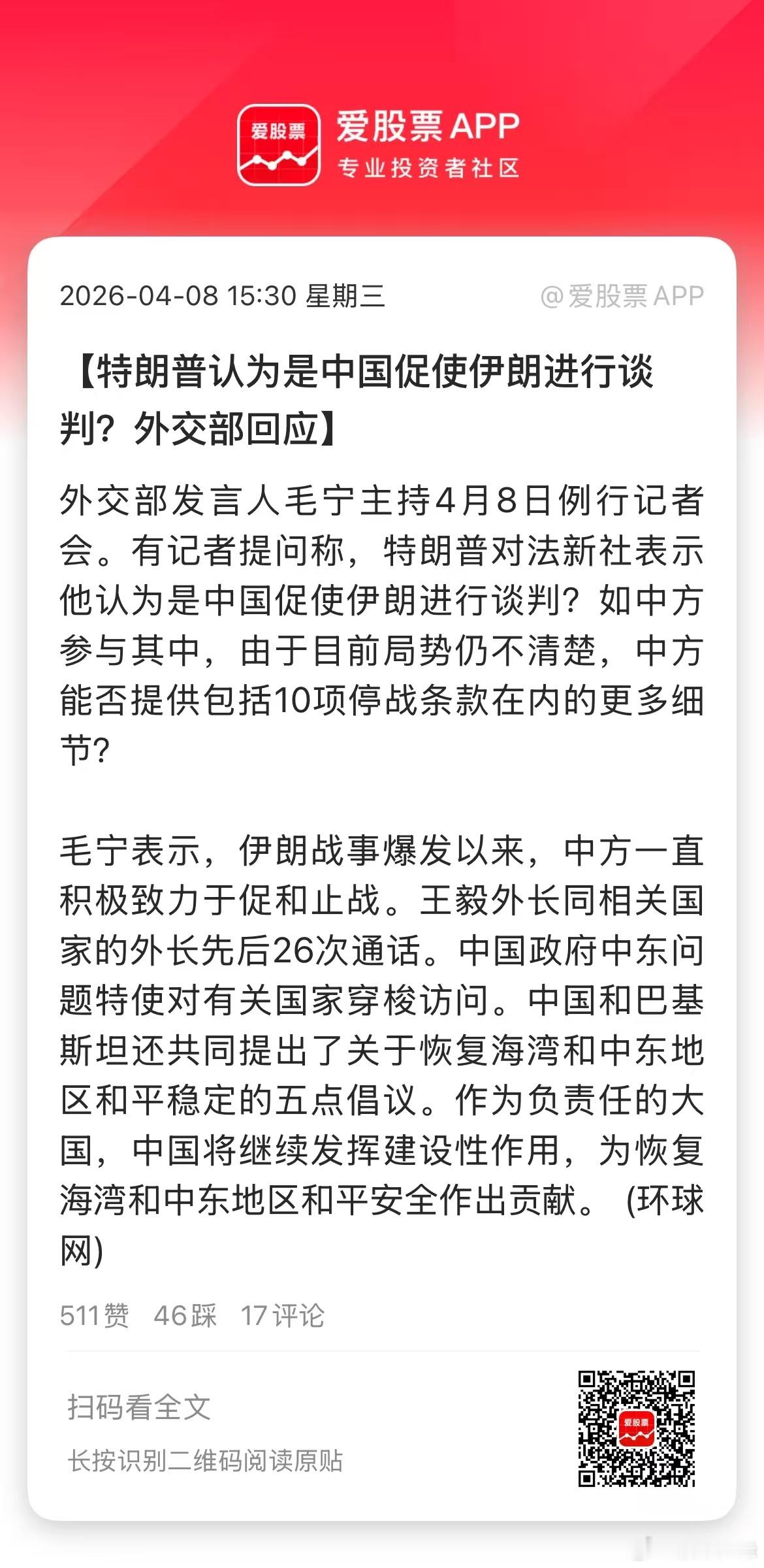 关于中方调解,特朗普证实+盘后外交部回应了。作为负责任的大国,咱们这次确实发挥了重大作用,作为投桃报李,川普这次访华应该对我们要更友好了吧。(爱股君)