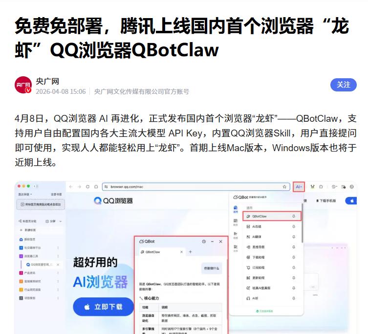 据报道,腾讯方面正式发布了国内首个浏览器“龙虾”——QBotClaw。