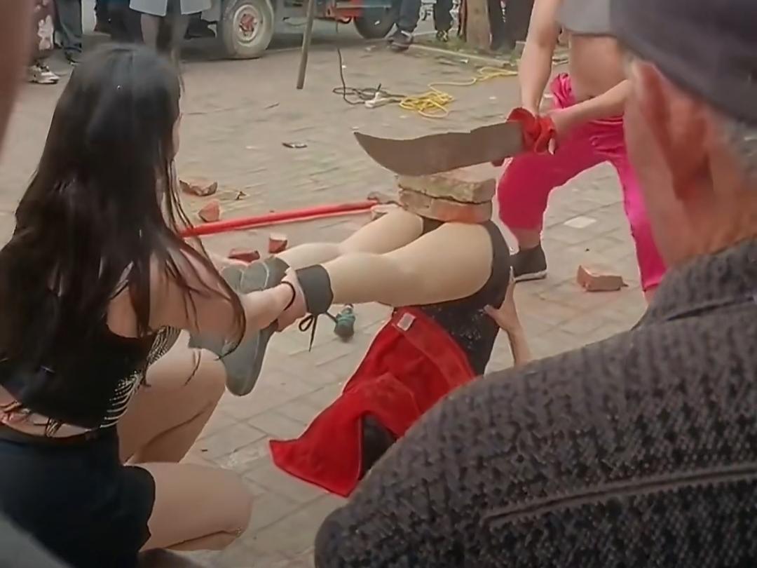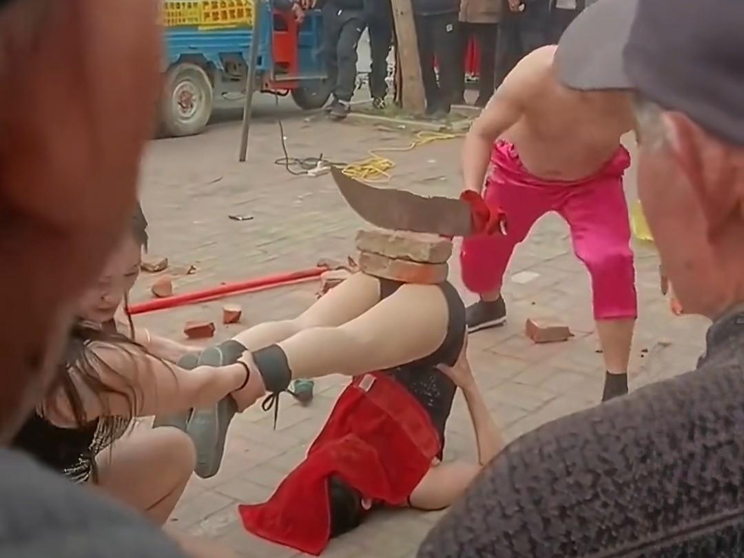只见一位女子用头撑地倒立,另外一名女子还帮忙扶着她的双腿,旁边站着一个光膀子的壮汉举着大砍刀,准备直接往砖头上砍!